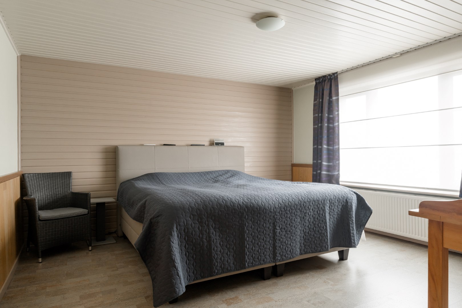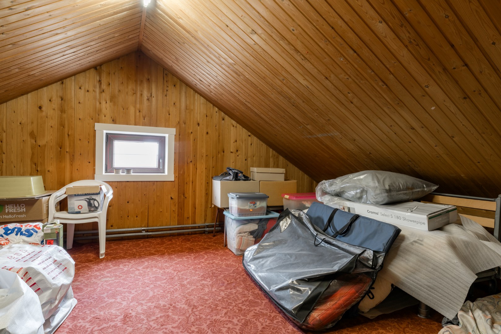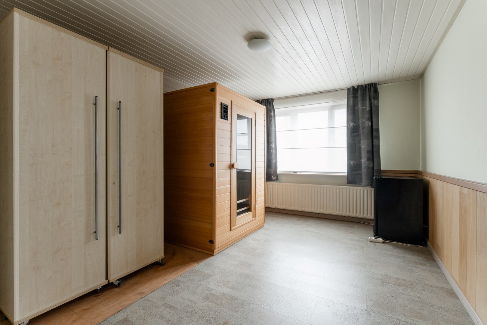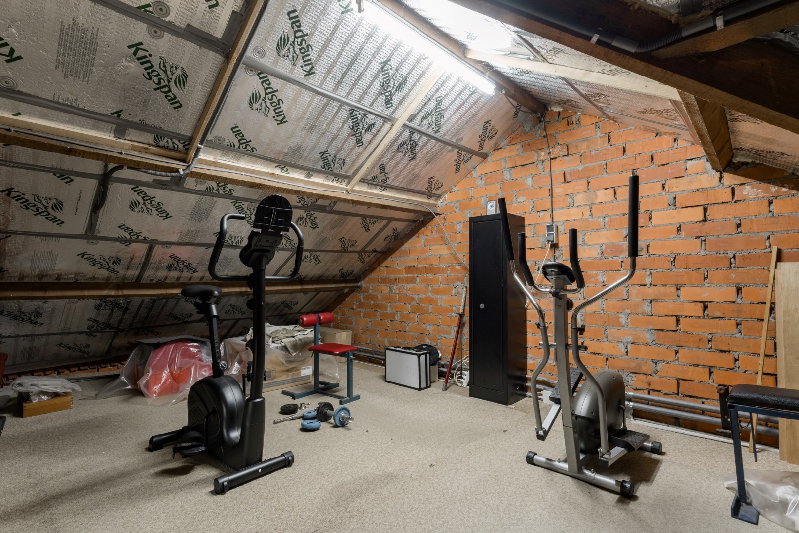 Vervolgens is er een vaste trap geplaatst naar het verdiep. Hier vinden we nog een slaapkamer terug, alsook een sportruimte en bergruimte.