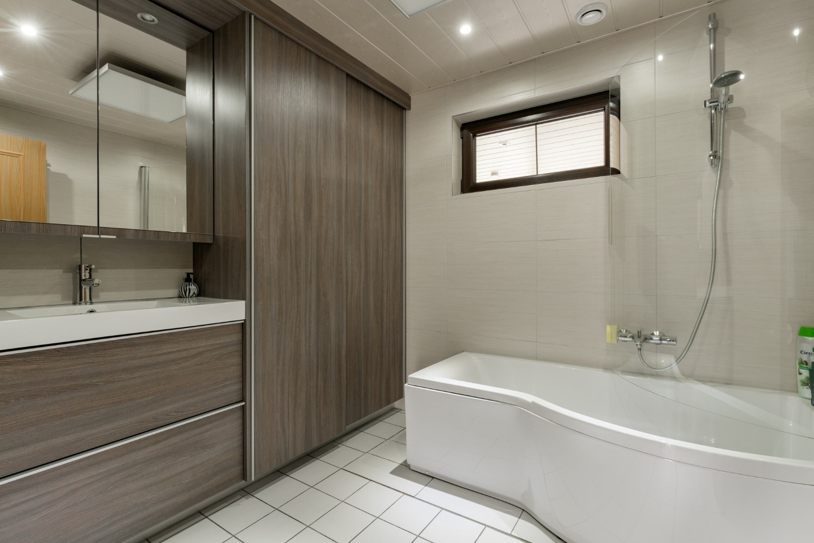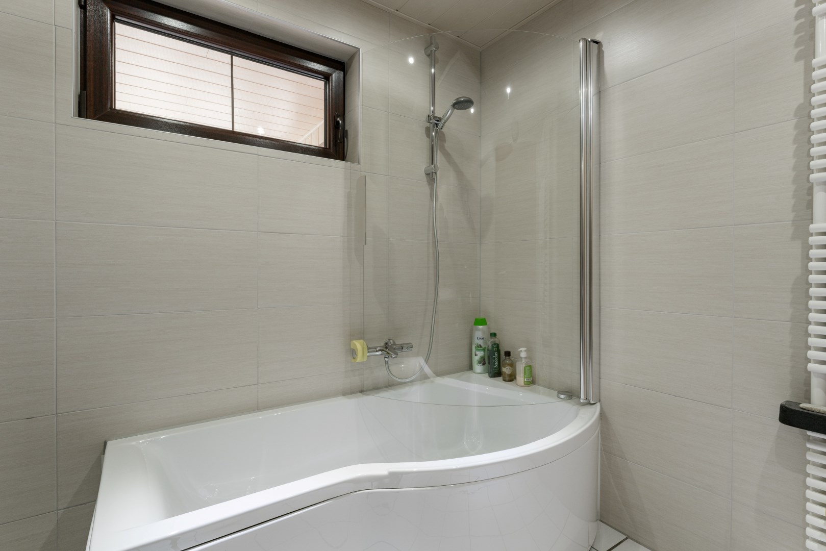Verder is er nog een apart toilet, netjes betegeld, alsook een gerenoveerde badkamer met bad en douche in een geheel. Deze badkamer wordt verwarmd met een infraroodpaneel. Ook vinden we op het gelijkvloers 3 slaapkamers terug, waarvan de kleinste volledig is ingericht als dressing.
