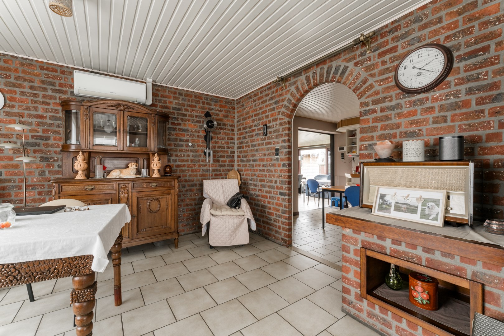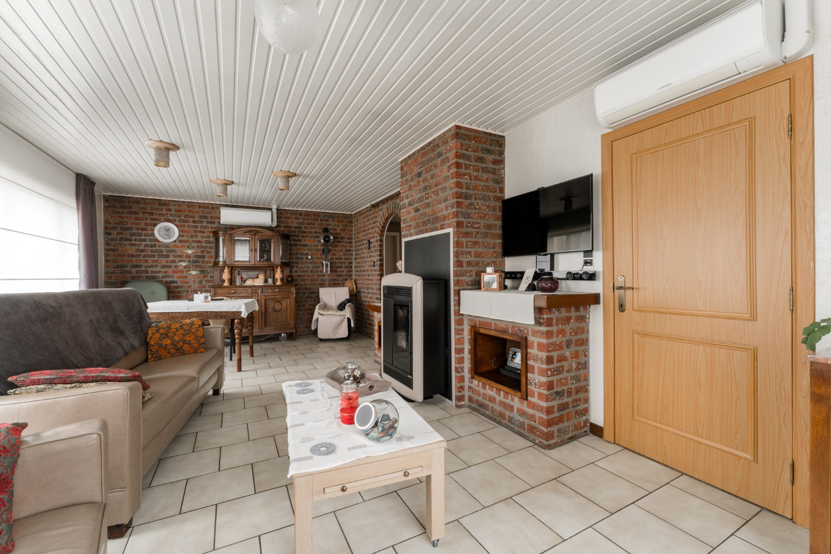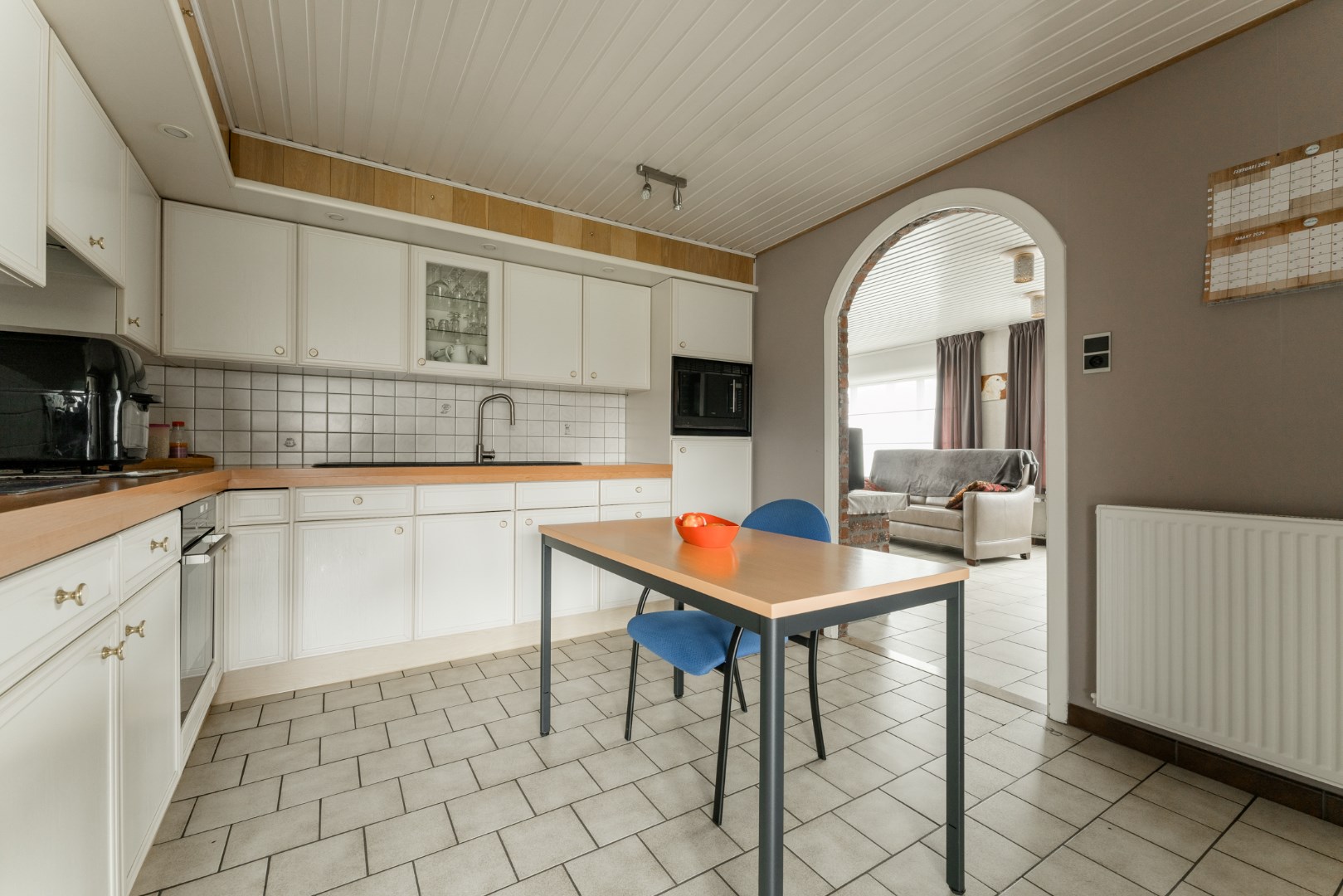 De woning heeft alle voorzieningen gelijkvloers. Zo komen we via de inkomhal, in de mooie leefruimte terecht. Het is een mooie leefruimte die aansluit op de keuken en de veranda. De leefruimte voorzien van units die in verbinding staan met de warmtepomp en dienen als verwarming. Aangrenzend in de keuken vinden we een ordelijk en net geheel met vaatwasser, keramisch vuur, oven en microgolf terug.