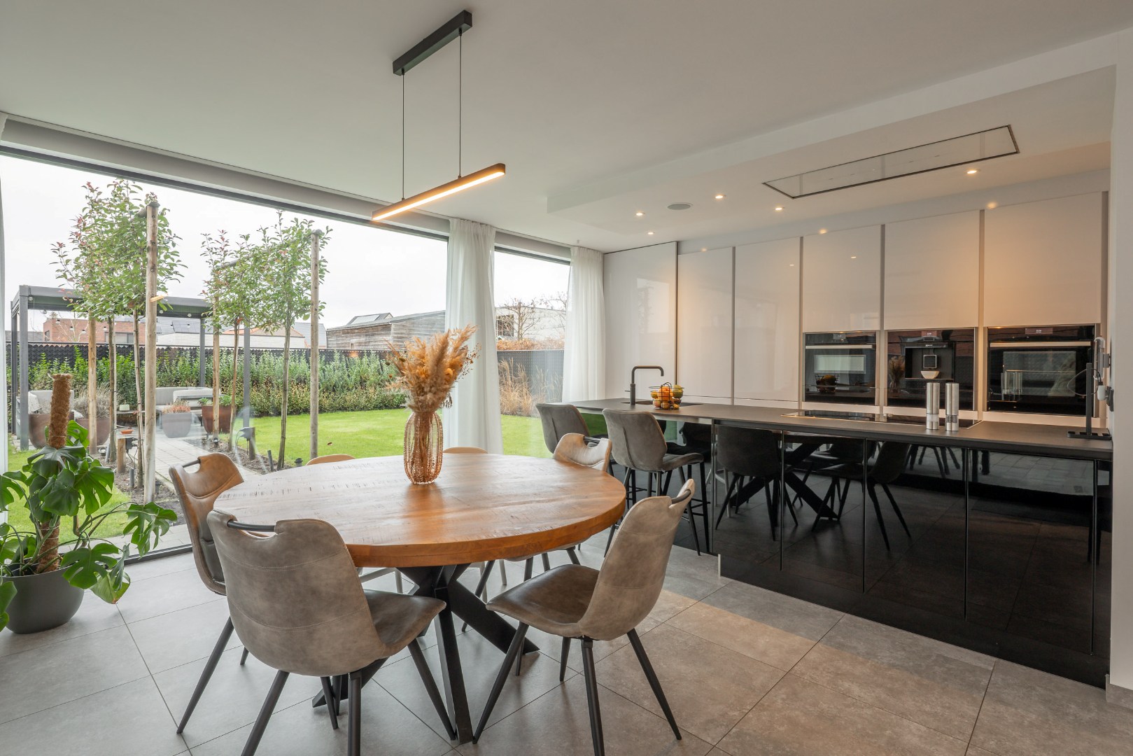 De keuken, die toch wel kan tellen als eyecatcher, bestaat uit een mooie strakke kastenwand (met doorgang) en eiland, is voorzien van alle comfort. Zo is er een 5-pits inductievuur, koffie-apparaat, combi microgolfoven, combi stoomoven, warmhoudlade, koelkast en diepvries. Al deze toestellen zijn van NEFF. Verder is er ook een Quooker voorzien, zodanig dat je direct over kokend water beschikt.