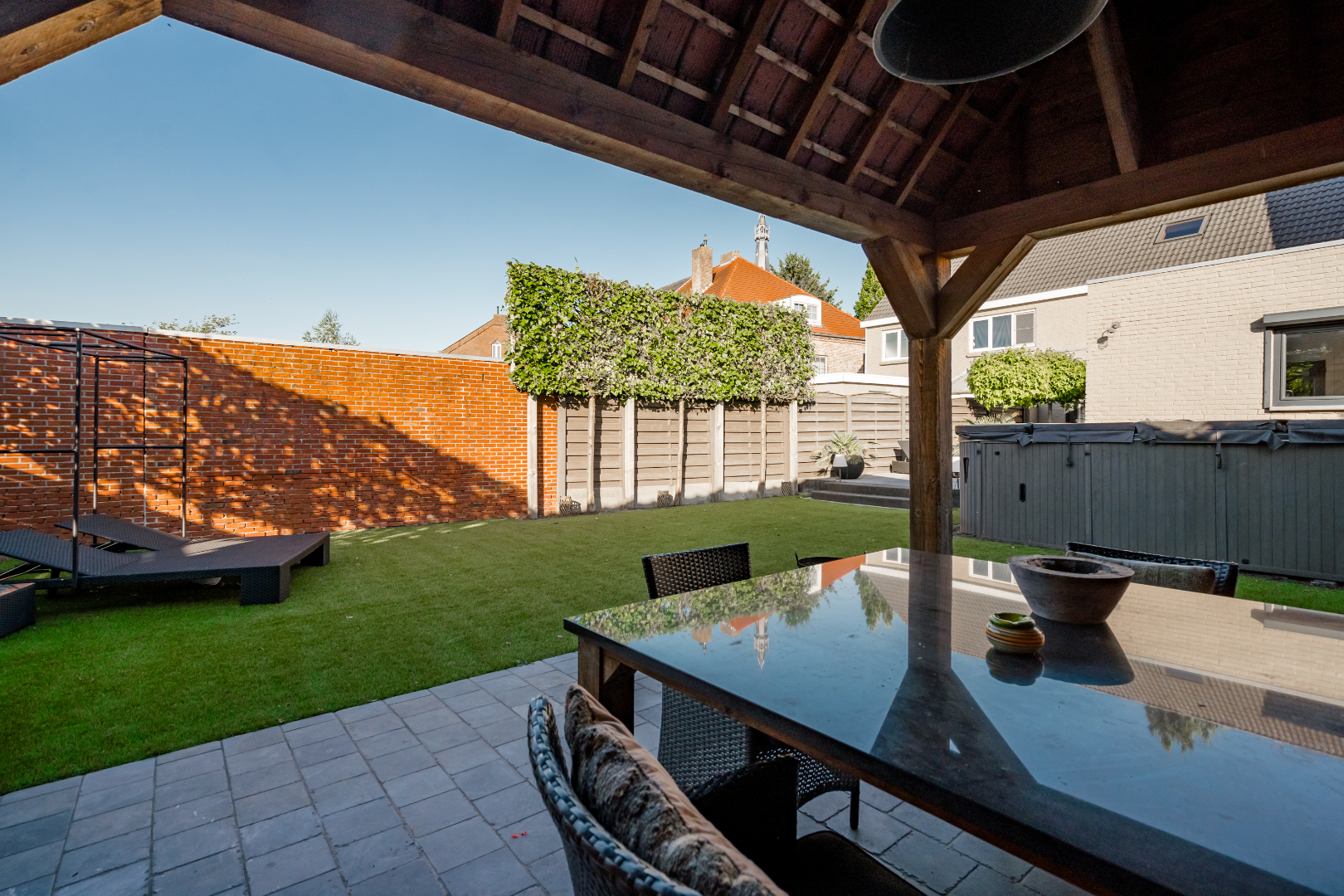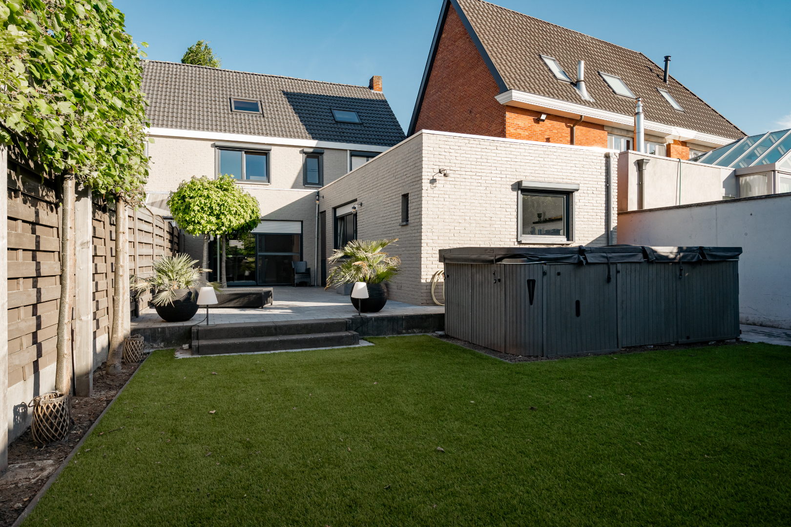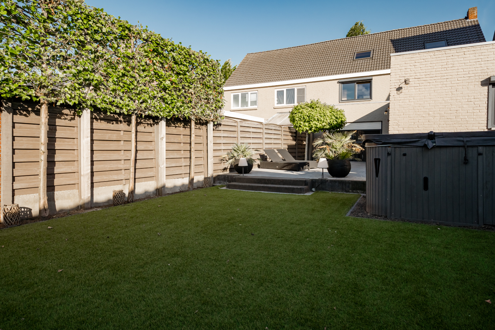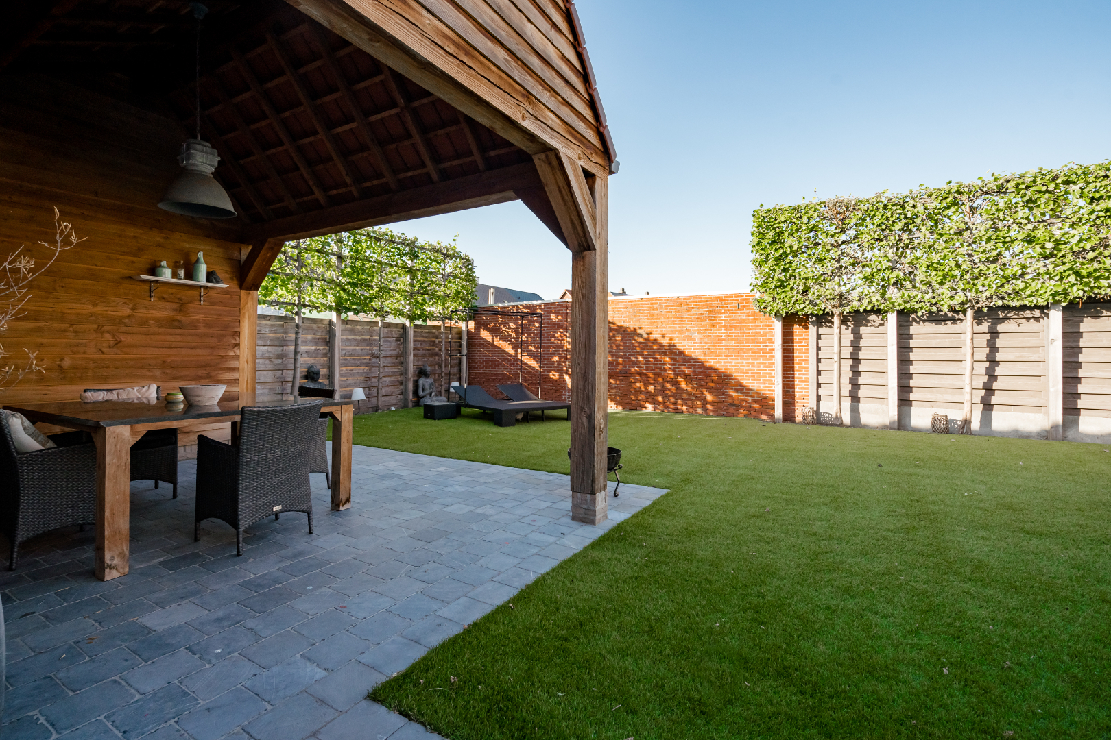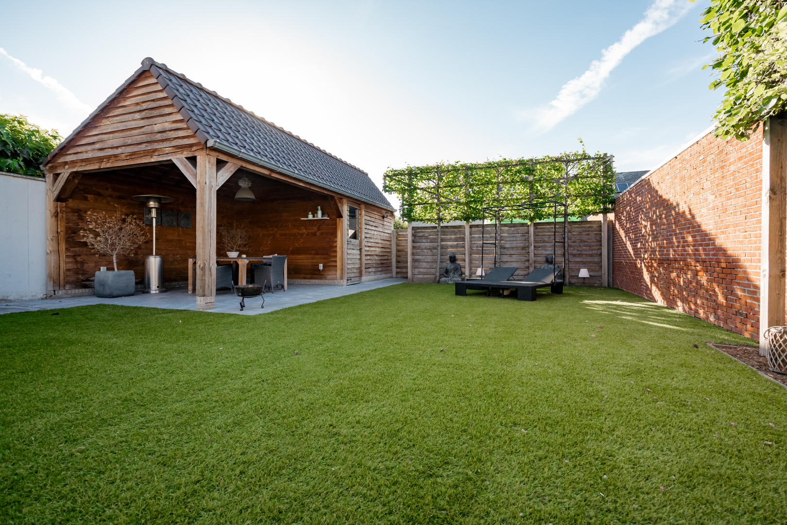 De tuin is prachtig aangelegd met kunstgras waardoor het zeer onderhoudsvriendelijk is, ook staat er een ruim tuinhuis op.