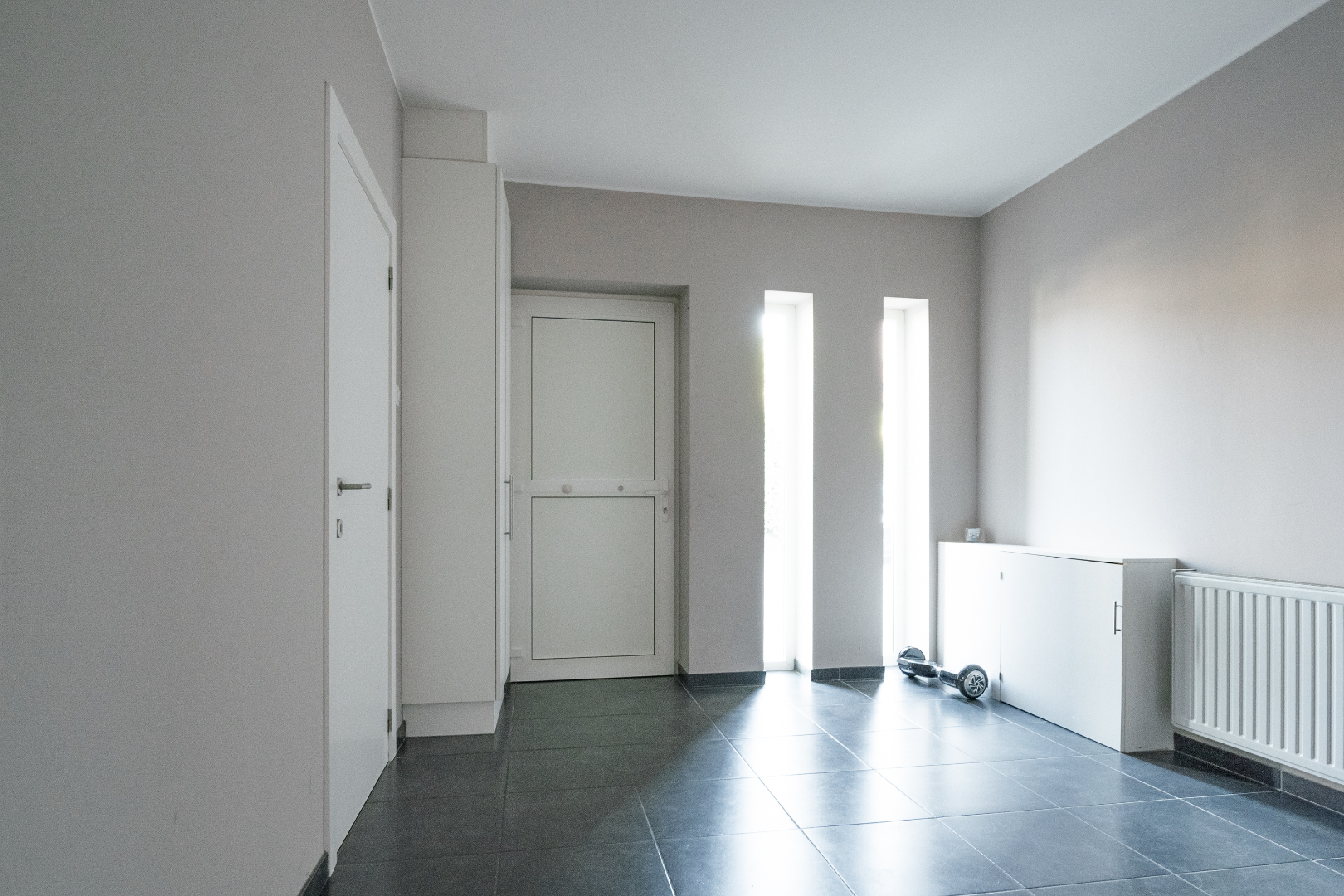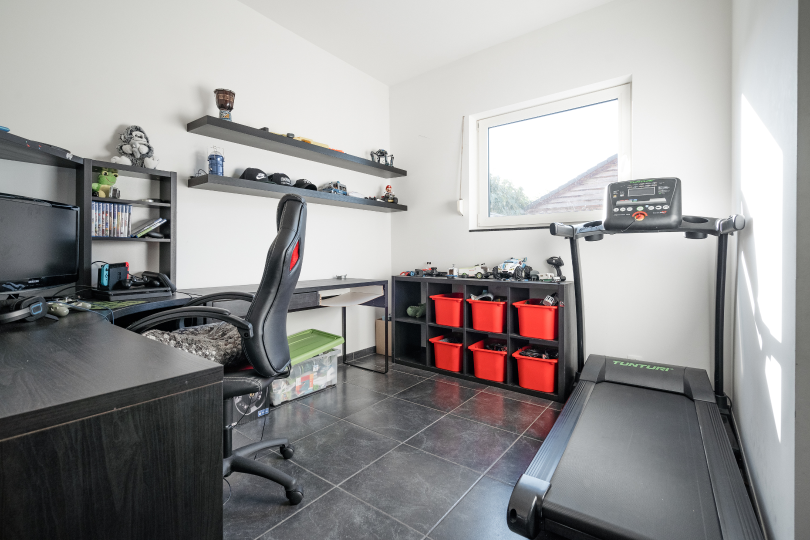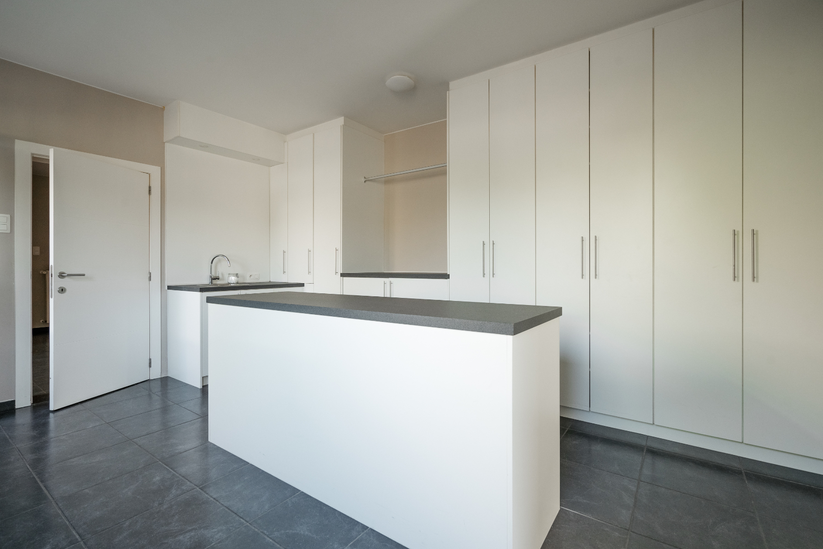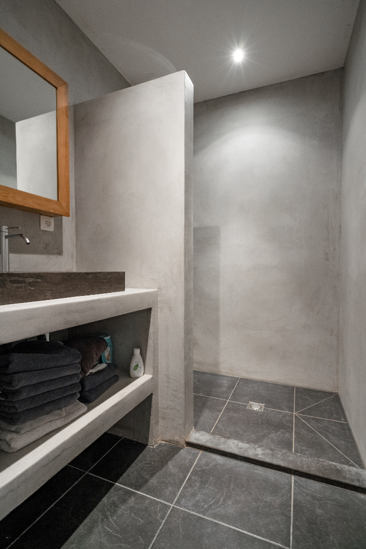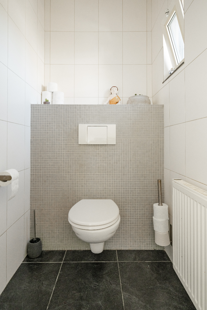 Verder vinden we op het gelijkvloers nog een zeer ruime wasplaats, deze is volledig uitgerust met inbouwkasten. Hierdoor staat de wasmachine en de droogkast altijd netjes uit het zicht. Achter de wasplaats is er een polyvalente ruimte voorzien dewelke momenteel dienst doet als bureau. Er is ook een apart toilet aanwezig en een badkamer uitgerust met inloopdouche.