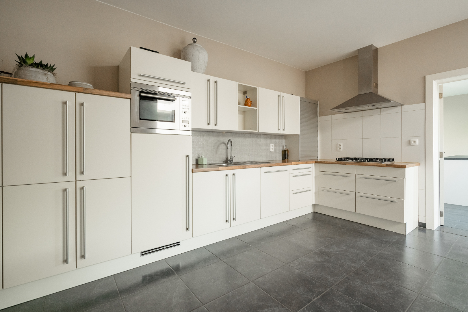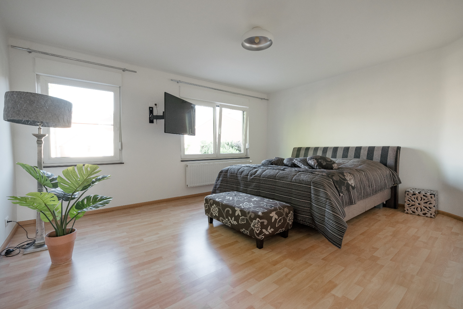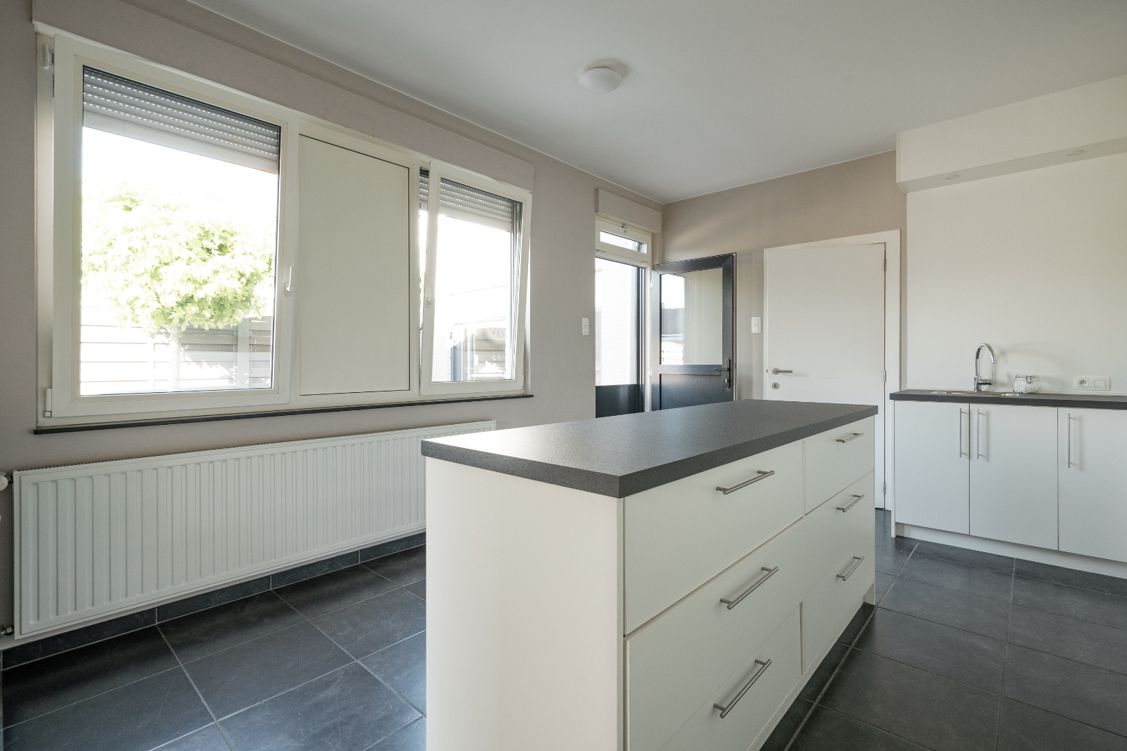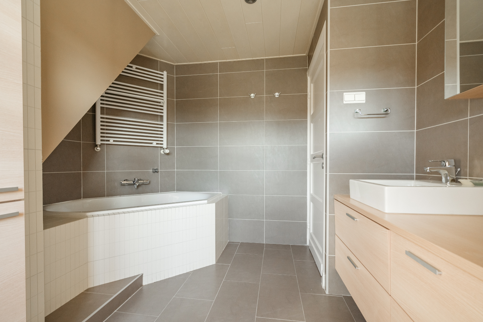 Verder vinden we op het gelijkvloers nog een zeer ruime wasplaats, deze is volledig uitgerust met inbouwkasten. Hierdoor staat de wasmachine en de droogkast altijd netjes uit het zicht. Achter de wasplaats is er een polyvalente ruimte voorzien dewelke momenteel dienst doet als bureau. Er is ook een apart toilet aanwezig en een badkamer uitgerust met inloopdouche.