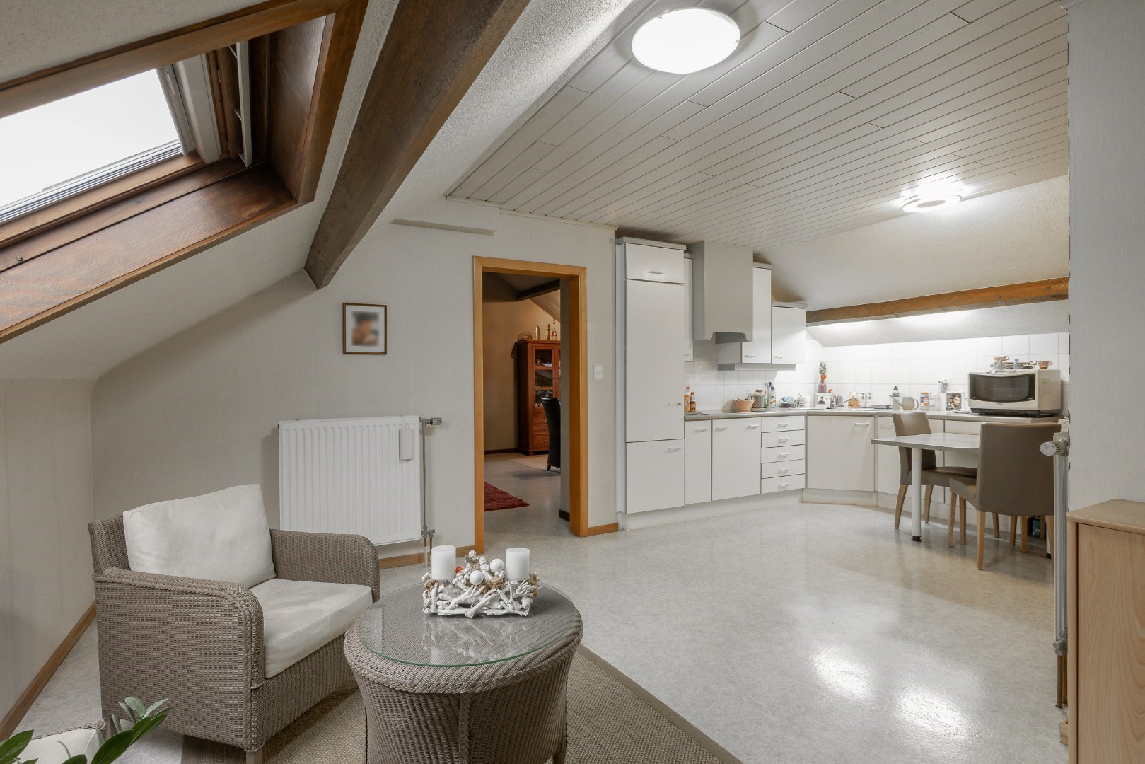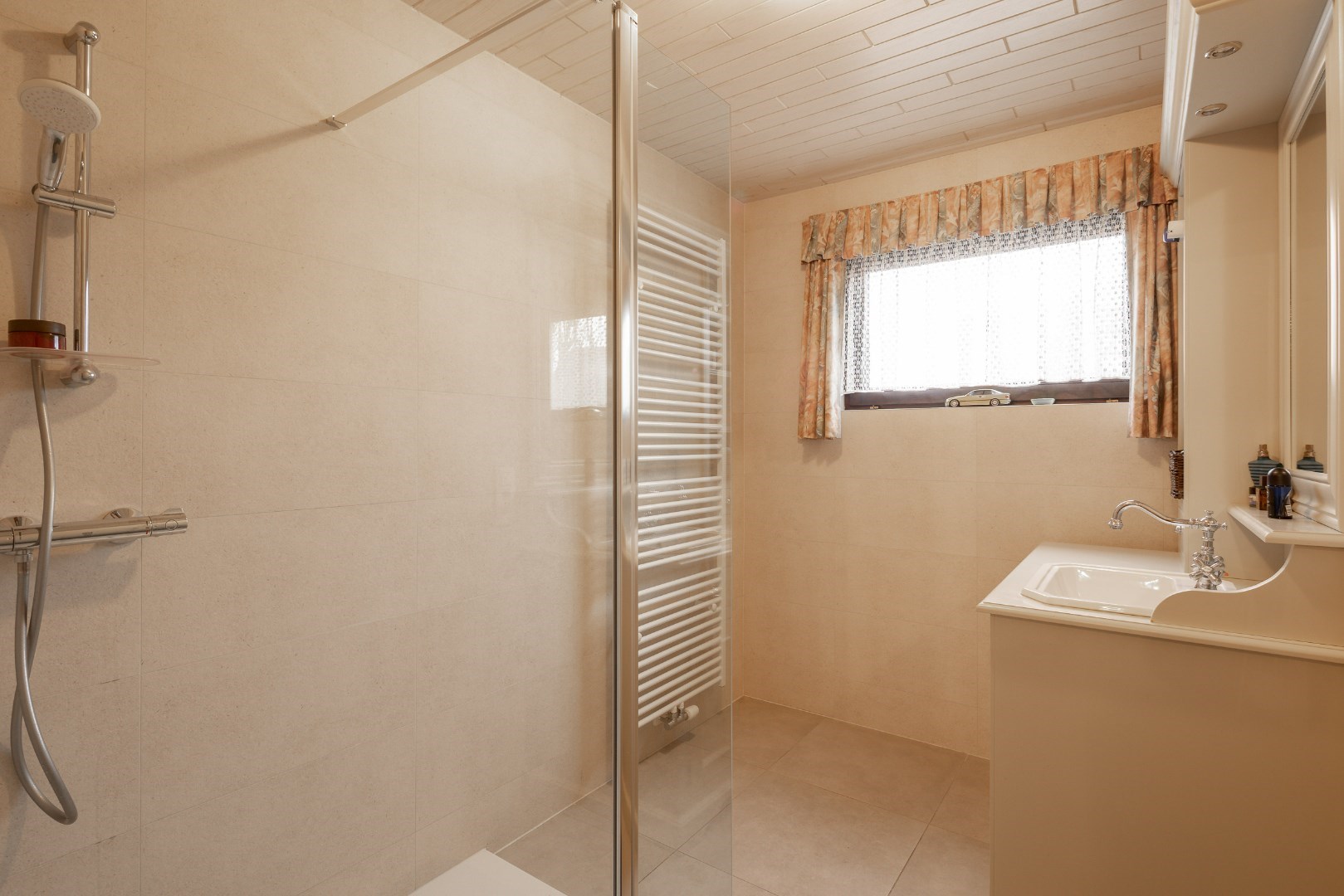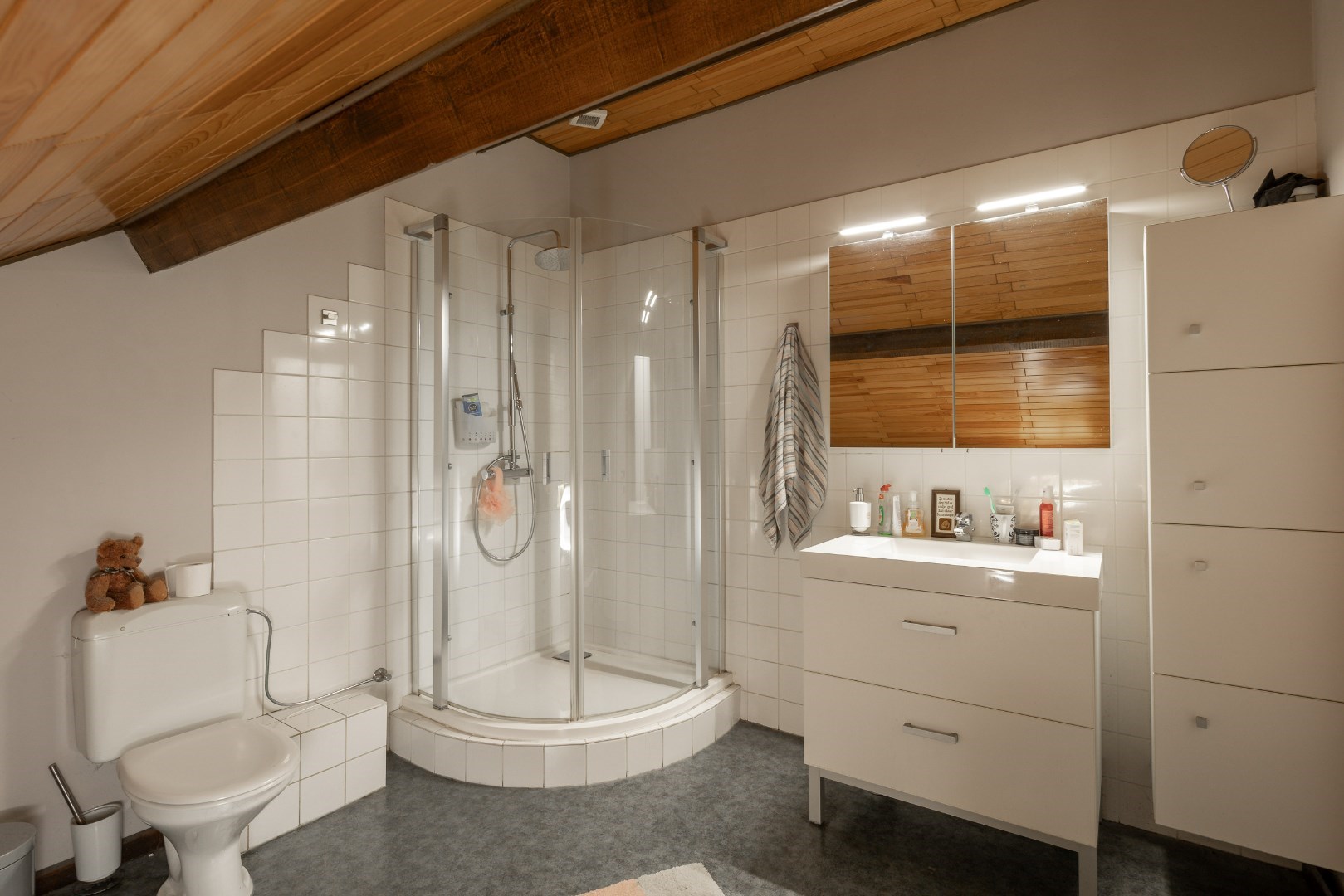 Op verdiep daarentegen is ook een badkamer met douche en toilet, zijn er twee slaapkamers, is er dressingruimte, is er een zeer ruime keuken en een grote leefruimte. Alles is dus aanwezig om hier zelfstandig te kunnen wonen.