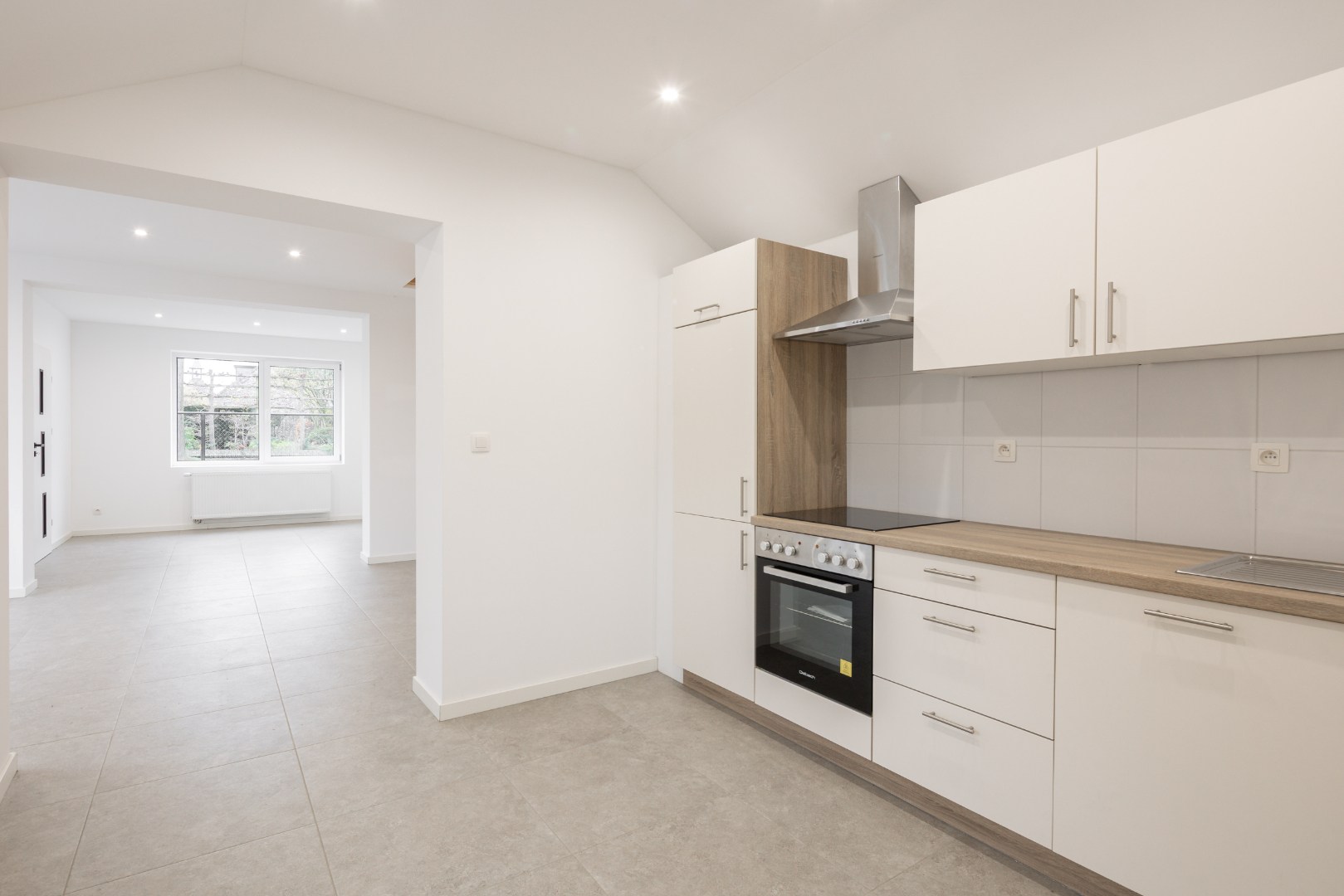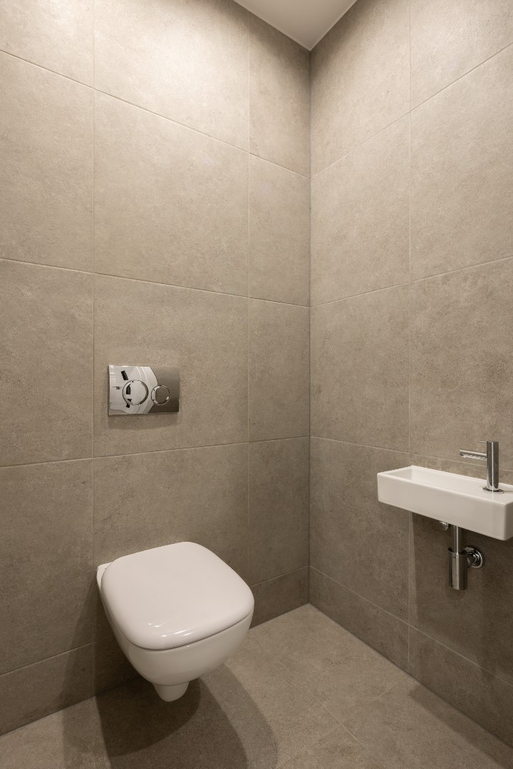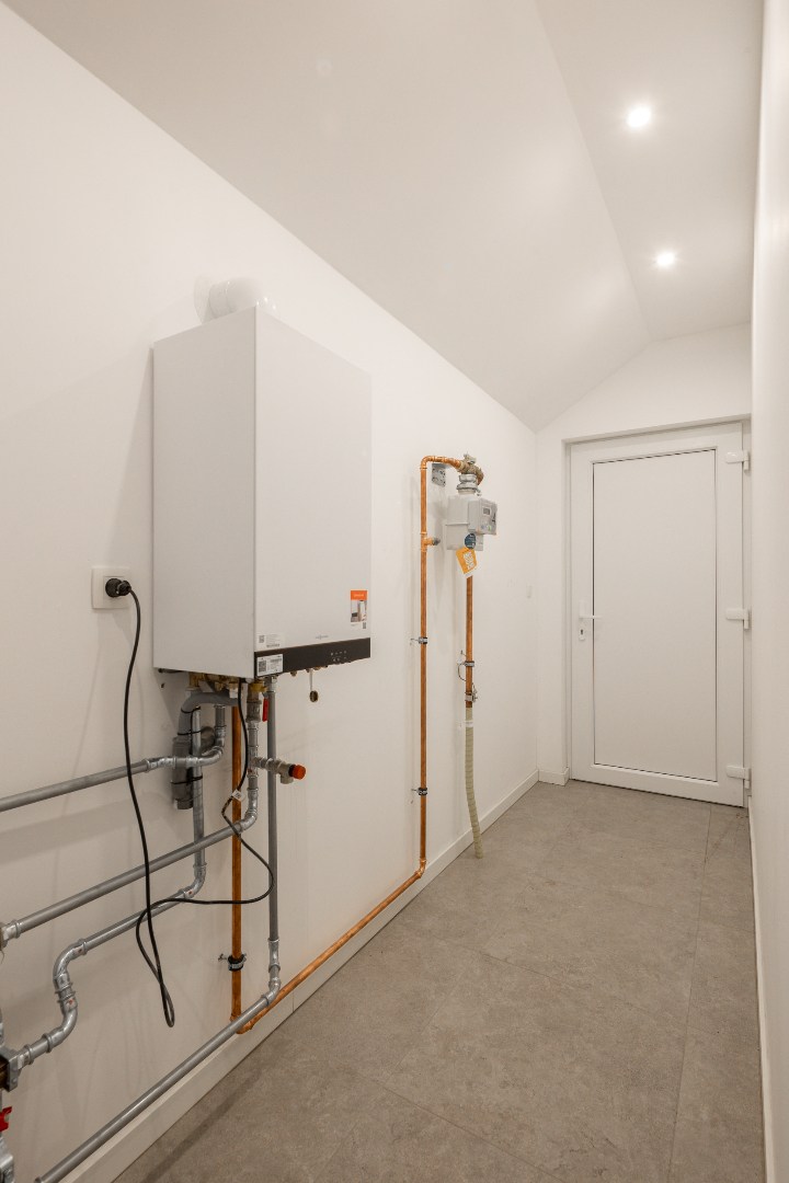 Via de inkomhal hebben we toegang tot een apart toilet, alsook de open leefruimte. De open leefruimte beschikt over veel lichtinval, werd netjes tot in de puntjes verzorgd en is voorzien van diverse inbouwspots. De leefruimte sluit vervolgens aan op de keuken, die voorzien is van alle nodige toestellen. Vanuit de keuken is er aansluiting met de volledig betegelde badkamer voorzien van douche, tweede toilet en lavabo. Verder is er nog een berging voor wasmachine en/of droogkast. Hier hangt ook de gasketel van Viessmann.