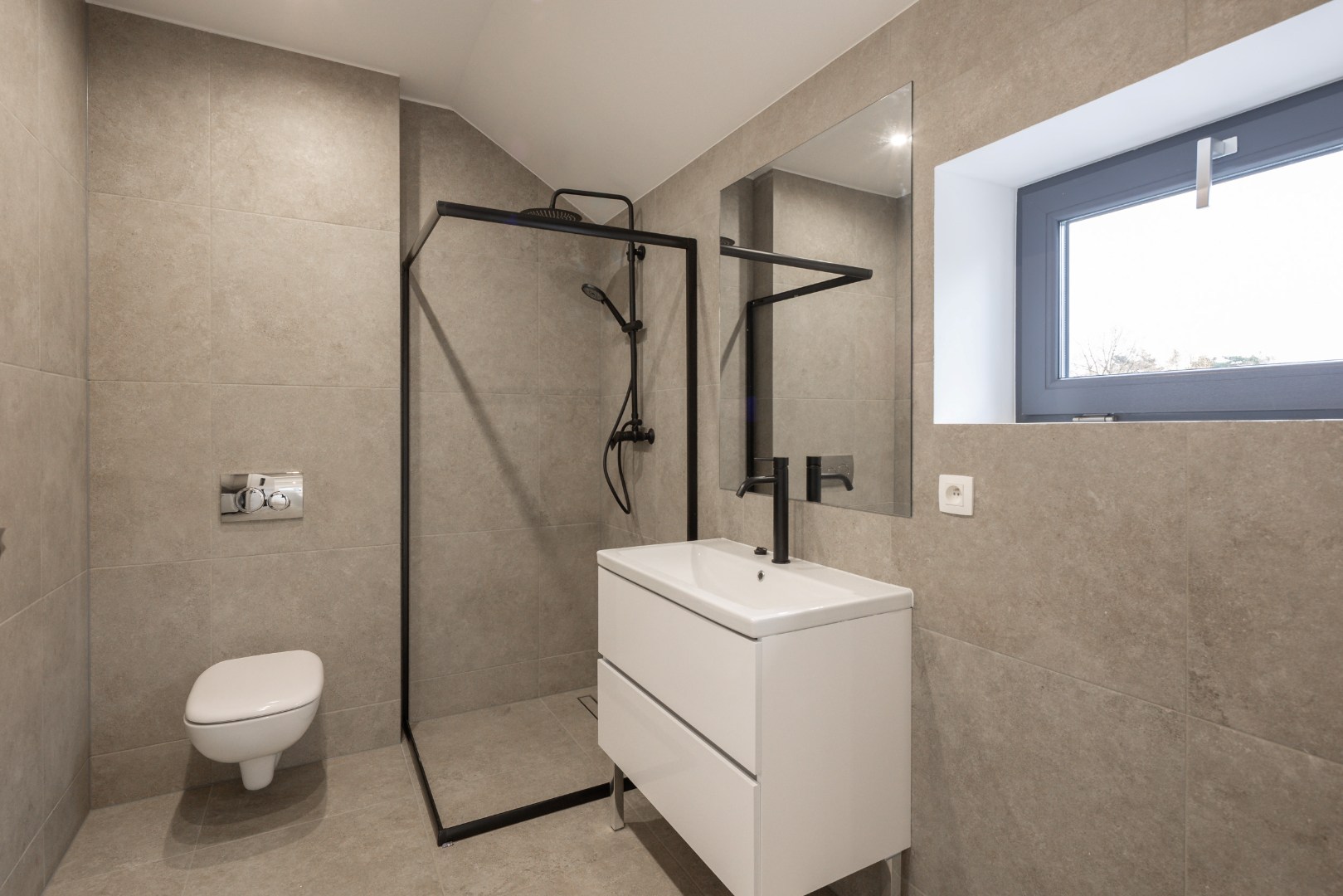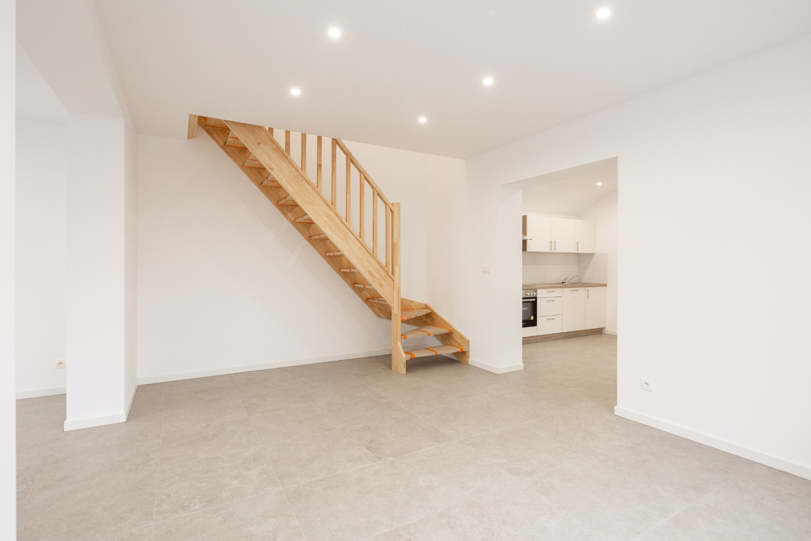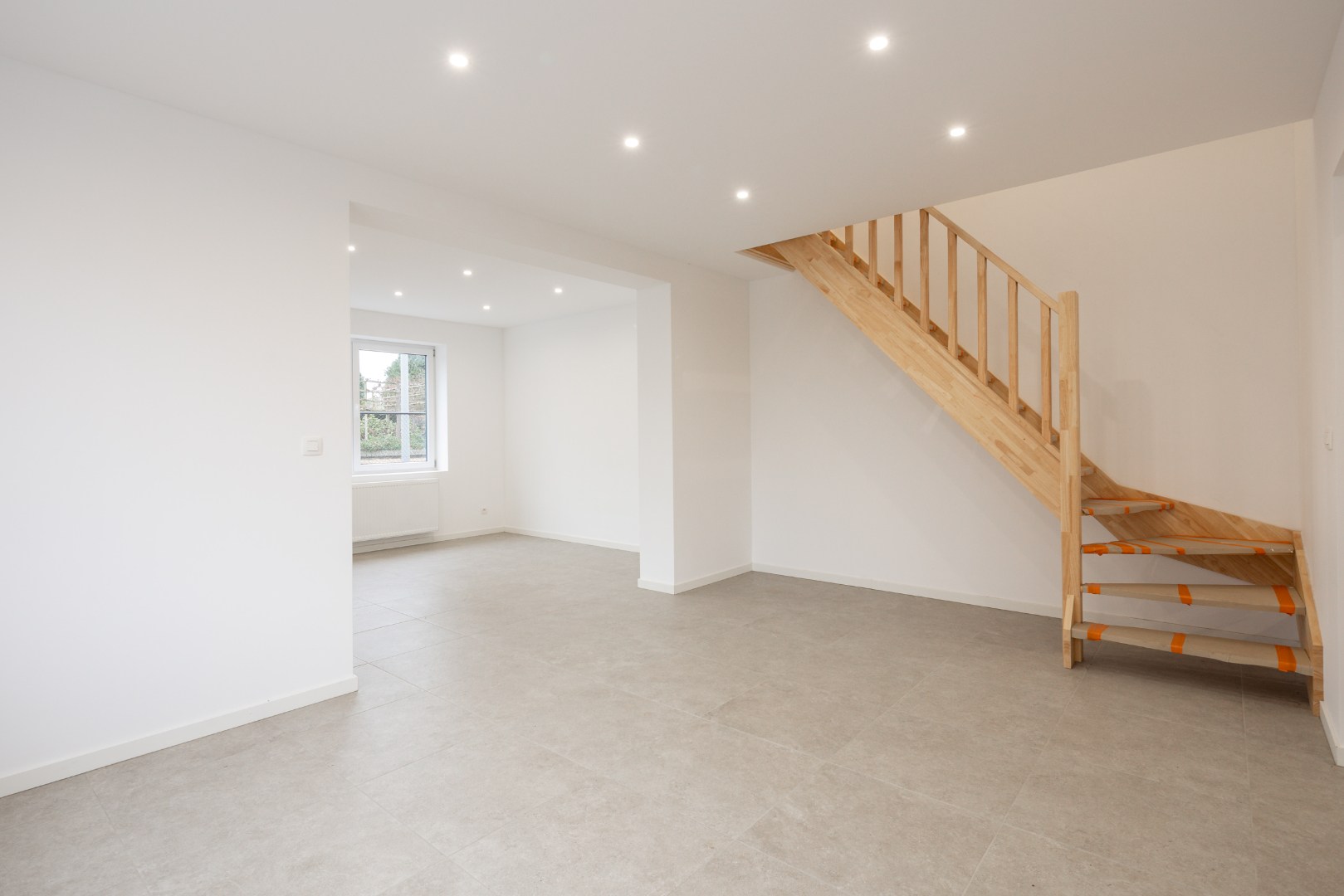 Via de inkomhal hebben we toegang tot een apart toilet, alsook de open leefruimte. De open leefruimte beschikt over veel lichtinval, werd netjes tot in de puntjes verzorgd en is voorzien van diverse inbouwspots. De leefruimte sluit vervolgens aan op de keuken, die voorzien is van alle nodige toestellen. Vanuit de keuken is er aansluiting met de volledig betegelde badkamer voorzien van douche, tweede toilet en lavabo. Verder is er nog een berging voor wasmachine en/of droogkast. Hier hangt ook de gasketel van Viessmann.