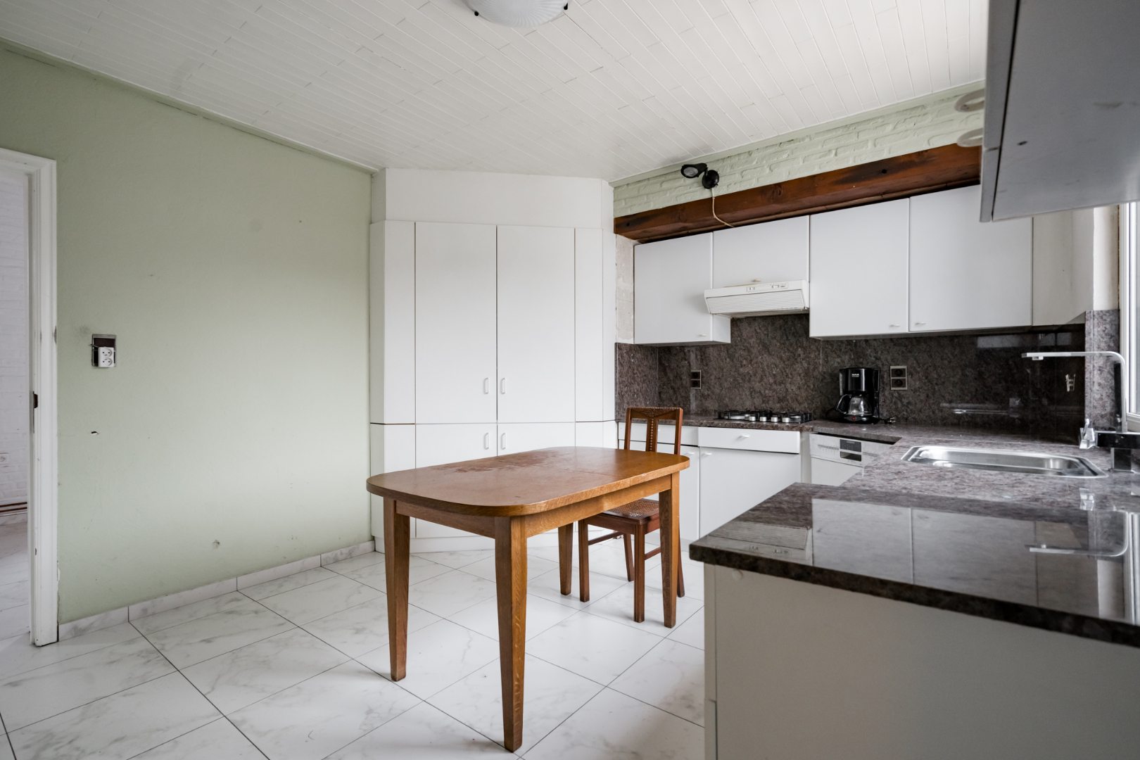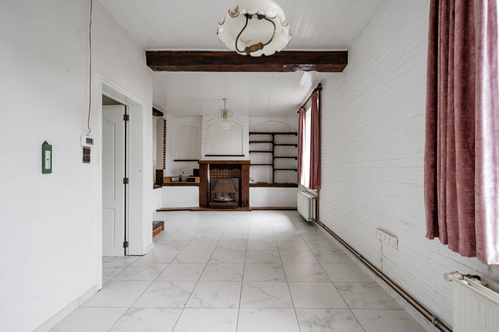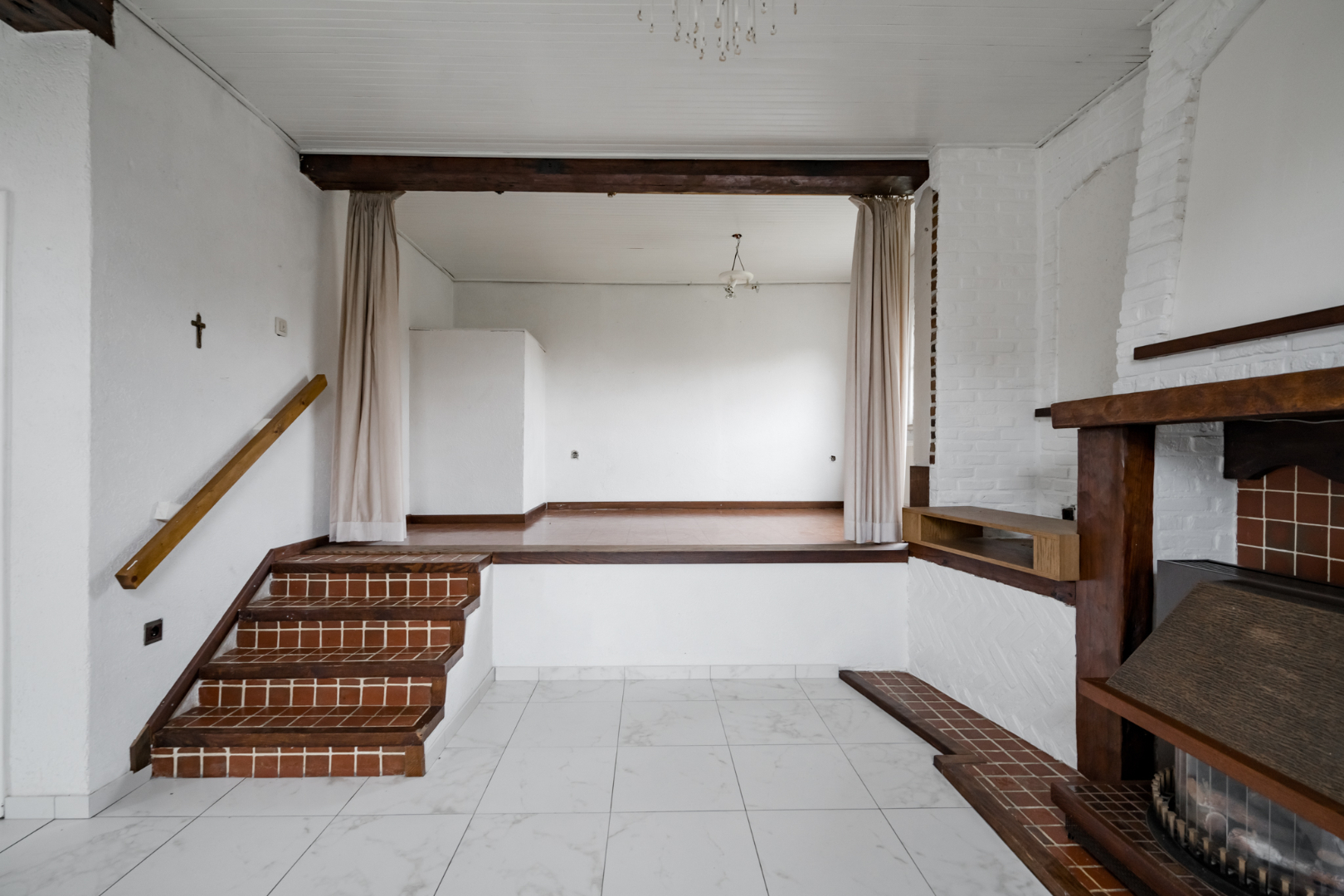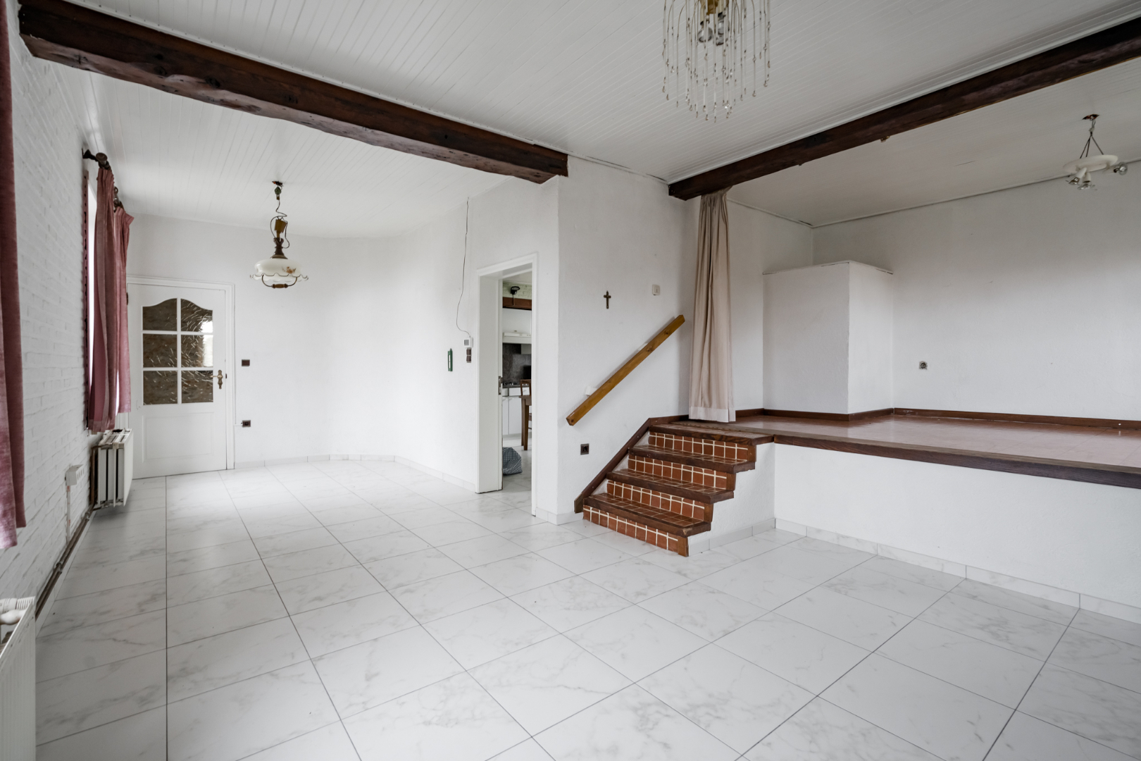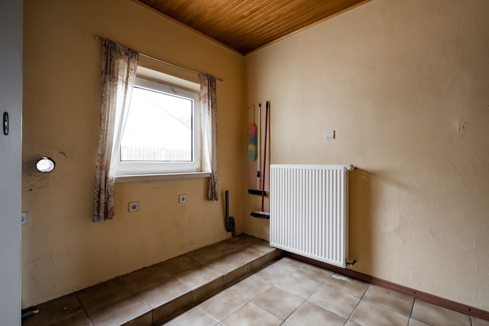 Indeling: Inkomhal, technische ruimte, keuken, woonkamer, toegang tot de kelder, wasplaats, badkamer, toilet