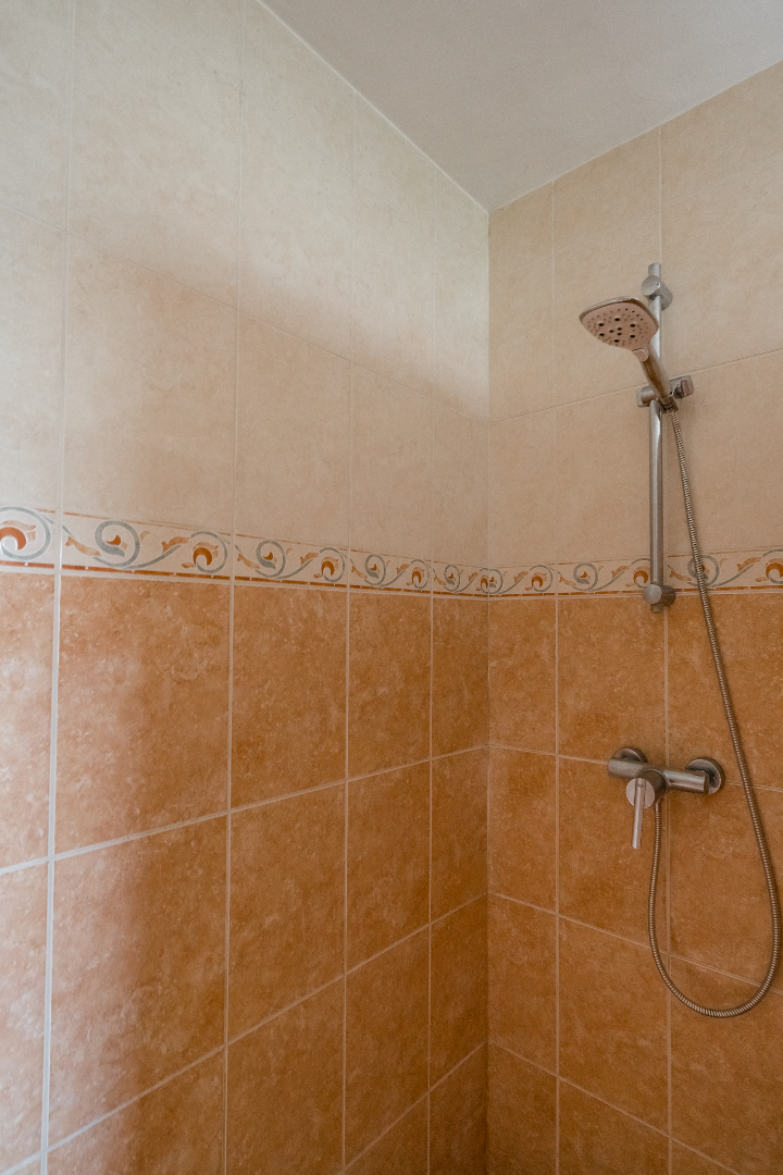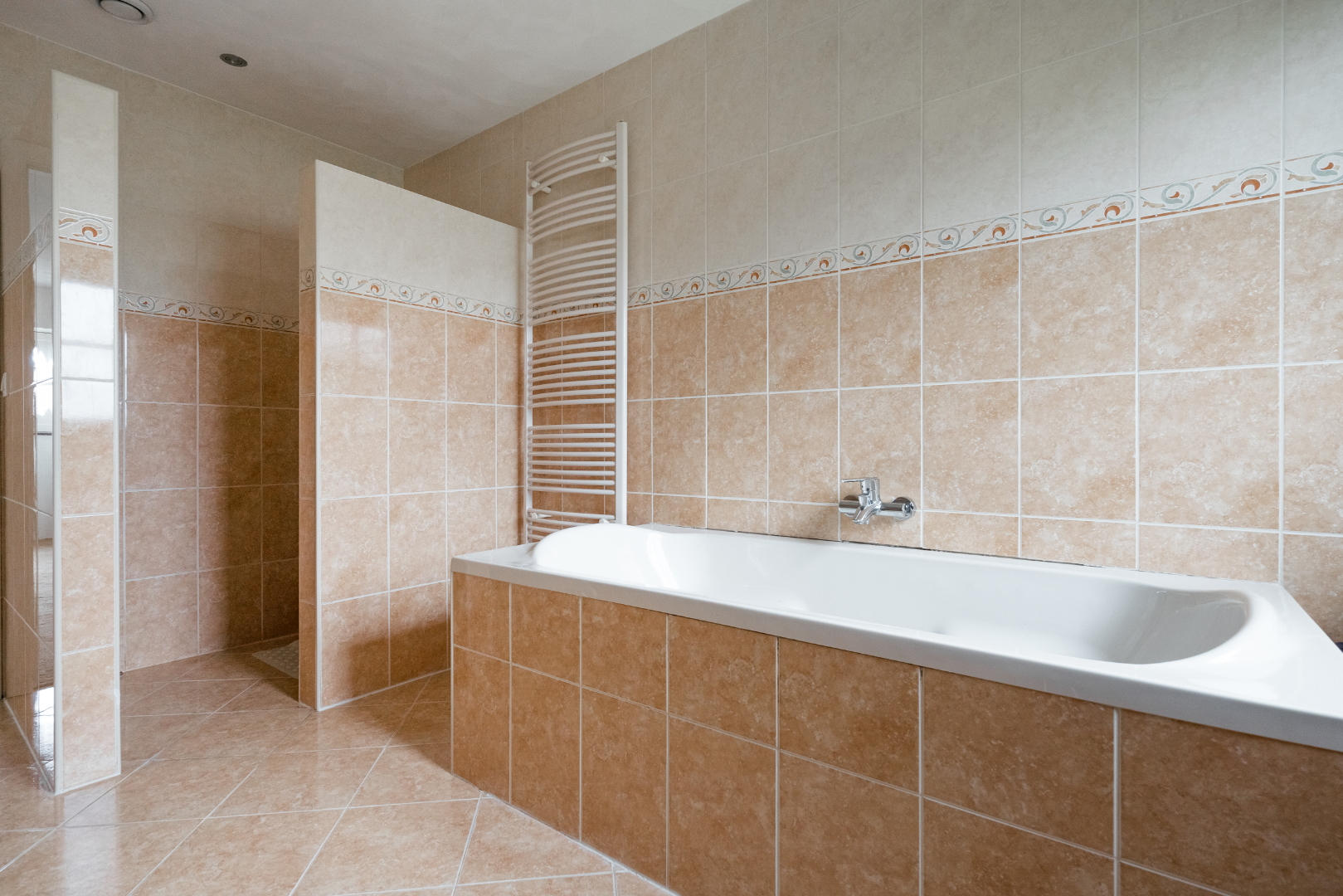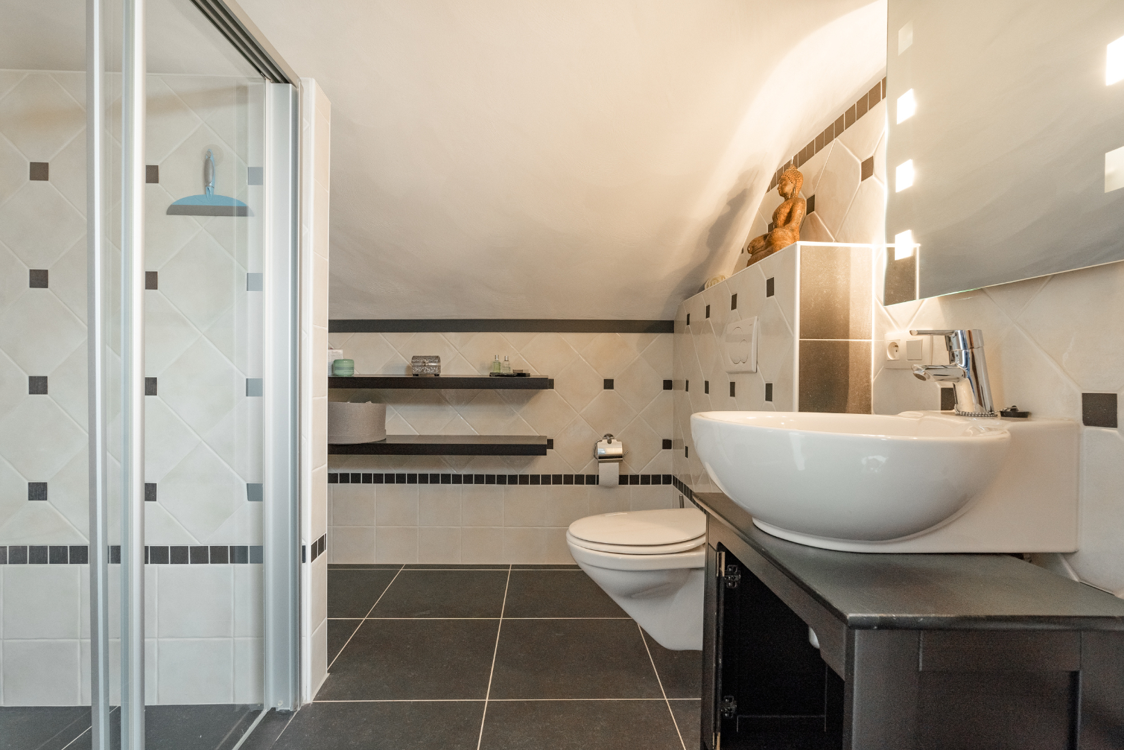 Goed uitgeruste badkamer met inloopdouche, ligbad, dubbele lavabo met meubel.
