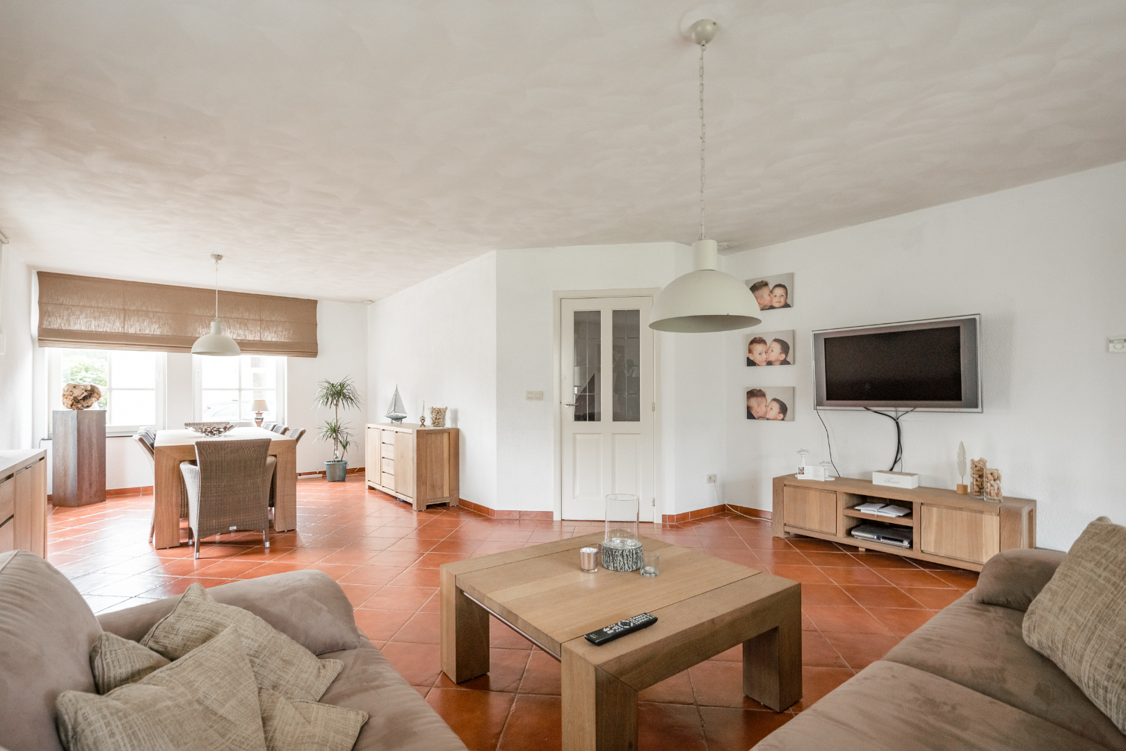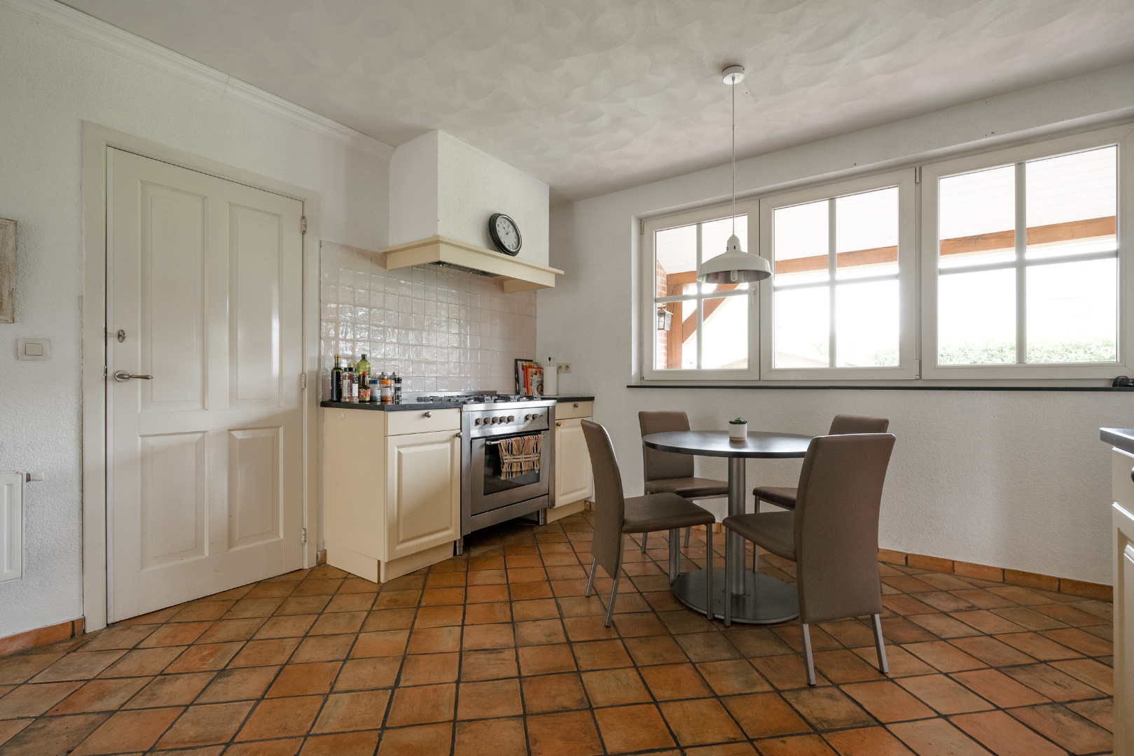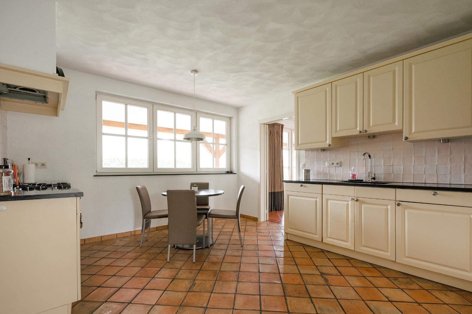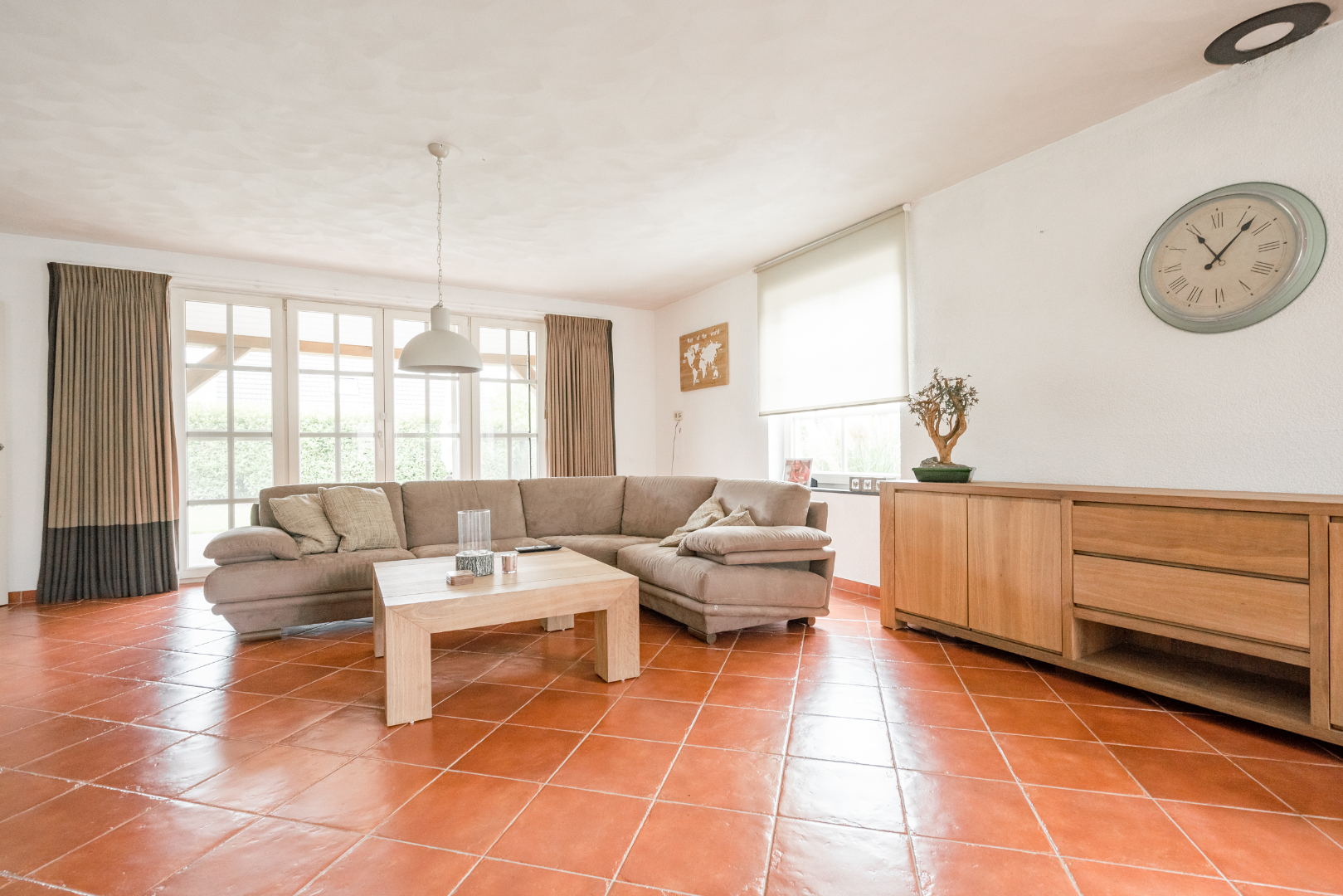 Woonkamer met tegelvoer, mogelijkheid voor gaskachel voorzien en toegang tot het overdekt terras, keuken met 5 pits gasfornuis en granieten werkblad, bergruimte en inpandige garage.
