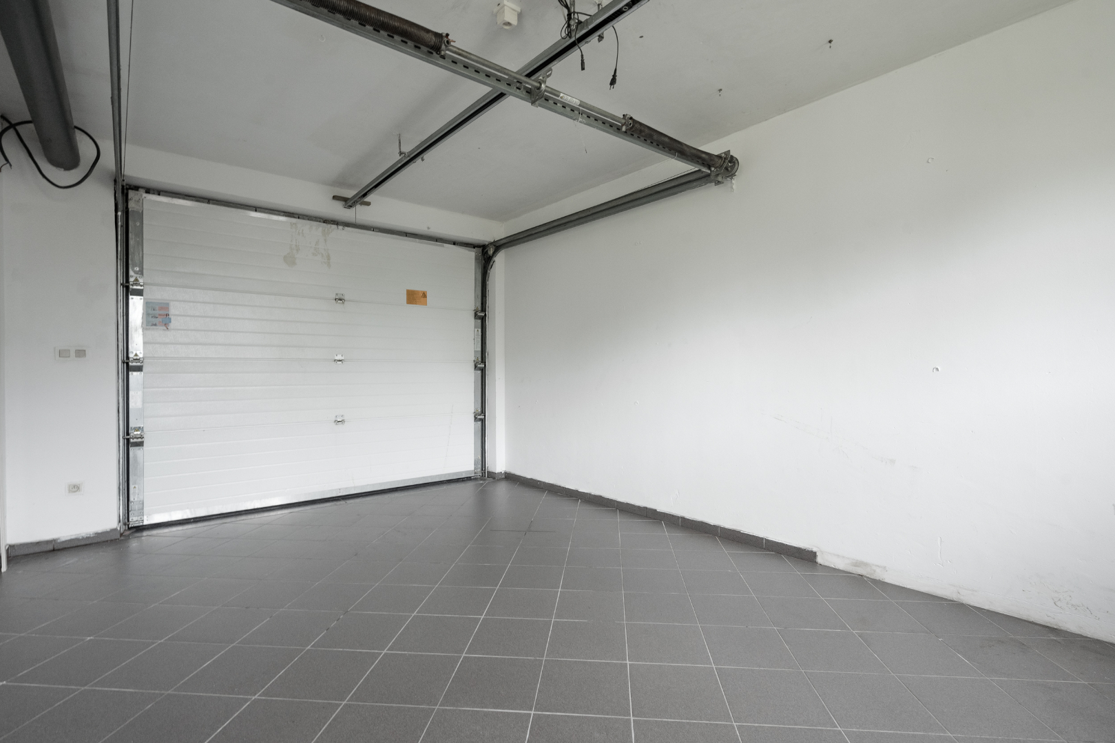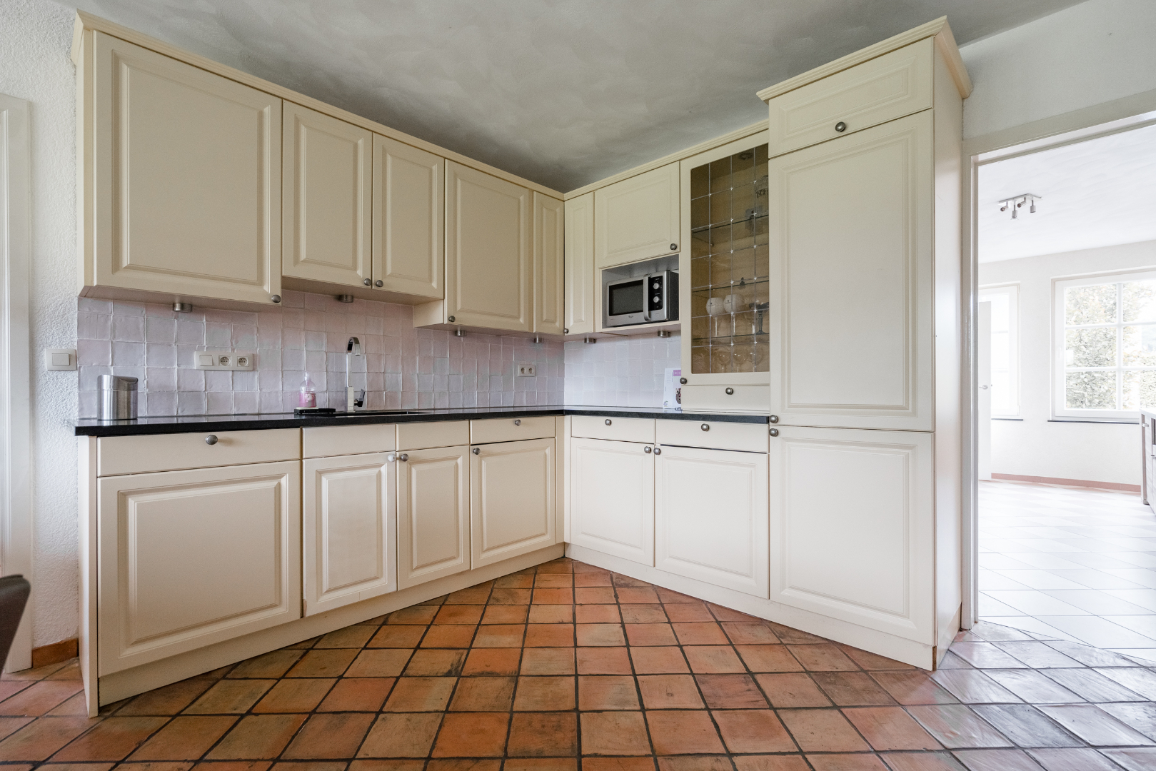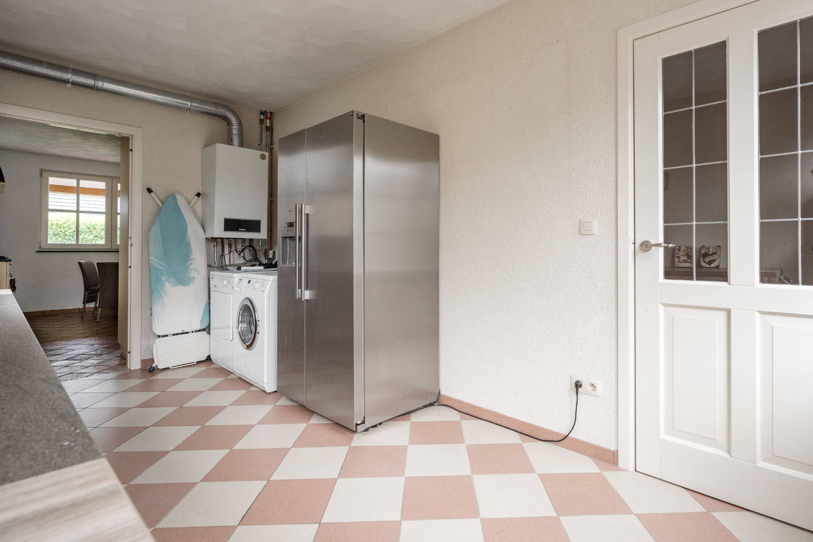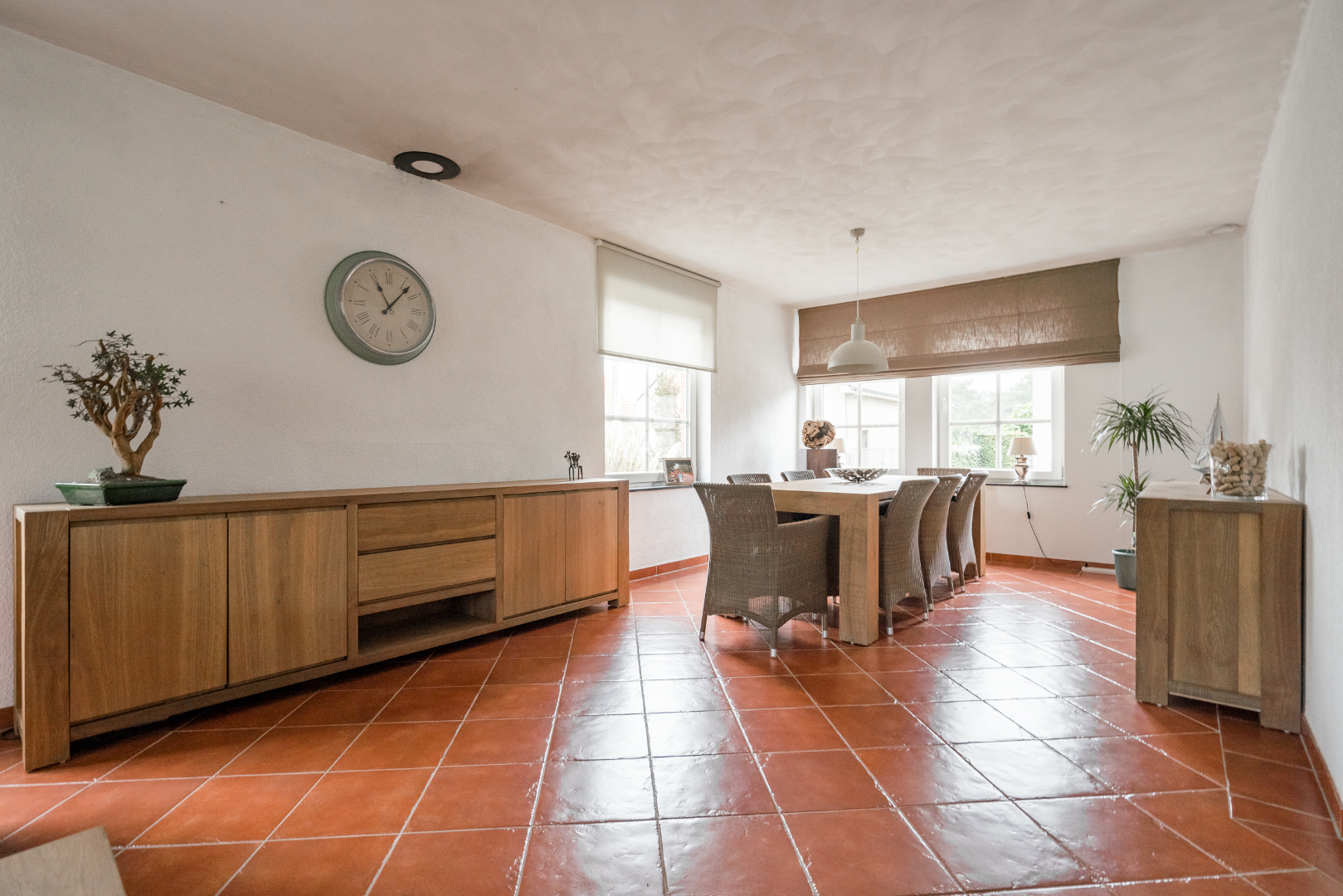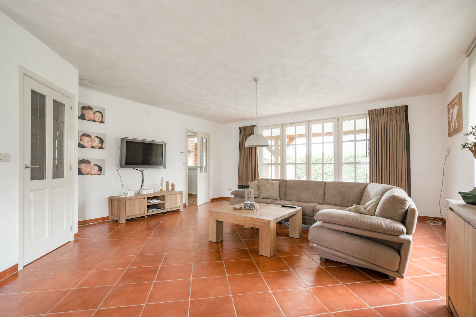 Woonkamer met tegelvoer, mogelijkheid voor gaskachel voorzien en toegang tot het overdekt terras, keuken met 5 pits gasfornuis en granieten werkblad, bergruimte en inpandige garage.
