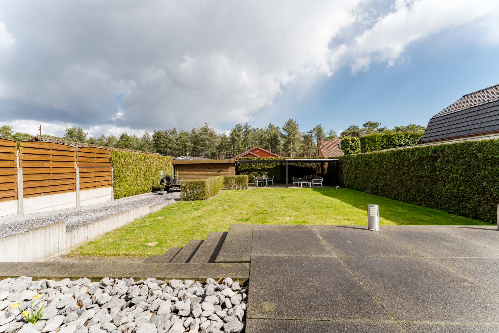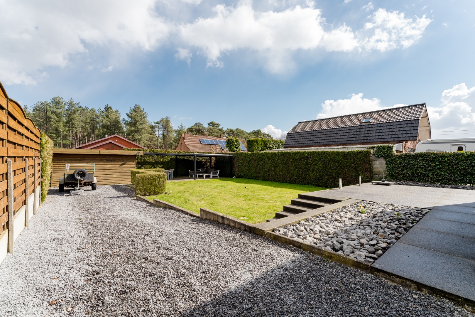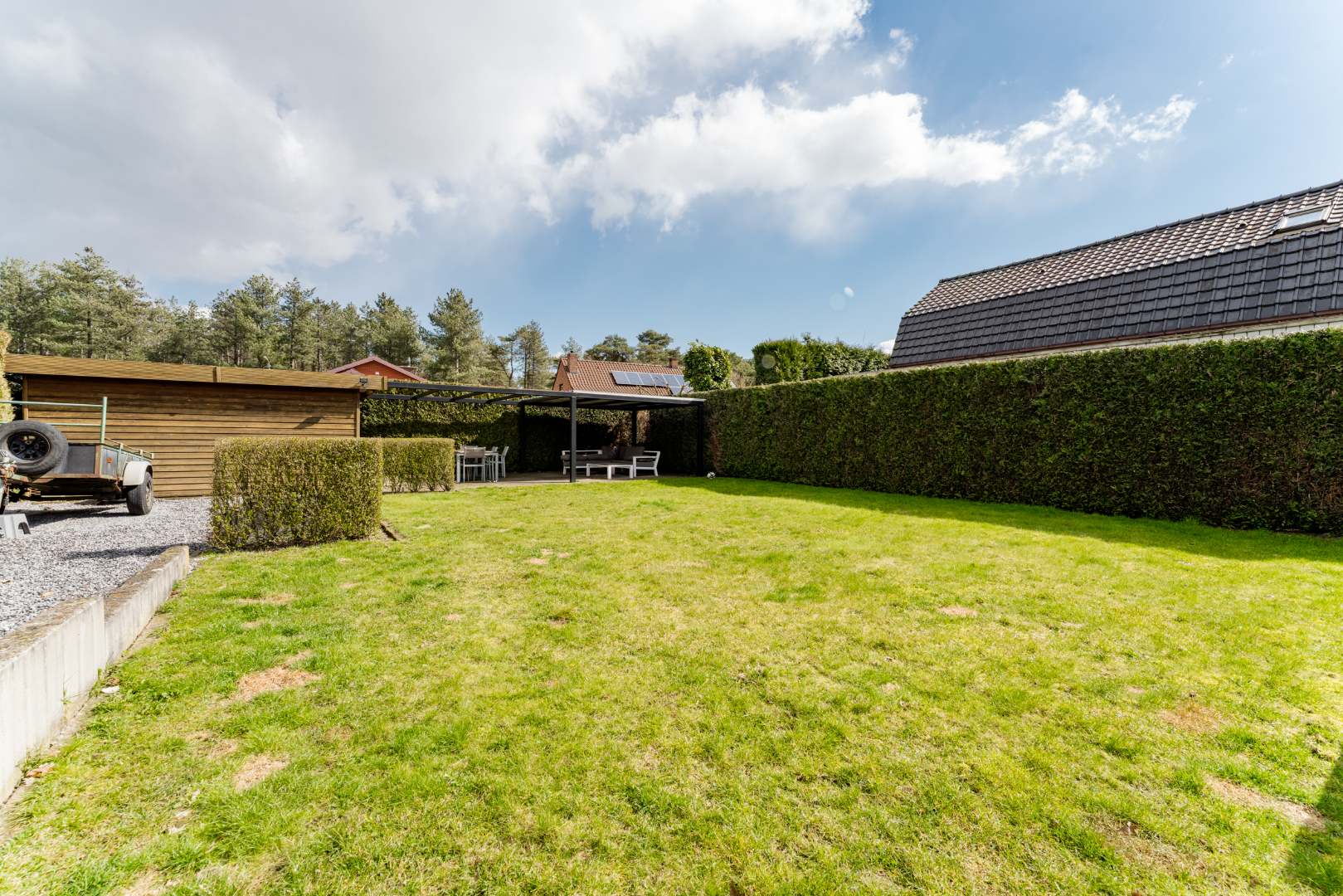 Tuin: Terras aangelegd en tuinhuis aanwezig. Voor het comfort is er een sproei installatie voorzien.