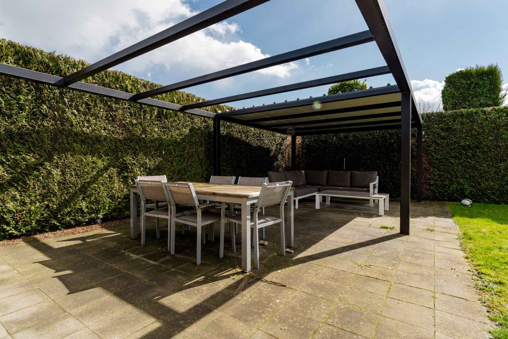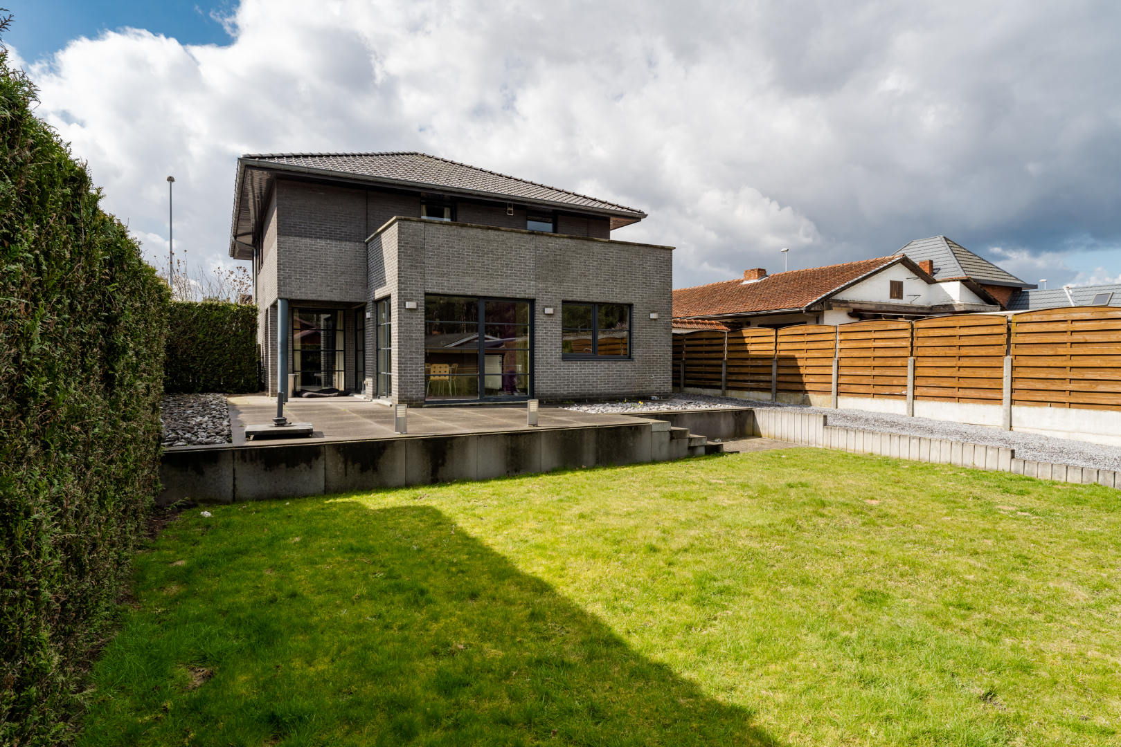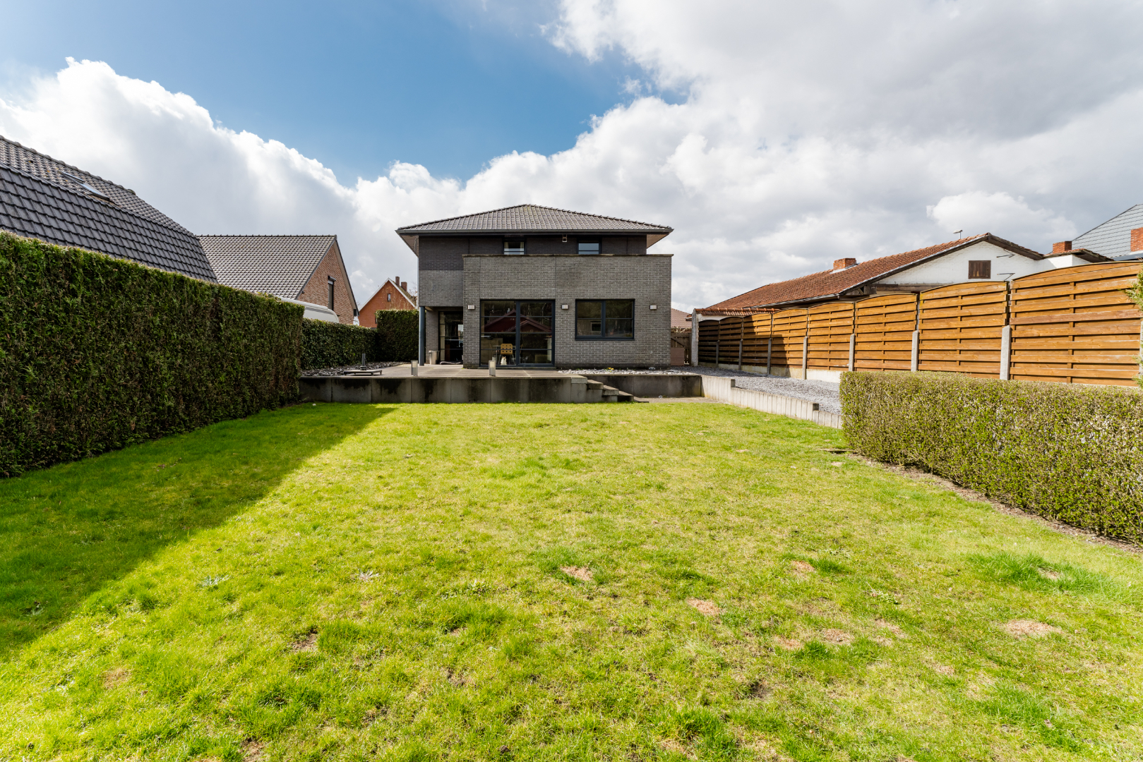 Tuin: Terras aangelegd en tuinhuis aanwezig. Voor het comfort is er een sproei installatie voorzien.