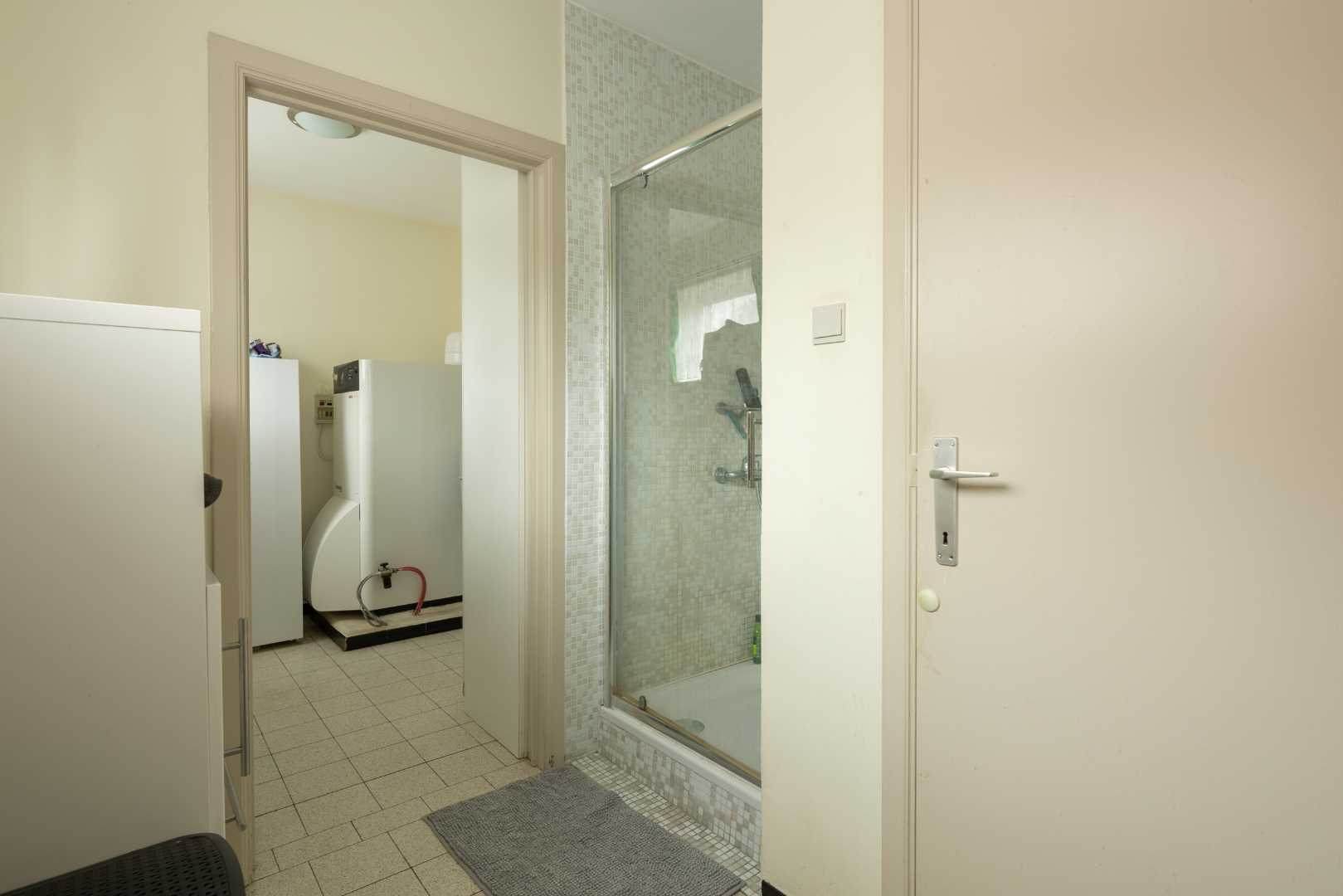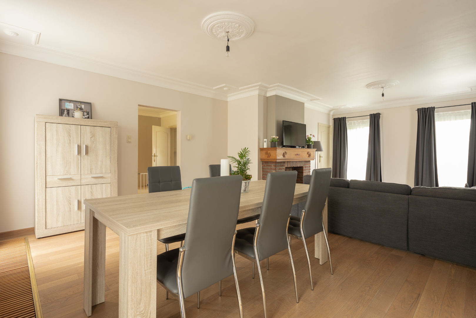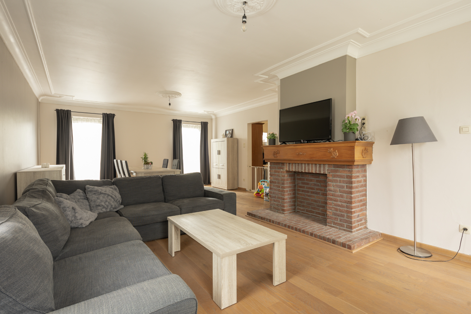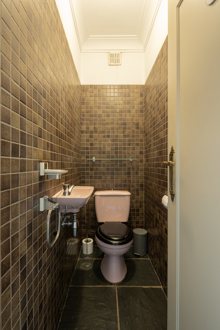 Indeling gelijkvloers: ruime inkomhal (12,6 m²) met vloer in Portugese leisteen, een apart toilet en de trap. In de woonkamer (37,5 m²) met eetplaats en salon ligt een mooie parketvloer. De keuken heeft een ruime eethoek. Via het halletje (1,6 m²) aan de achterdeur komt men in de 1ste badkamer (5 m²) met recent vernieuwde douche en lavabo met meubel. Hiernaast is er toegang tot de wasplaats (6,5 m²) met hoogrendementsverwarmingsketel (2013). Vooraan de woning bevindt zich een bureel/5de slaapkamer.