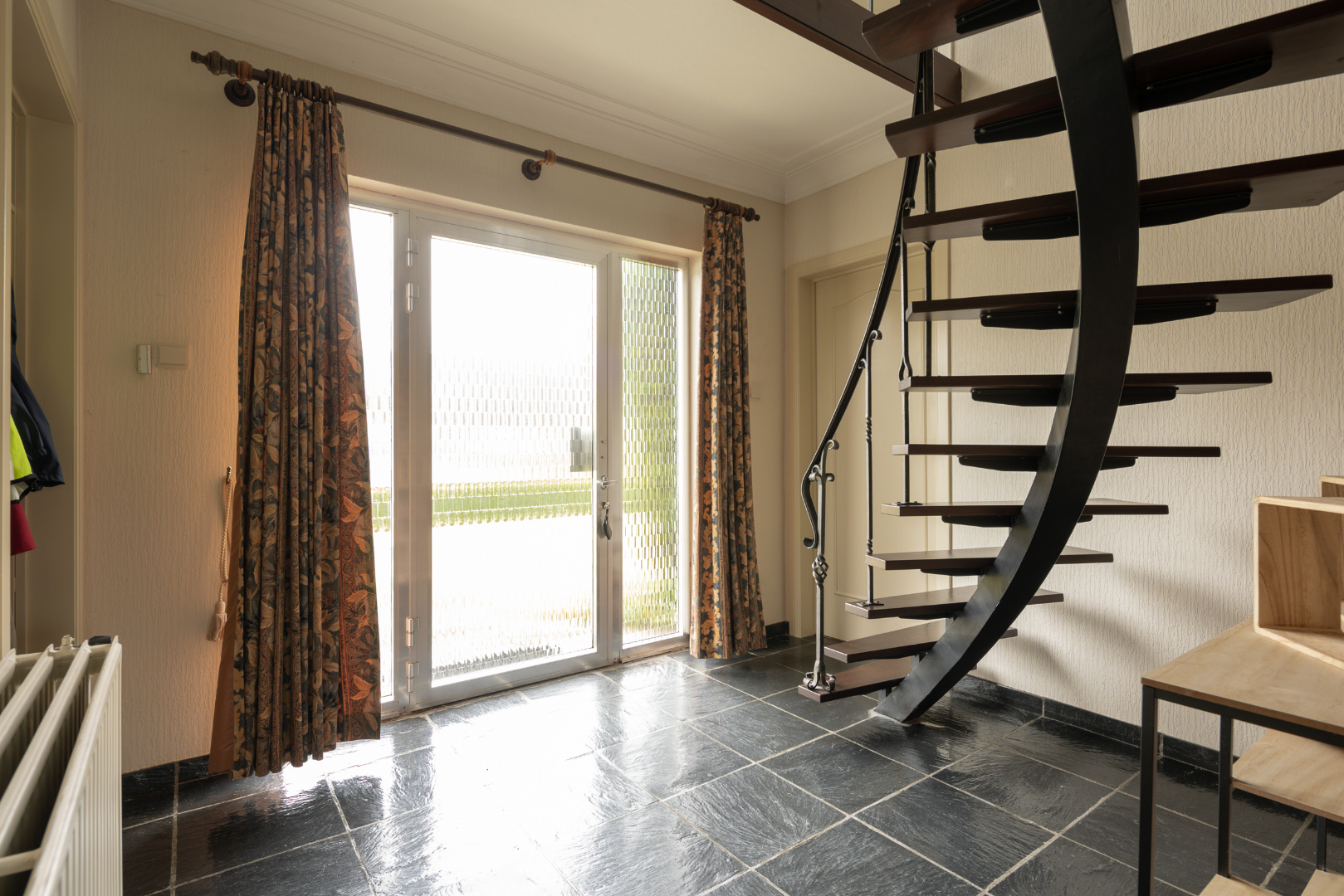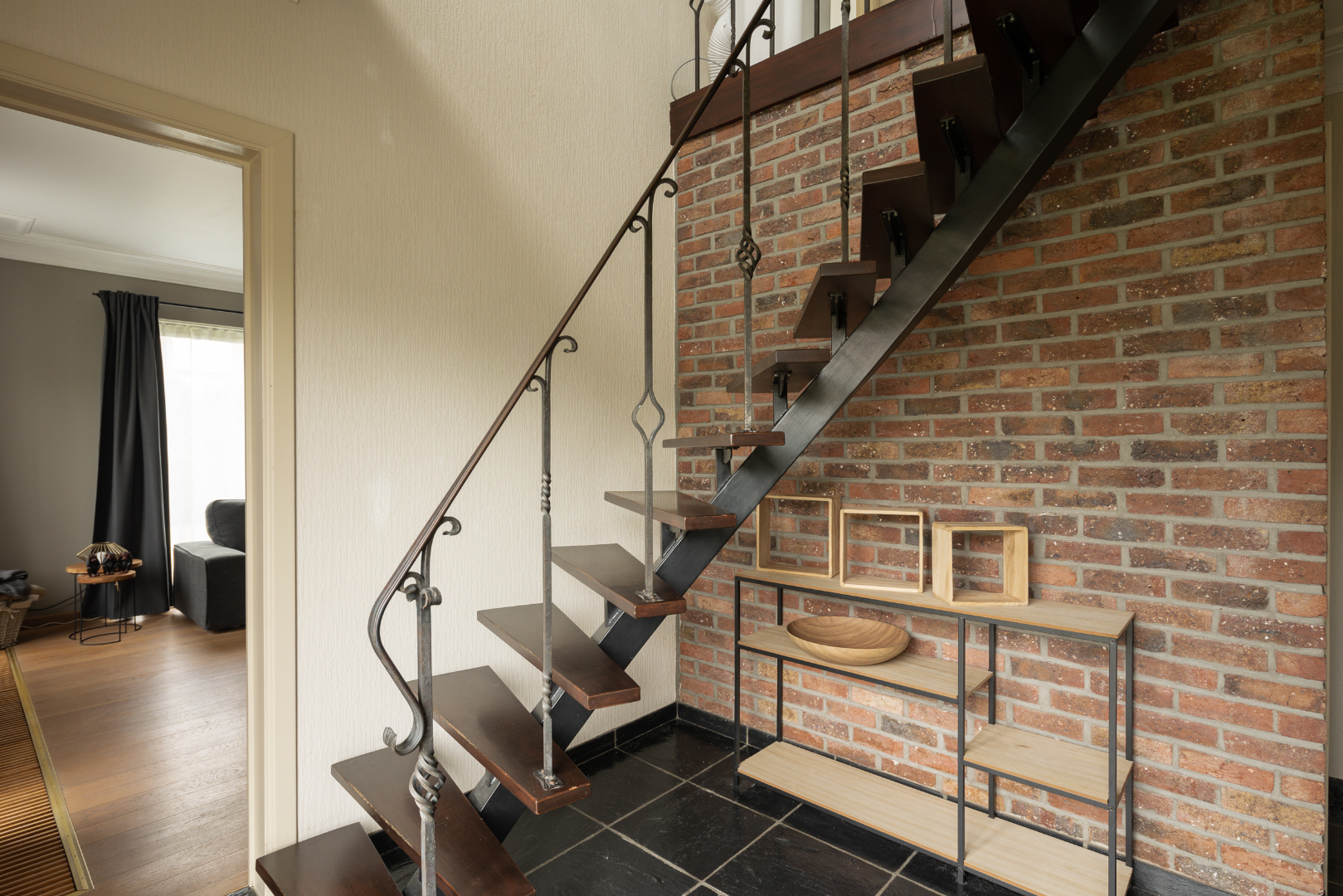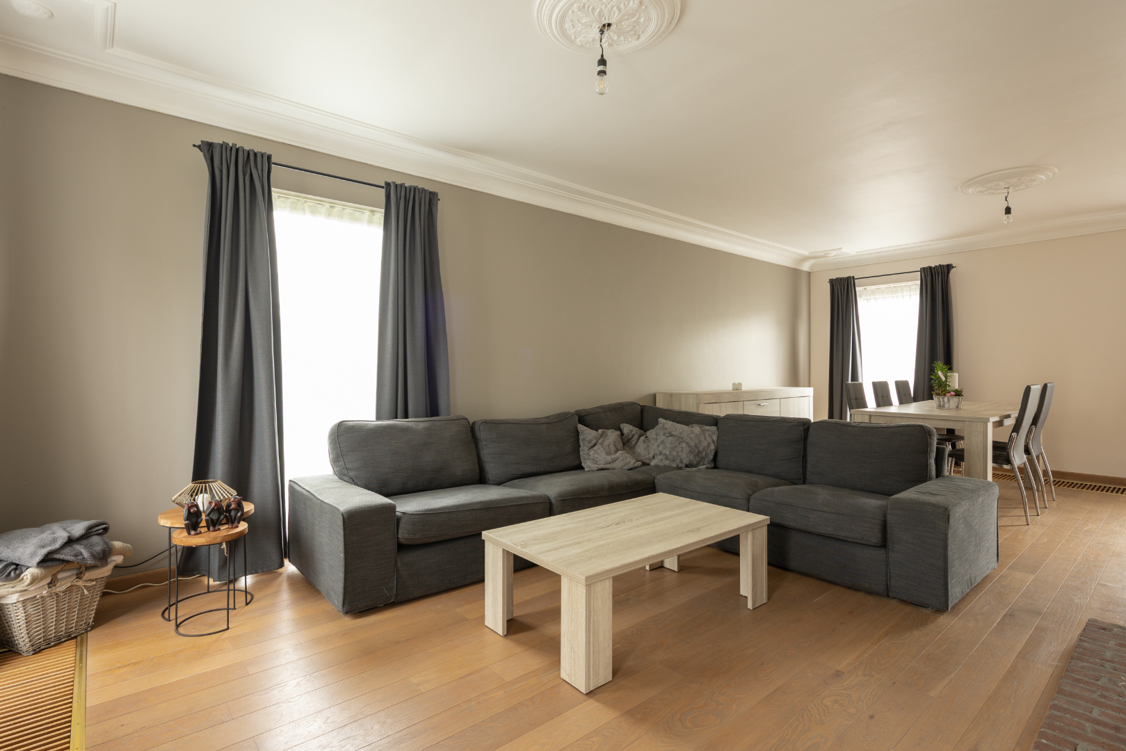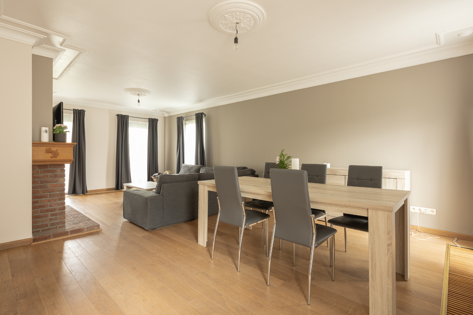 Indeling gelijkvloers: ruime inkomhal (12,6 m²) met vloer in Portugese leisteen, een apart toilet en de trap. In de woonkamer (37,5 m²) met eetplaats en salon ligt een mooie parketvloer. De keuken heeft een ruime eethoek. Via het halletje (1,6 m²) aan de achterdeur komt men in de 1ste badkamer (5 m²) met recent vernieuwde douche en lavabo met meubel. Hiernaast is er toegang tot de wasplaats (6,5 m²) met hoogrendementsverwarmingsketel (2013). Vooraan de woning bevindt zich een bureel/5de slaapkamer.