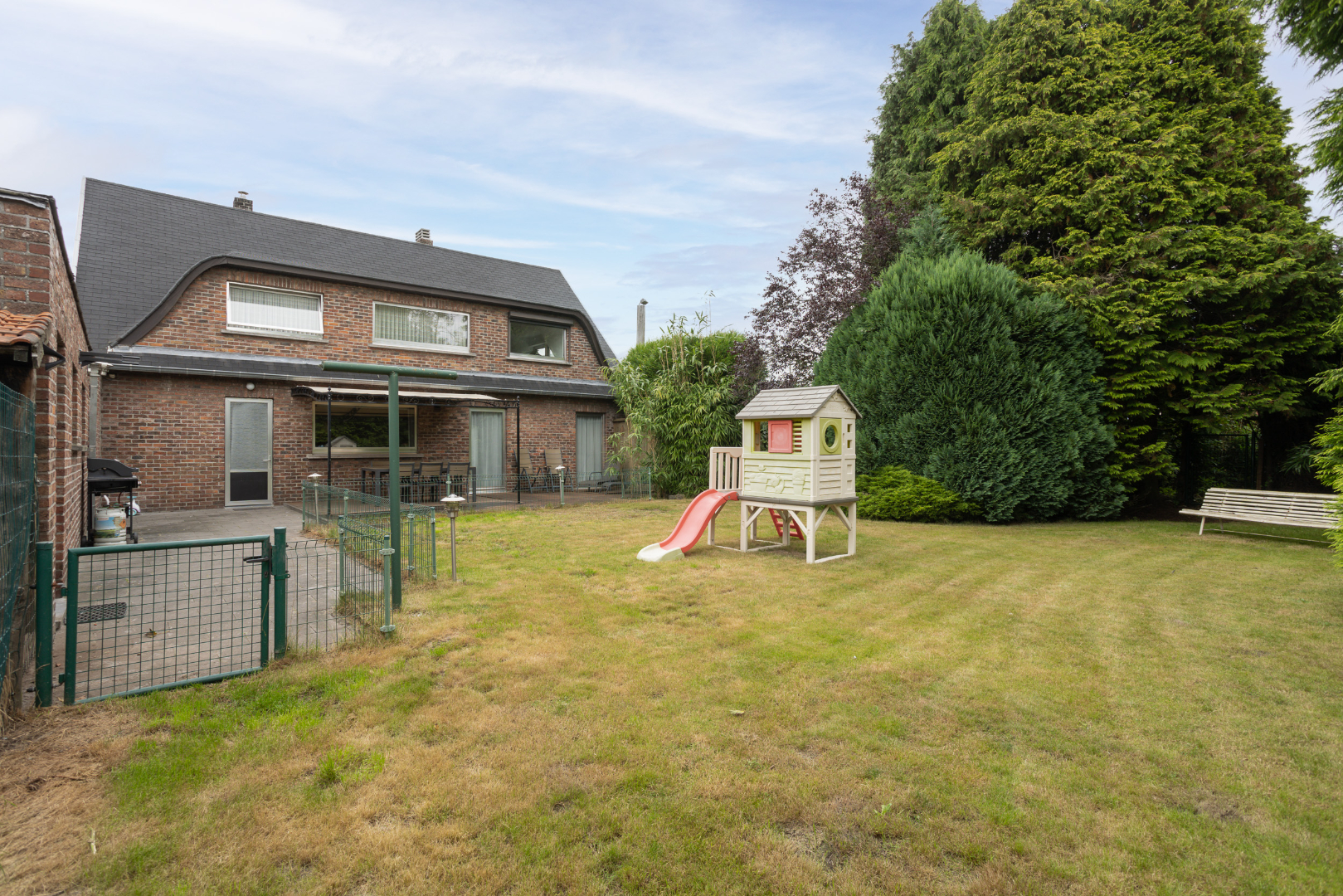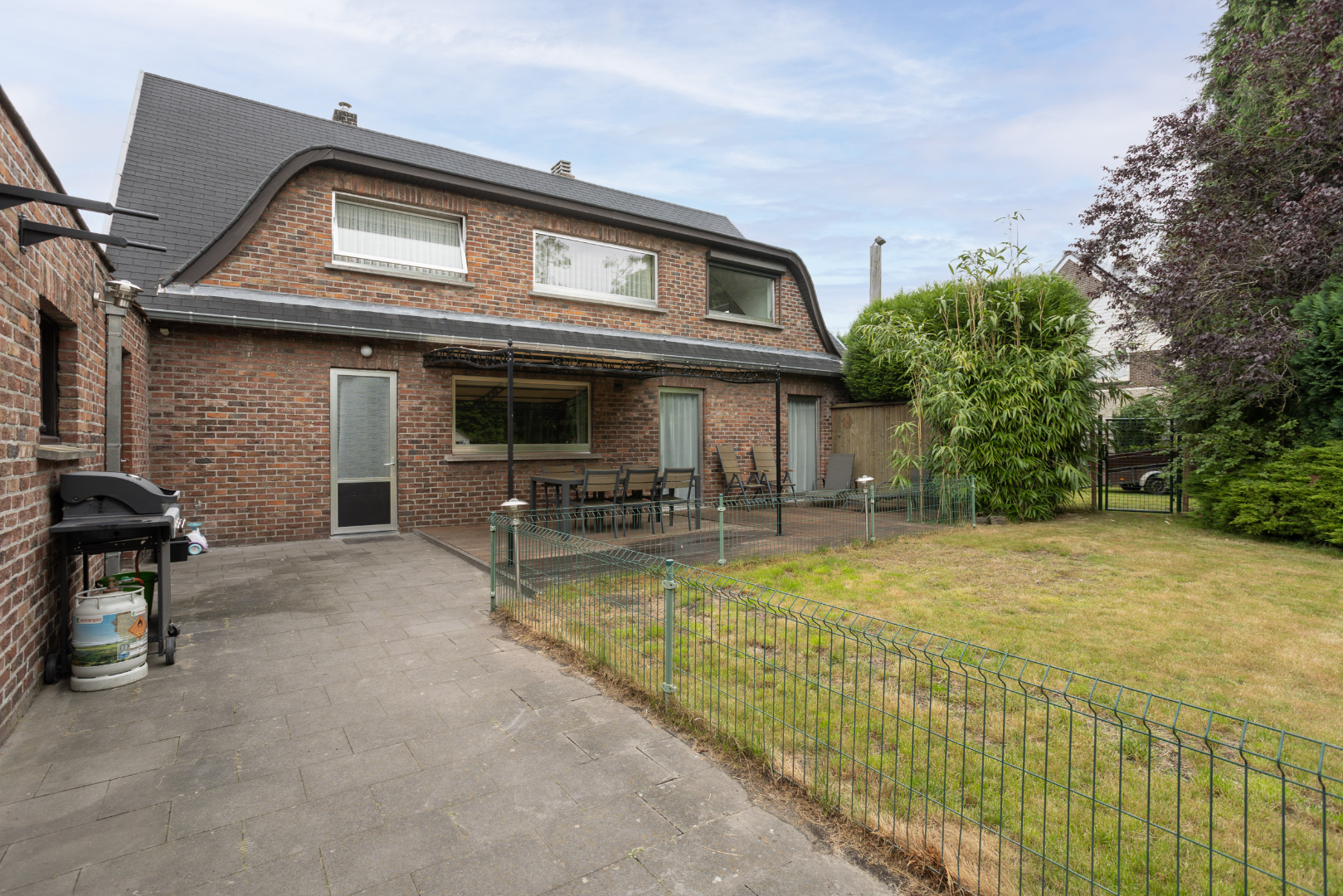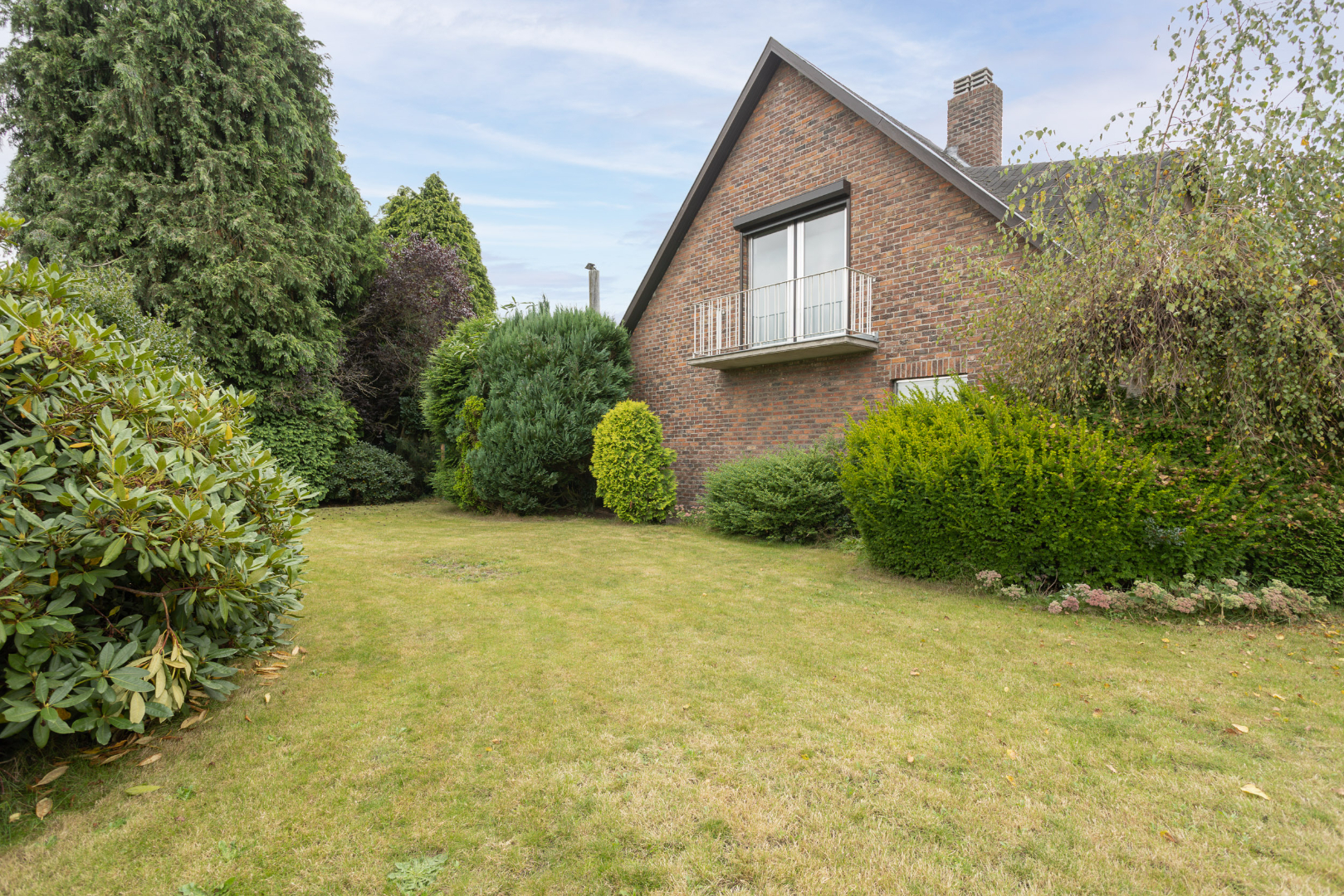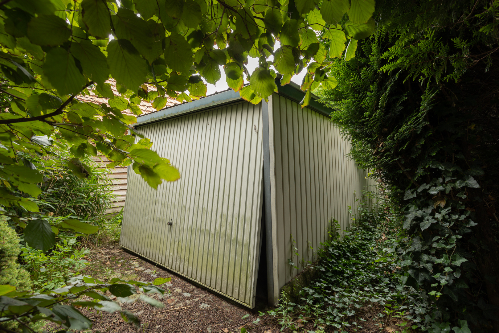 De achterkant van de woning, met terras en groot gazon, is zuidelijk georiënteerd. Vrijstaande garage met elektrische poort (35 m²). Achter in de tuin ligt een met bomen afgeschermde garagebox die dienst doet als opbergplaats.