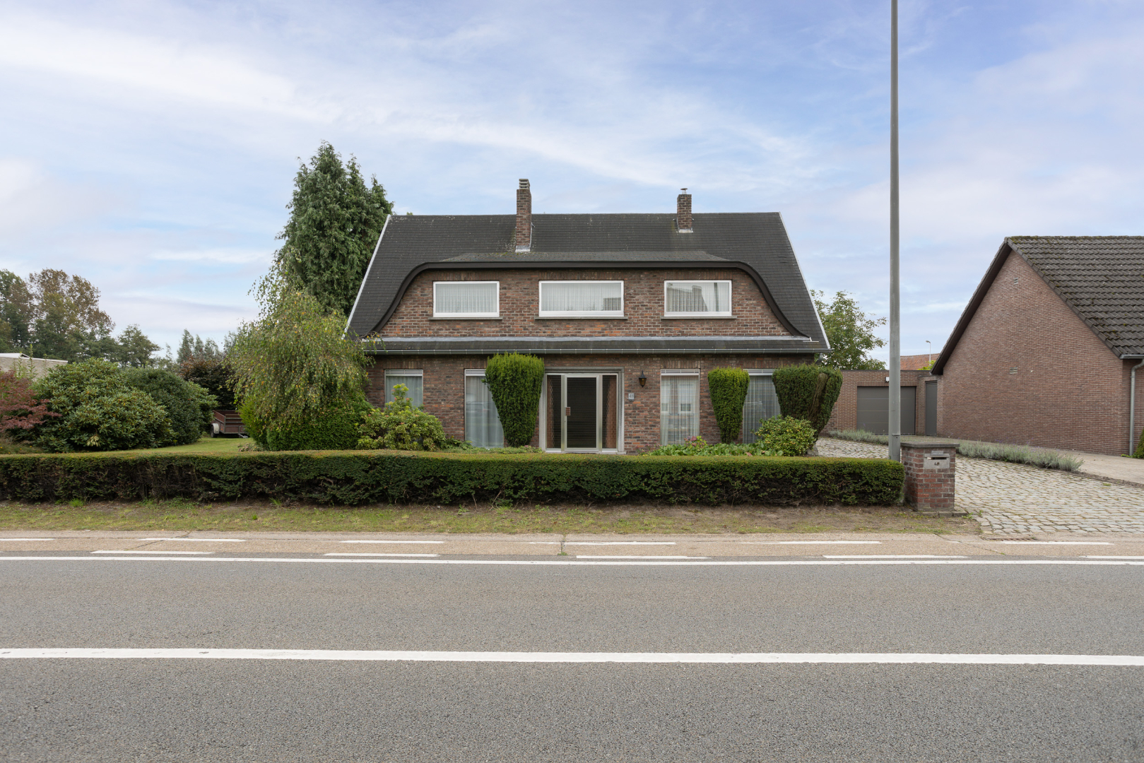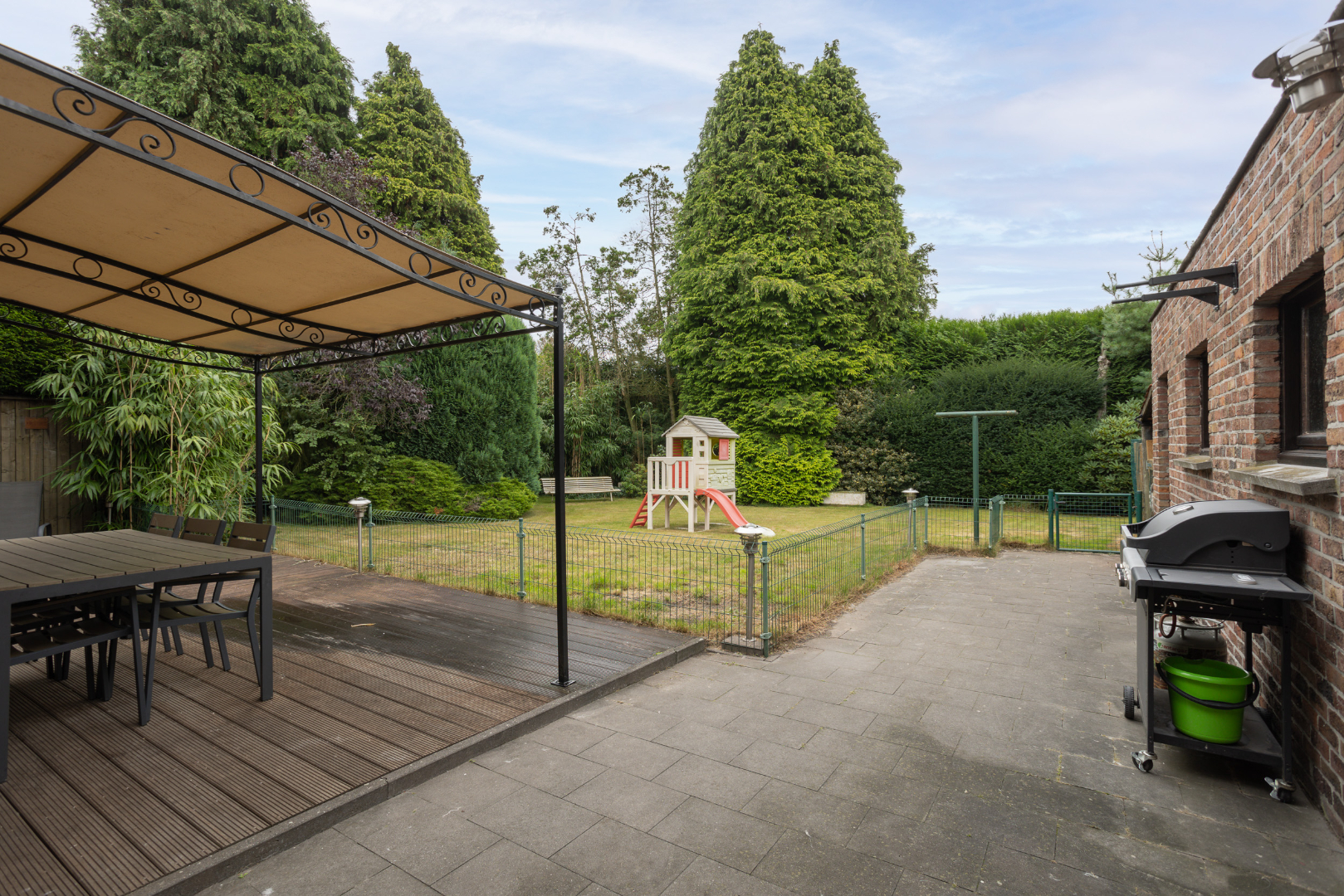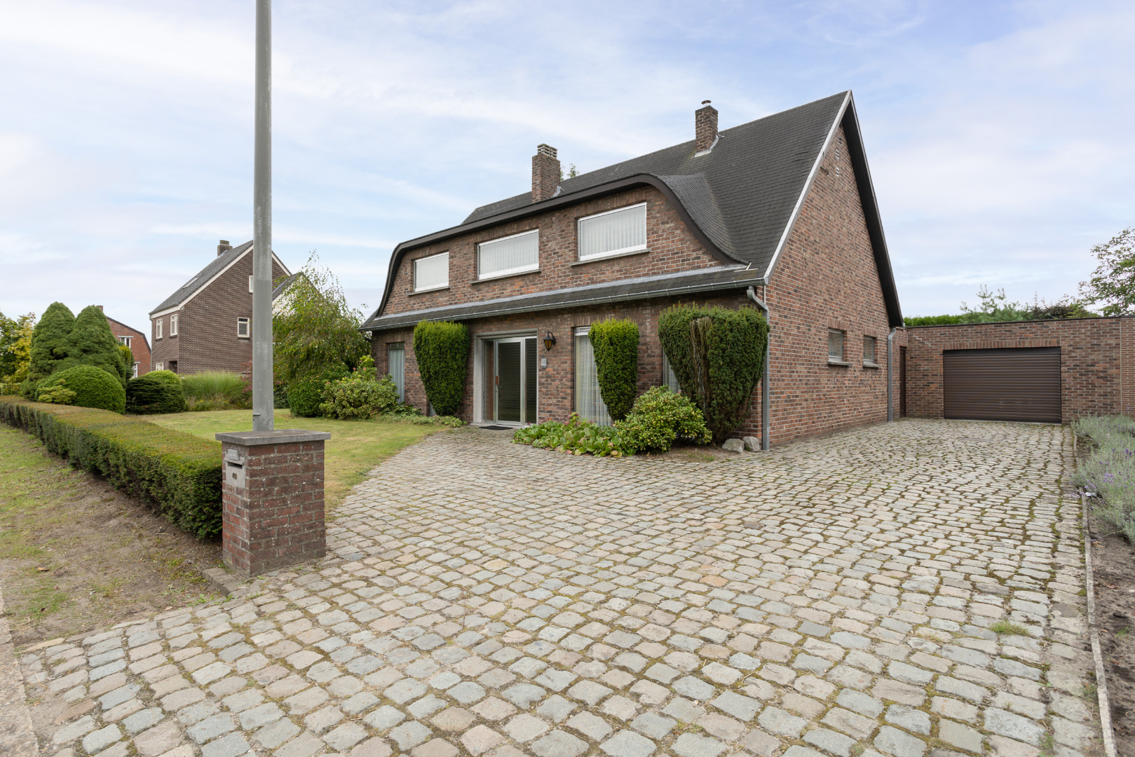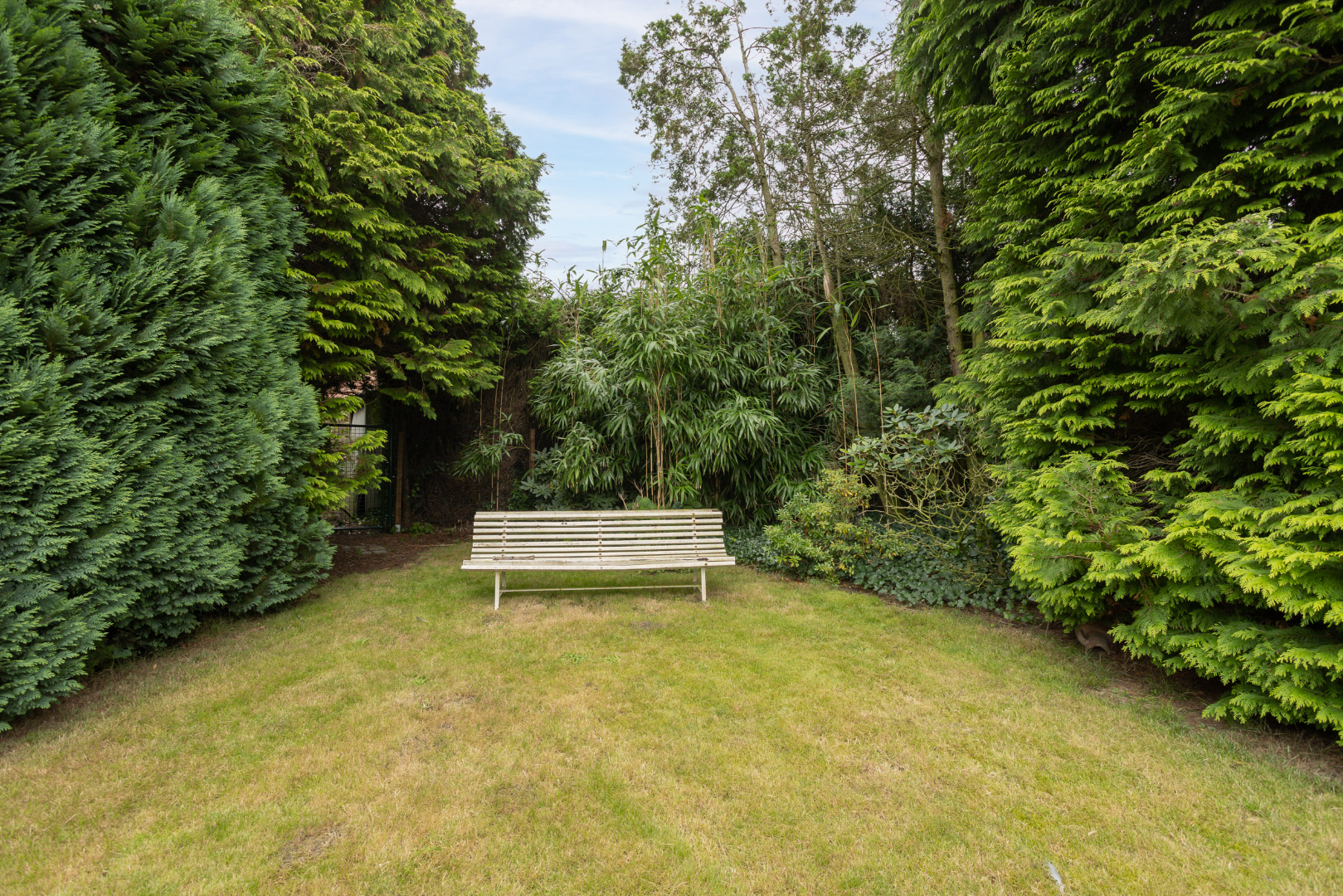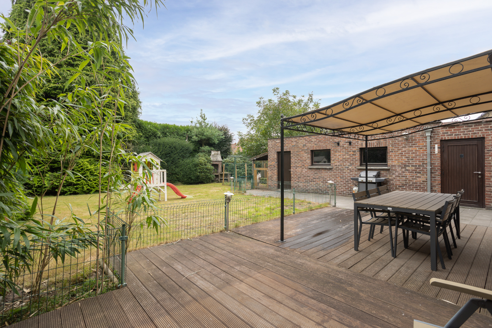 De achterkant van de woning, met terras en groot gazon, is zuidelijk georiënteerd. Vrijstaande garage met elektrische poort (35 m²). Achter in de tuin ligt een met bomen afgeschermde garagebox die dienst doet als opbergplaats.