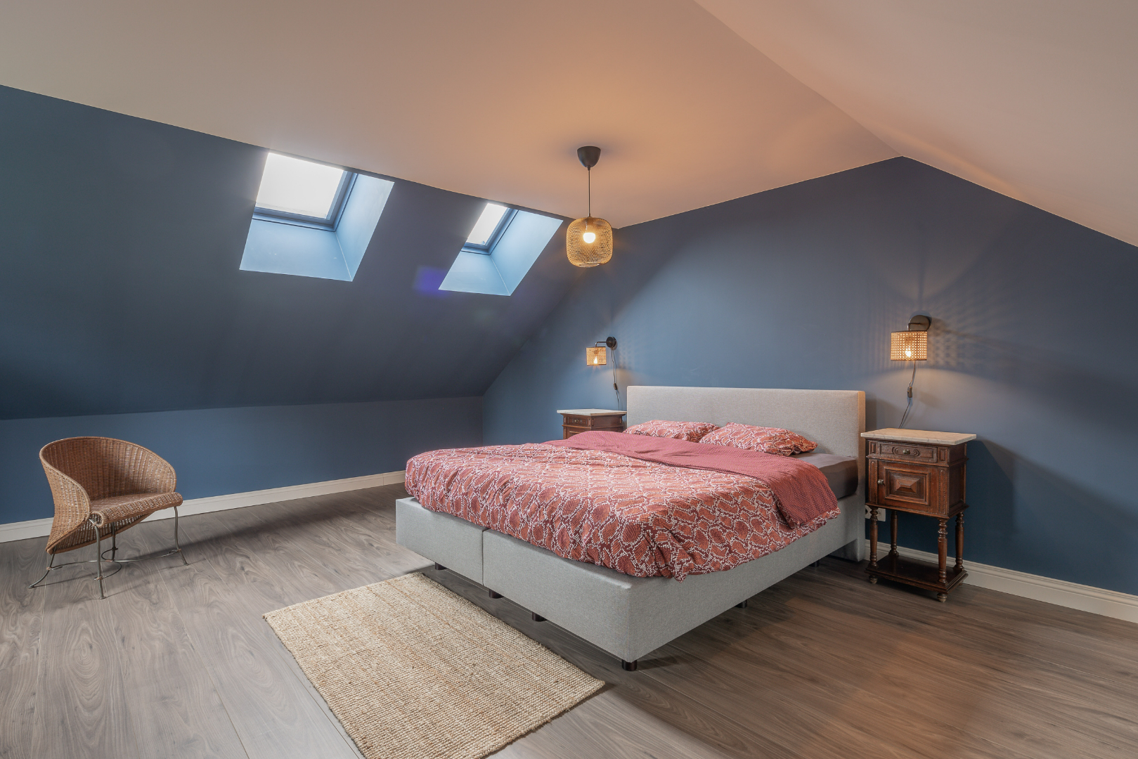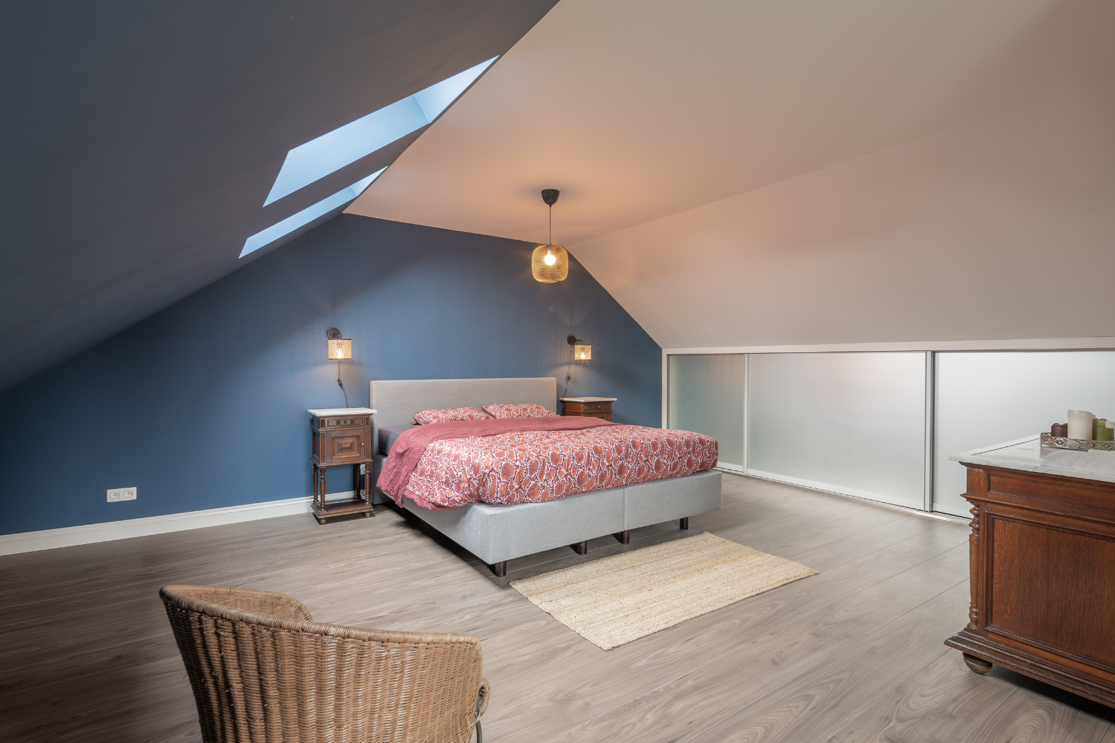 Boven bevindt zich een zeer grote slaapkamer met inbouwkasten. Ook hier werd alles recent vernieuwd. Verder is de stroom ook volledig conform gekeurd en bedraagt de EPC slechts 141 (spouwmuurisolatie, dakisolatie en hoogrendementsglas).