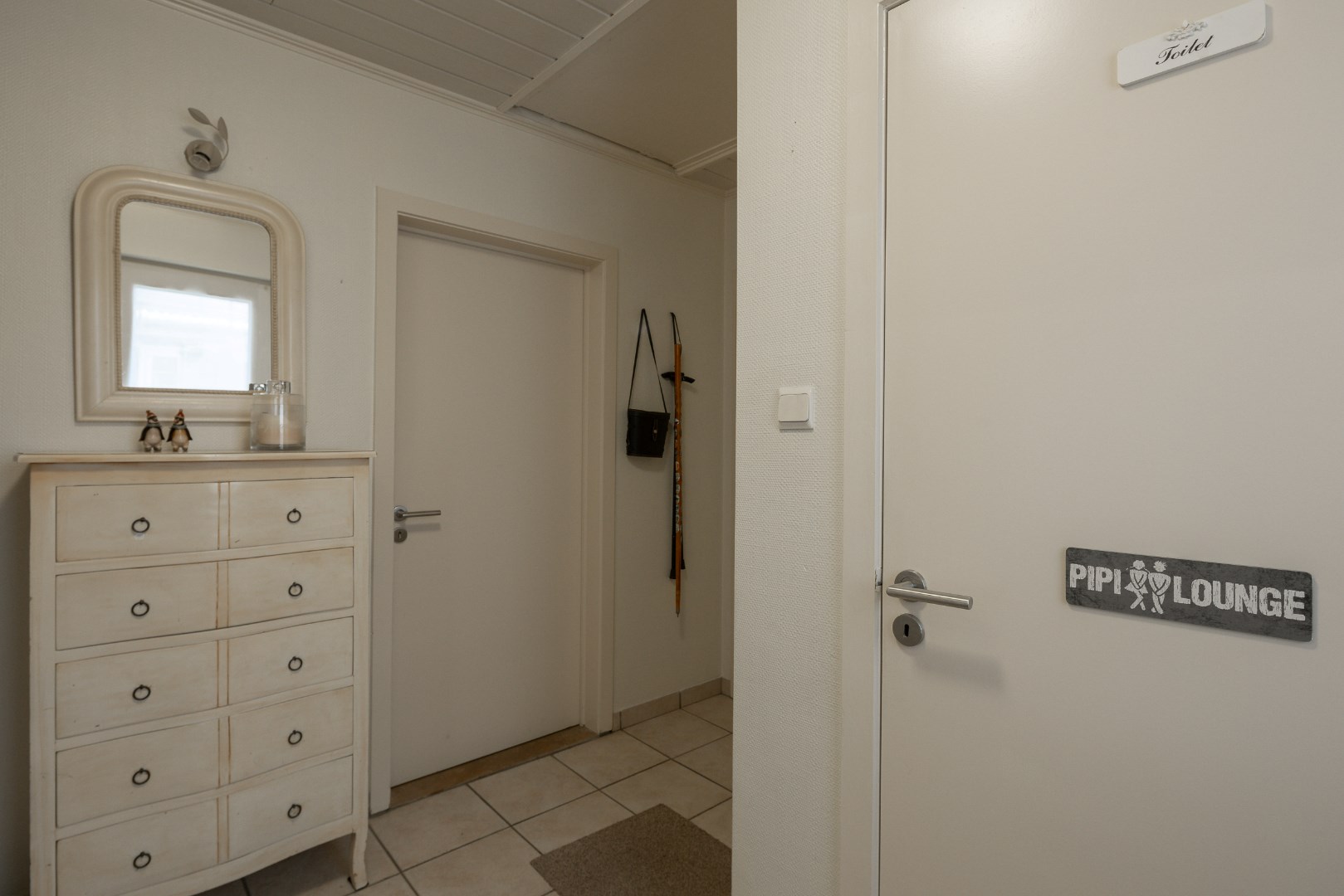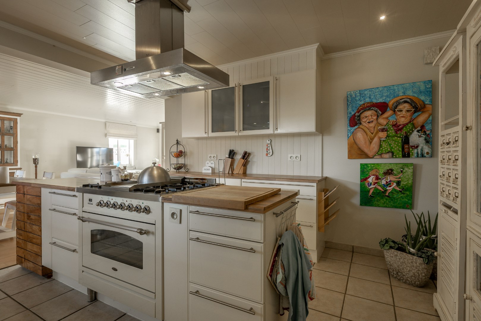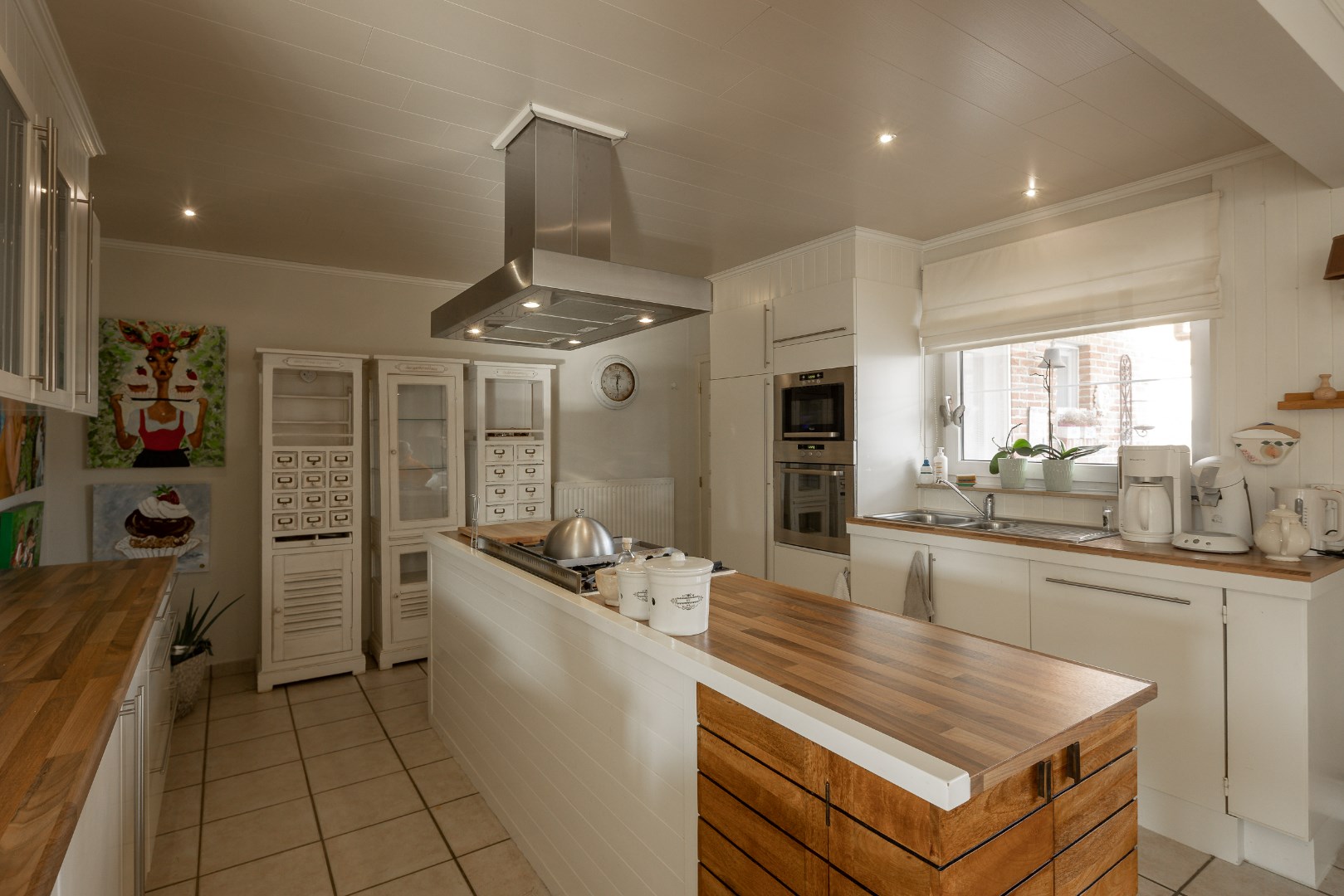 De woning is voorzien van een ruime hal die toegang geeft tot quasi alle ruimtes. De eerste ruimte die bereikbaar is, is de open leefruimte met keuken. Deze ruimte is in totaal meer dan 50m² groot. Het fijne is dat vanuit deze ruimte direct aansluiting is met de tuin. In de leefruimte ligt een mooie parket en de keuken is voorzien van een tegelvloer. Het is een goed uitgeruste keuken met een Boretti fornuis.