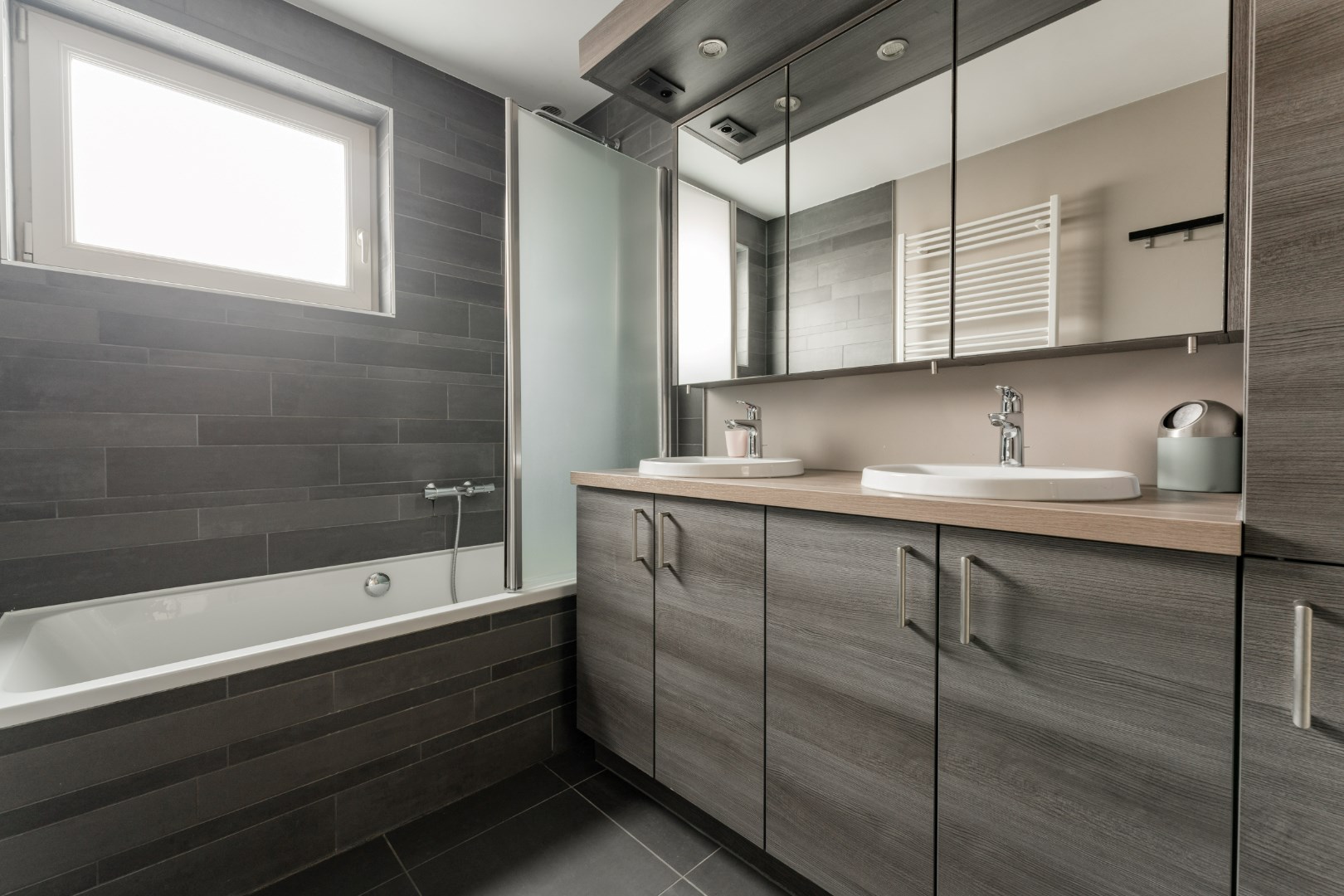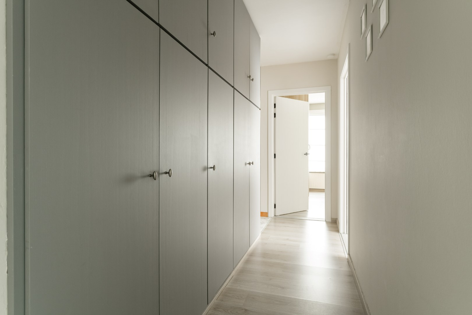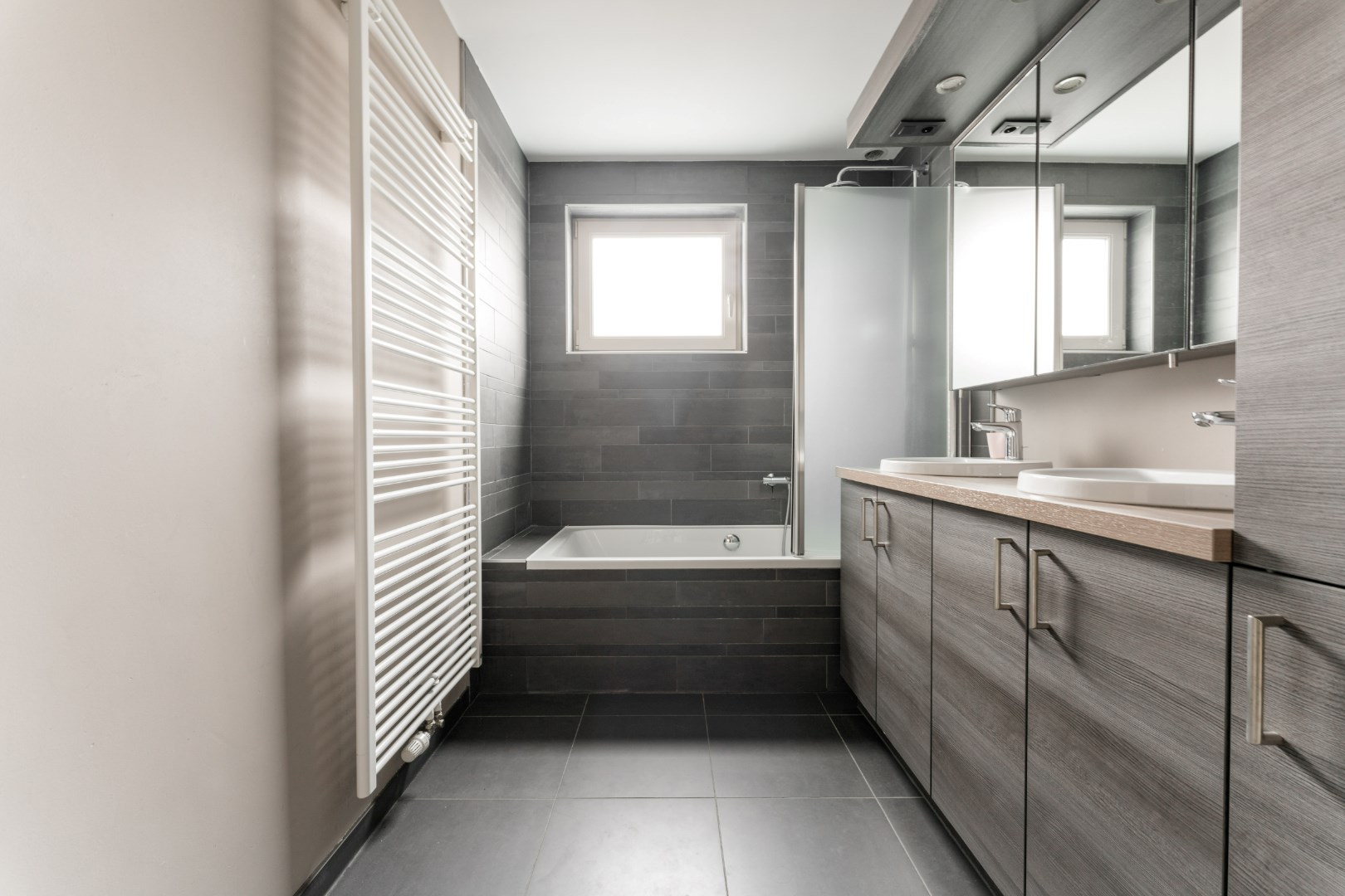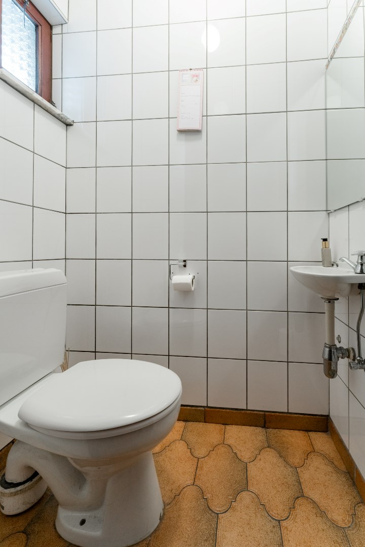 Verder kunnen we vanuit de inkomhal ook naar het aparte toilet, de drie slaapkamers, de nette gerenoveerde badkamer met dubbele lavabo, en combi bad-douche, de berging alsook de ruime garage.