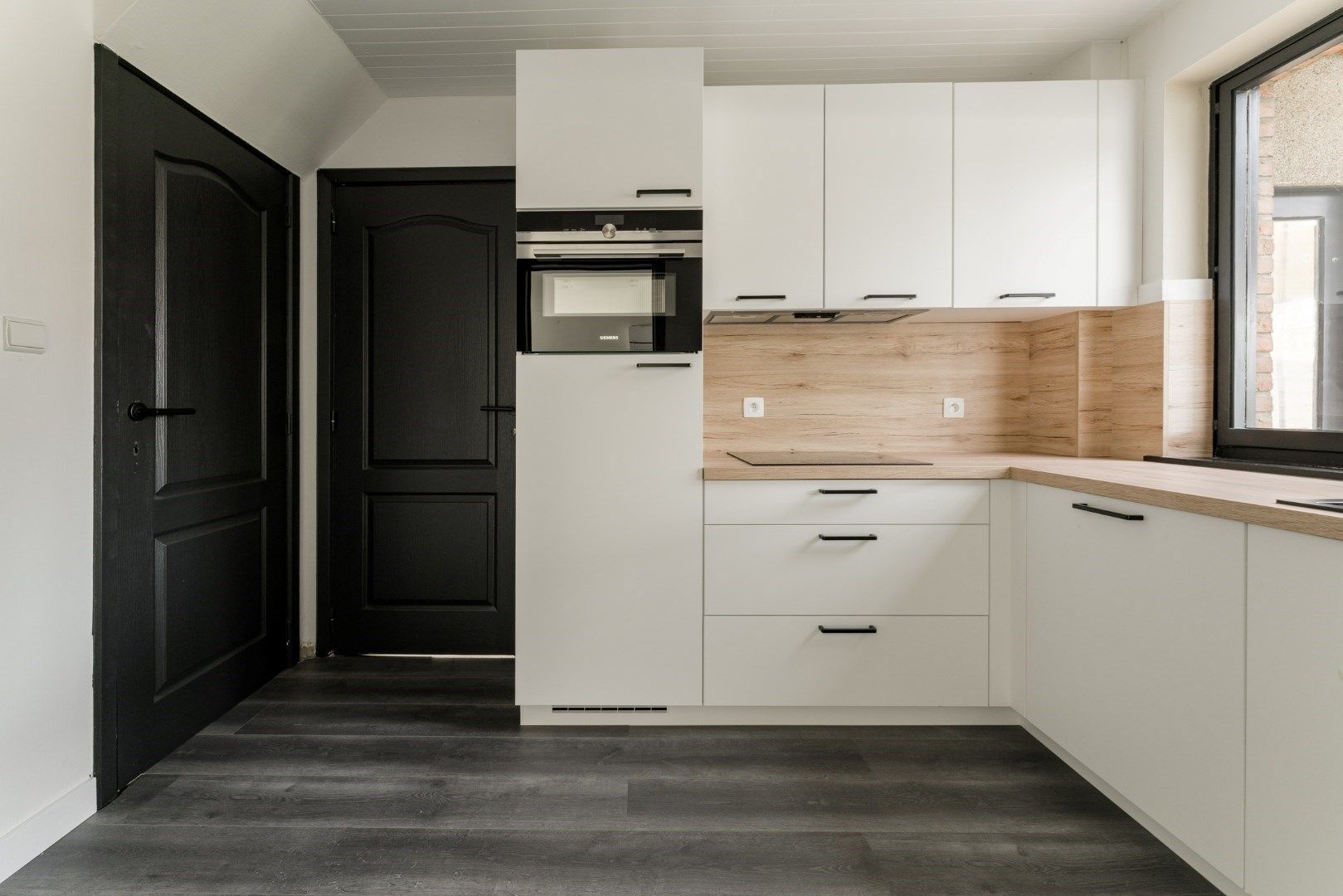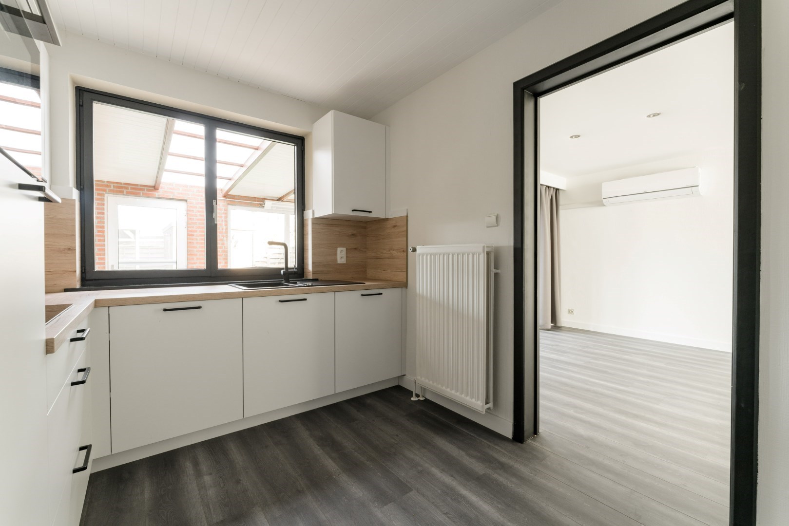 Deze woning beschikt gelijkvloers over een inkomhal, woonkamer, nieuwe keuken, berging, inpandige garage en veranda. De vloeren, muren en plafonds zijn vernieuwd alsook de keuken is volledig gerenoveerd. Uiteraard is er ook gelijkvloers een toilet.
