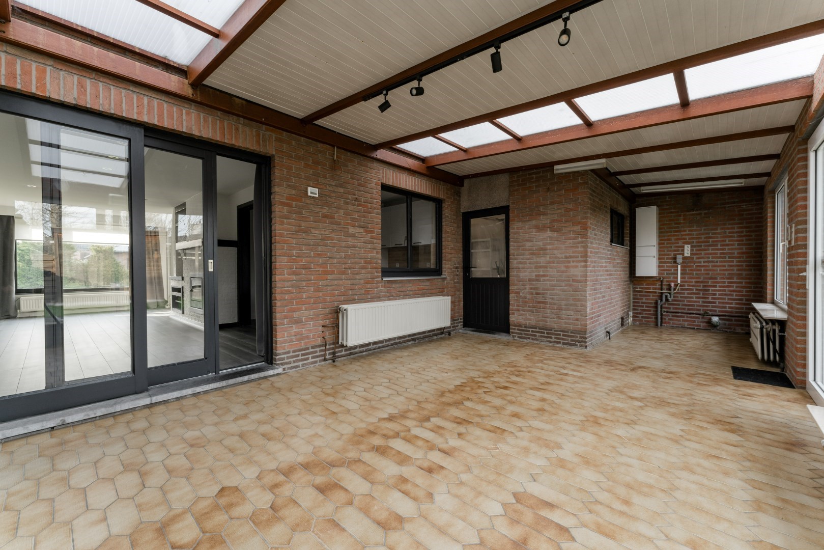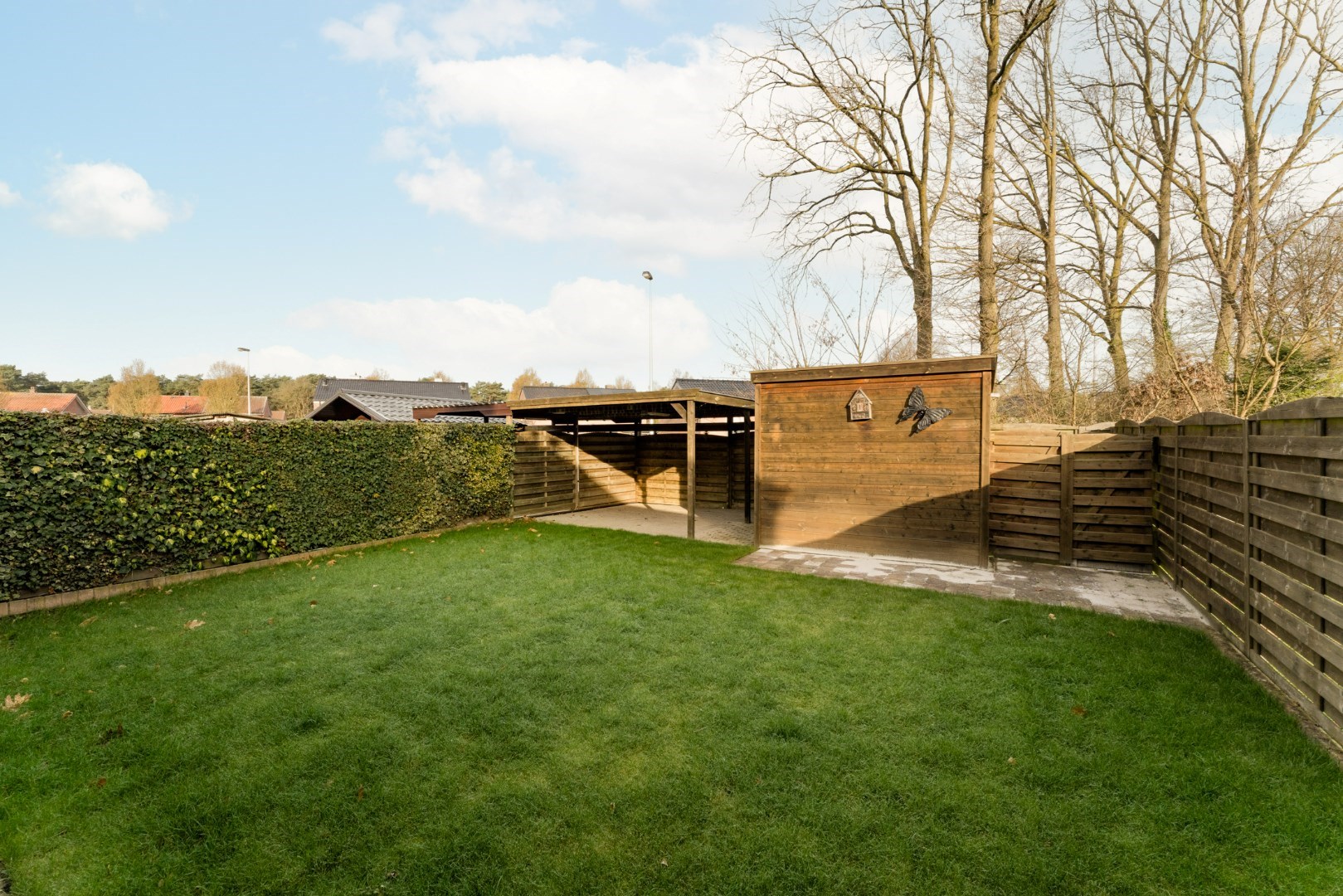 De tuin heeft een juiste verhouding van grasveld met verharding. Hier is een carport alsook tuinhuis voorzien.