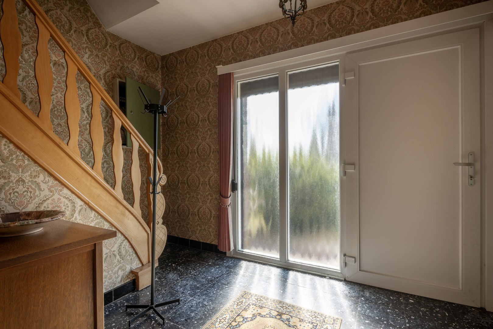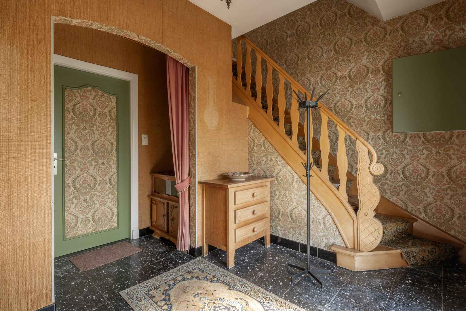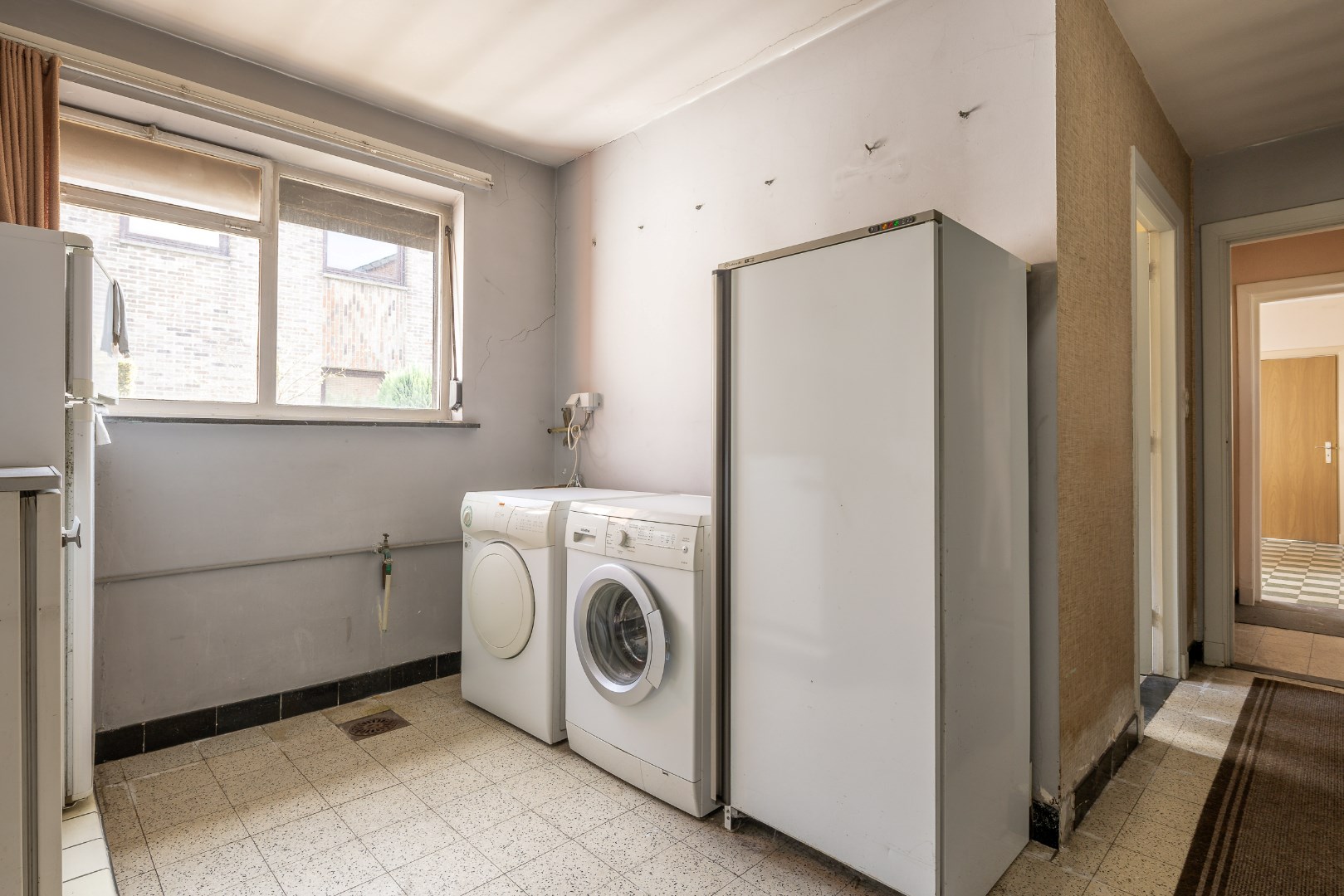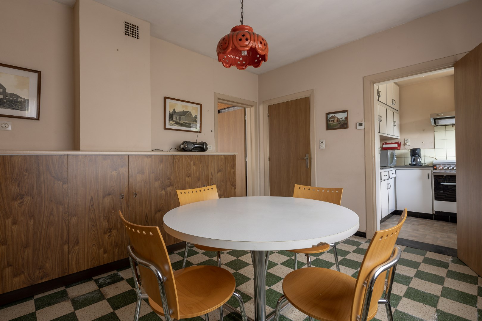 Gelijkvloers kunnen we vanuit de inkomhal naar de keuken of naar het verdiep. De keuken heeft de voorziening voor een eetkamer te plaatsen en grenst aan een ruime leefruimte. Vervolgens is er de gang naar achteren voor de badkamer, het aparte toilet, de diverse bergruimtes en de achterdeur.