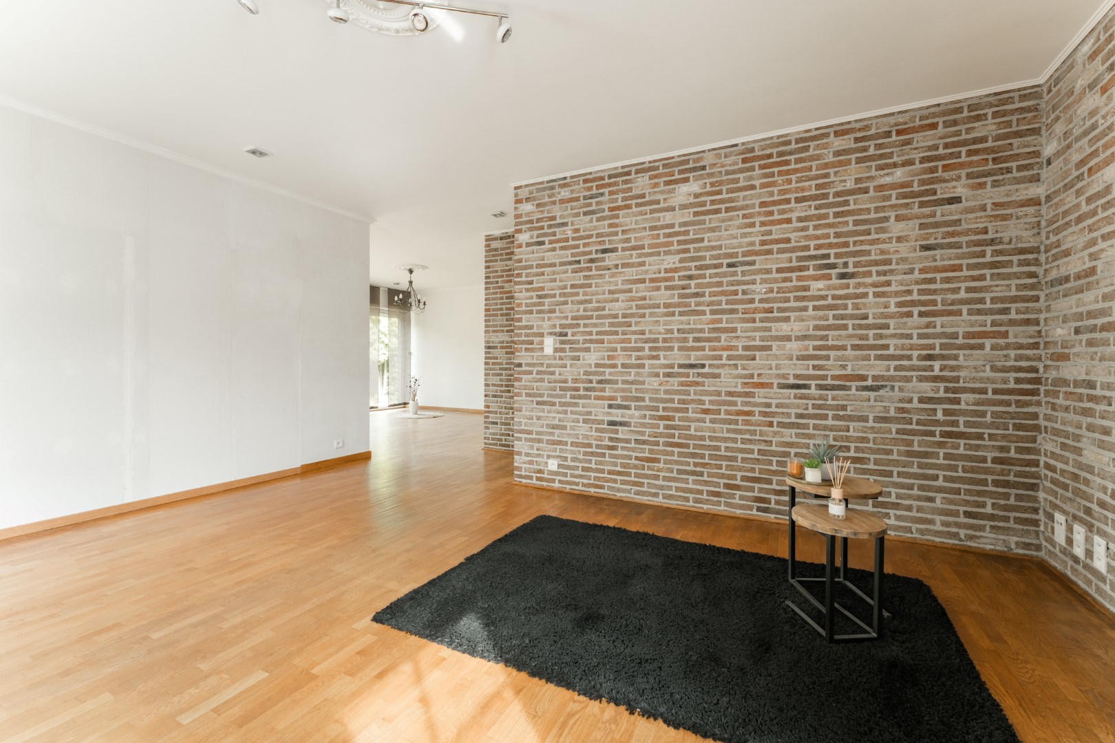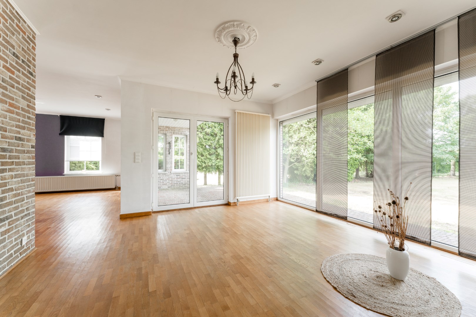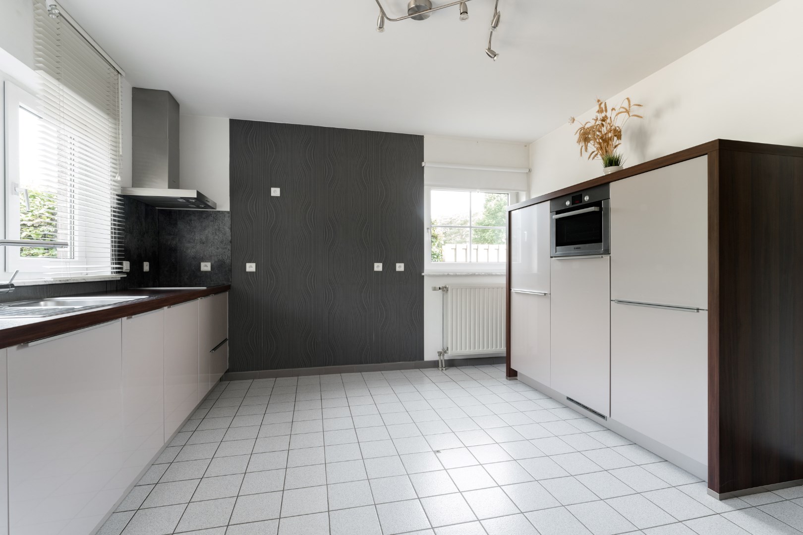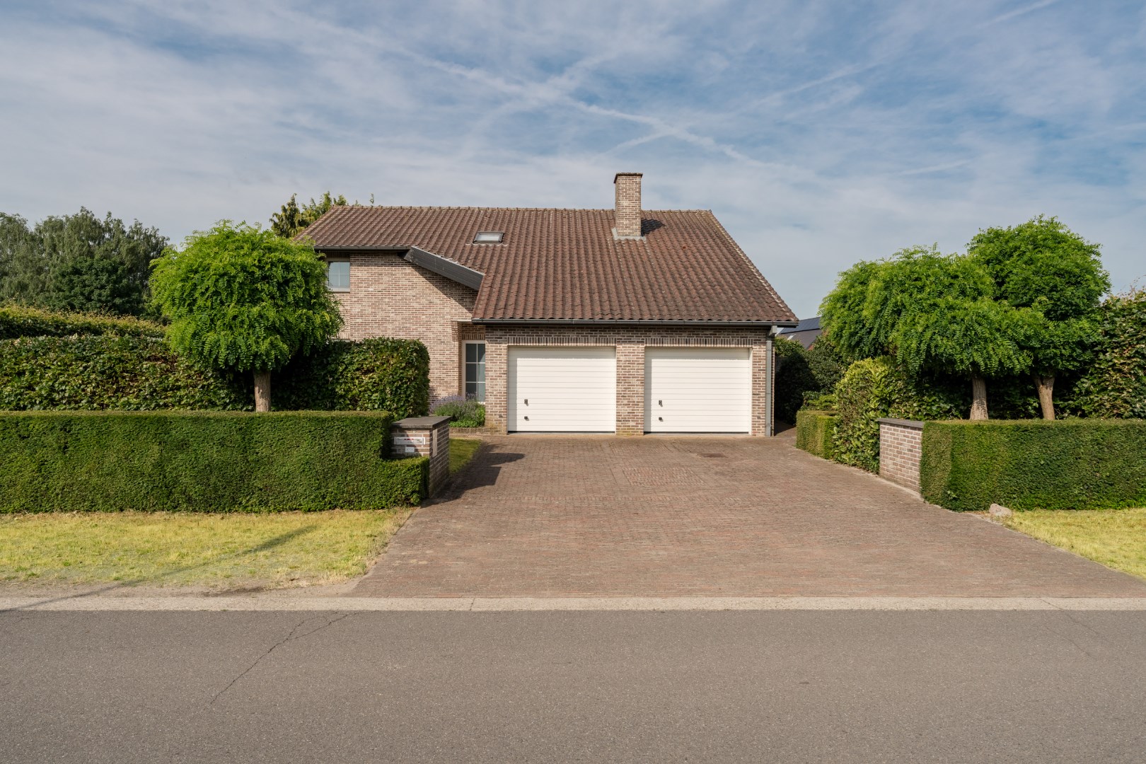 Eenmaal we de woning binnenkomen via de inkomhal, valt de smeedijzeren trapleuning en granieten trap direct op. Het is een ruime hal, die aansluiting geeft naar het toilet, de dubbele inpandige garage, de leefruimte alsook het verdiep via de trap. Wanneer we in de leefruimte stappen, voelen we direct de lichtinval en aangename aansluiting met de tuin. De zit- en eethoek bevinden zich in een open ruimte en sluiten aan op het deels overdekte terras. Hier is een mooie parket voorzien. Naast deze ruimte vindt u de keuken terug, die in 2013 werd vernieuwd en zo goed als nieuw is. De keuken is voorzien van Bosch-toestellen zoals een inductievuur, vaatwasser, spoelbak, oven, koelkast en voldoende bergruimte.