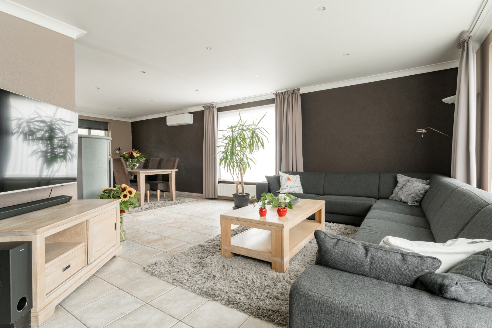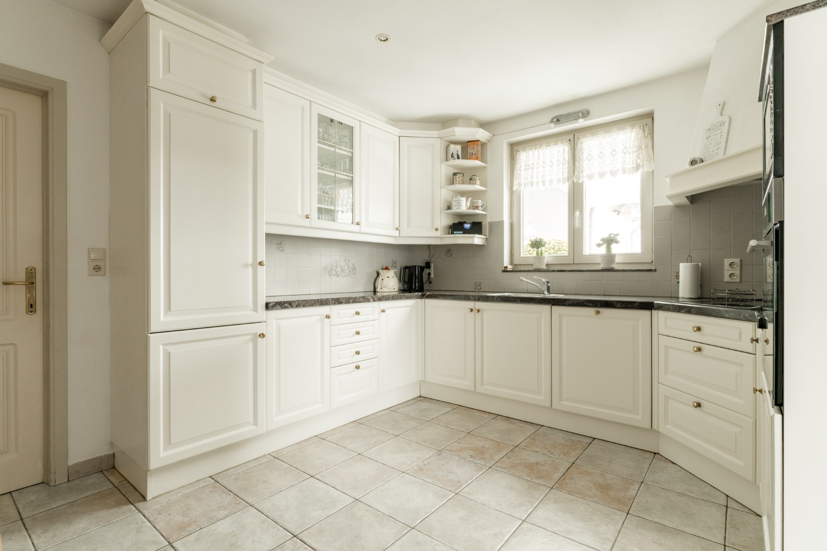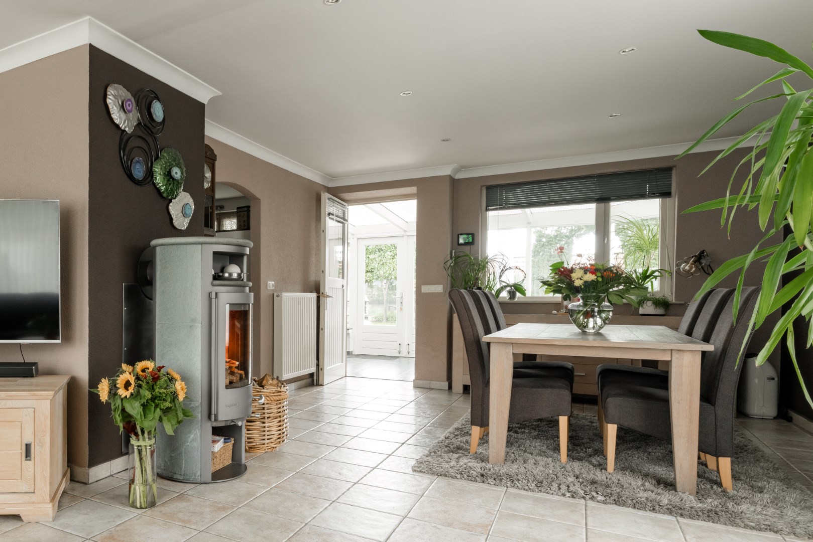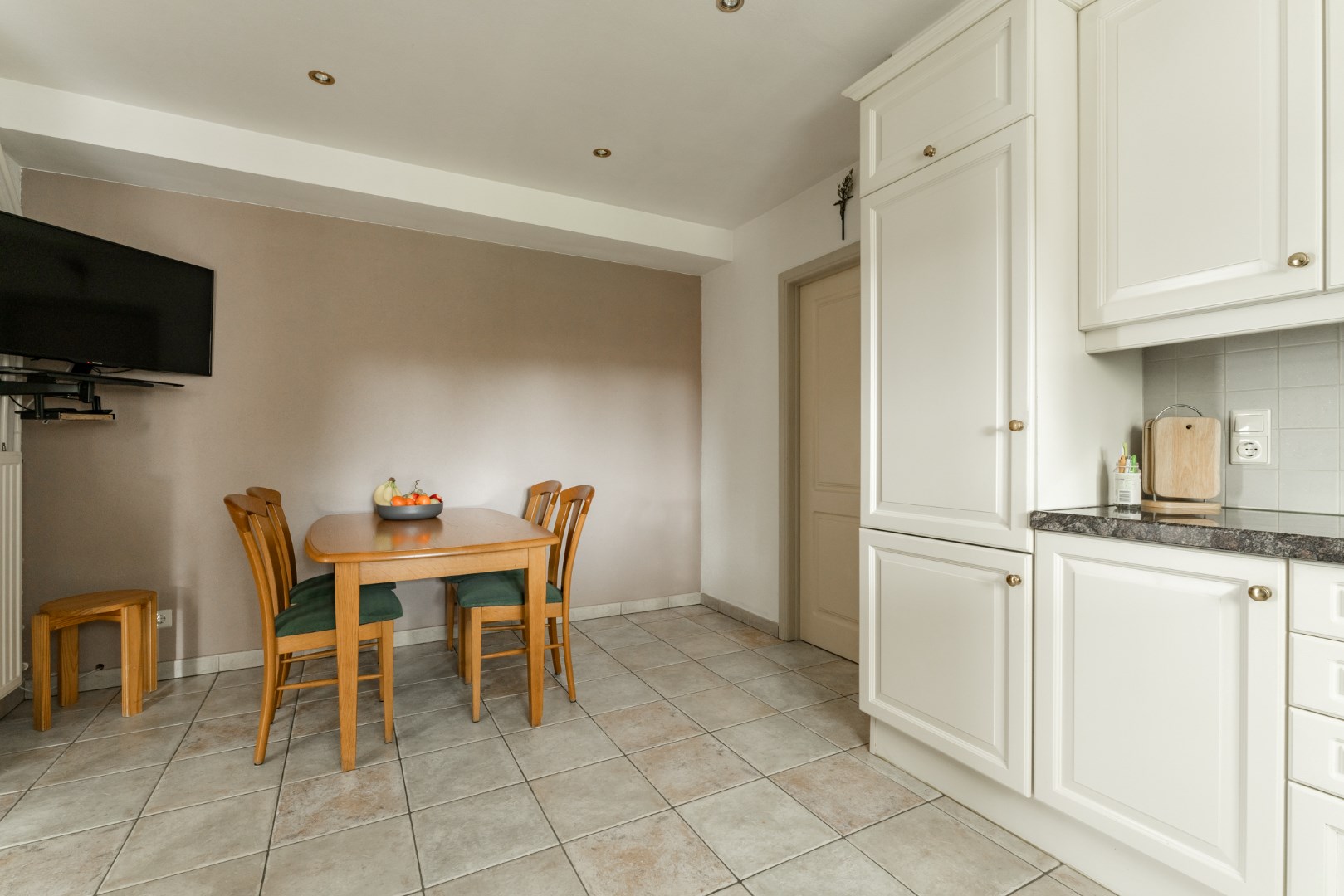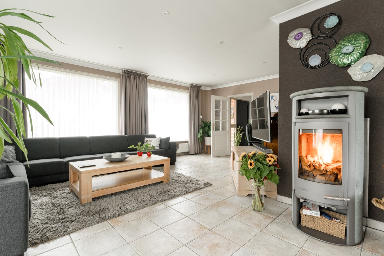 Wanneer we de woning betreden, merken we dat gelijkvloers alle voorzieningen aanwezig zijn. Zo is er uiteraard een ruime leefruimte met aanpalend de keuken. Deze is voorzien van een natuurstenen werkblad. In de leefruimte vinden we een houtkachel terug en merken we direct hoe lichtrijk deze woning is.
