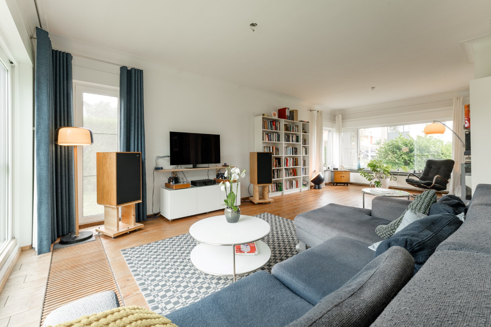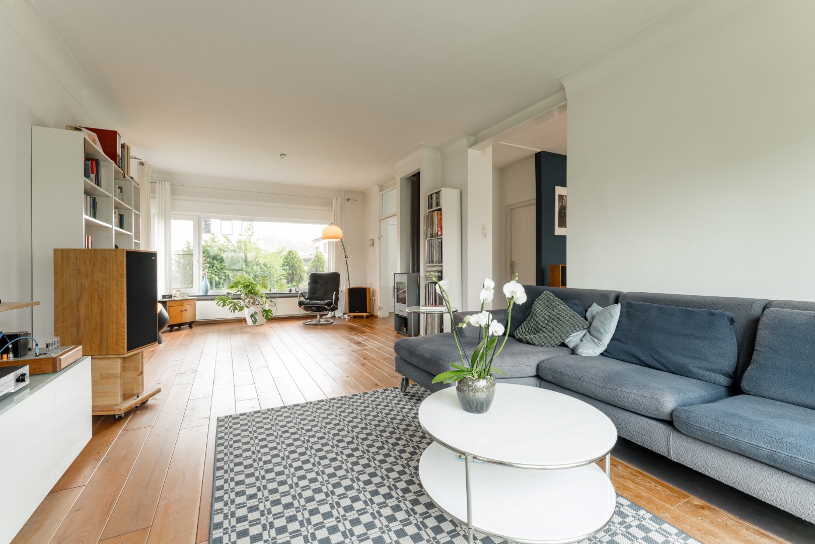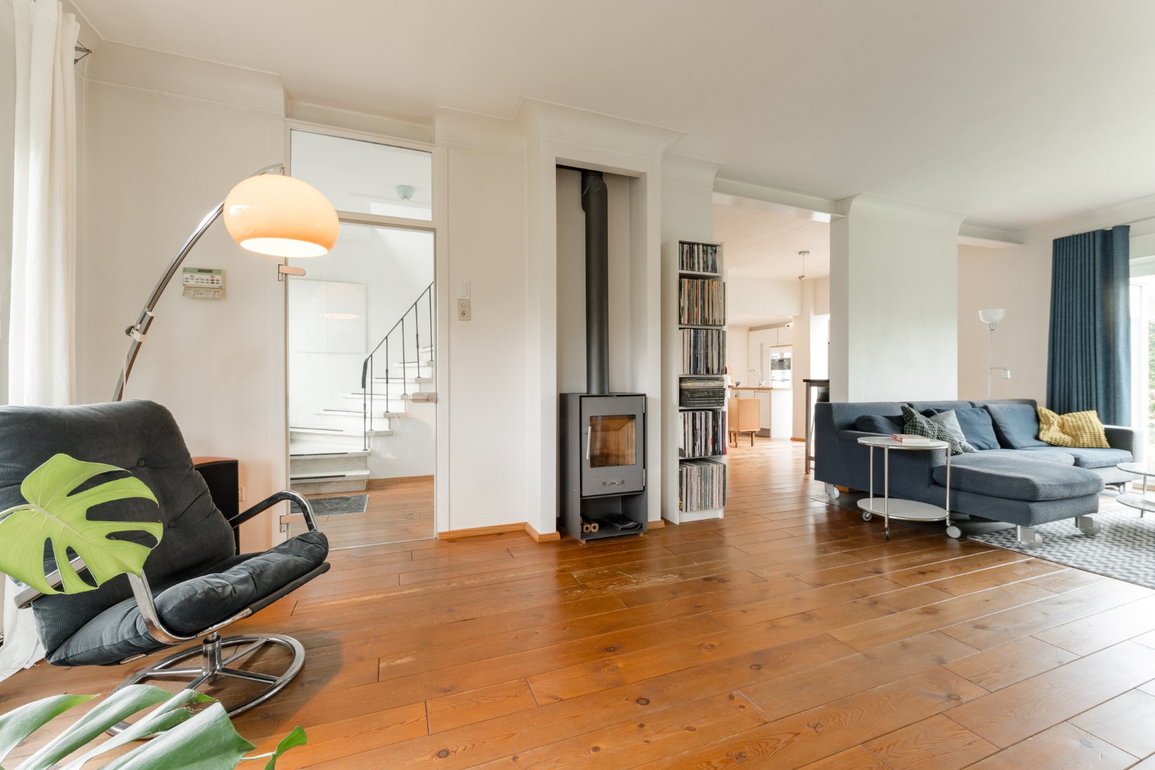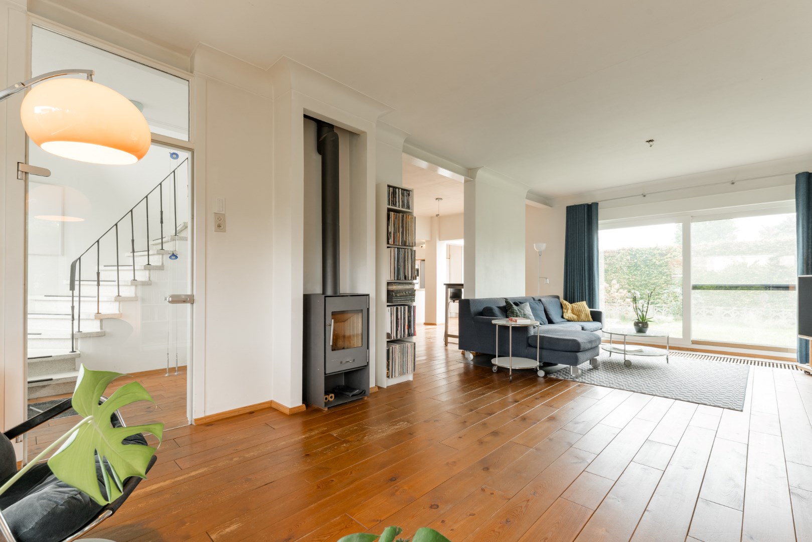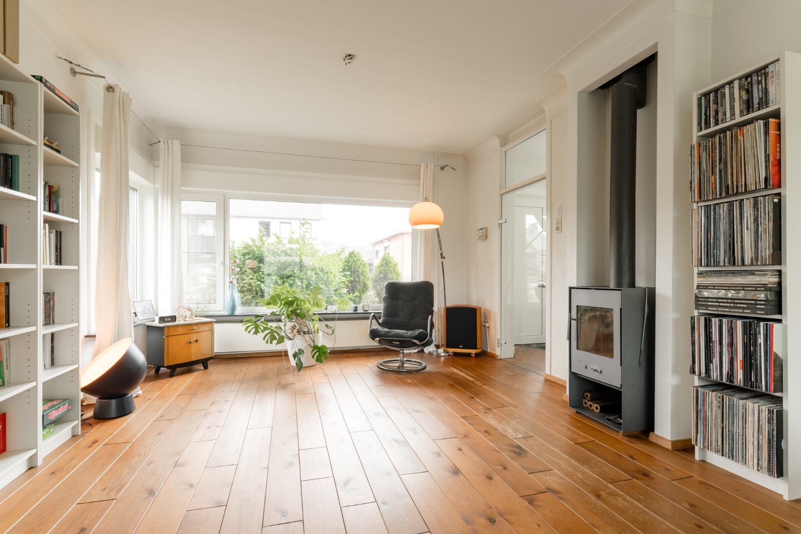 Als we de woning betreden, komen we terecht in een ruime lichtrijke inkomhal. Deze geeft toegang tot de leefruimte met een zit- en eethoek. Het is een zeer lichtrijke en warme leefruimte met open keuken en eiland. Er is centraal een houtkachel voorzien en er ligt echte parket in de living.