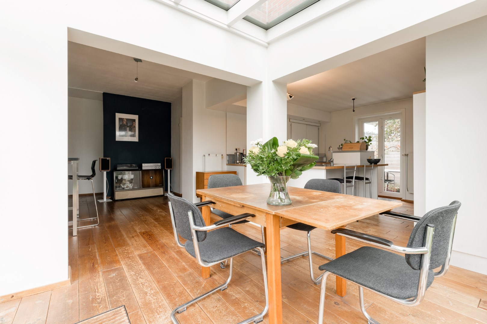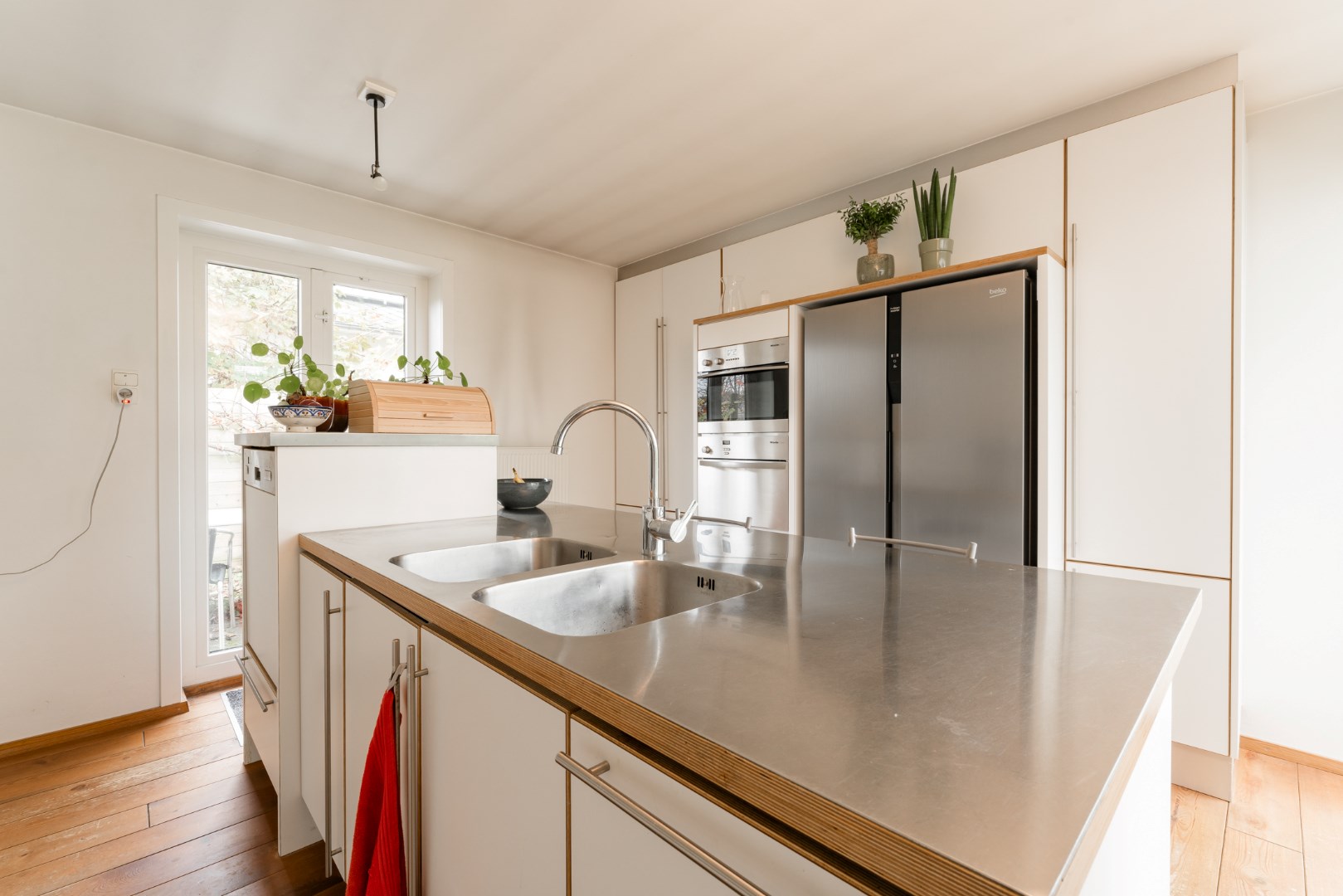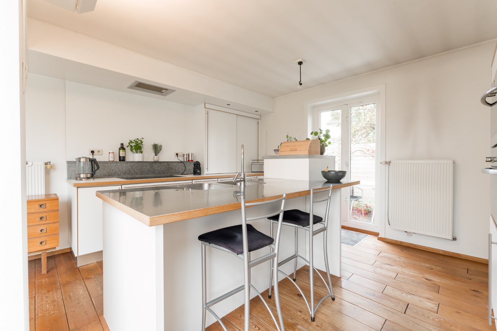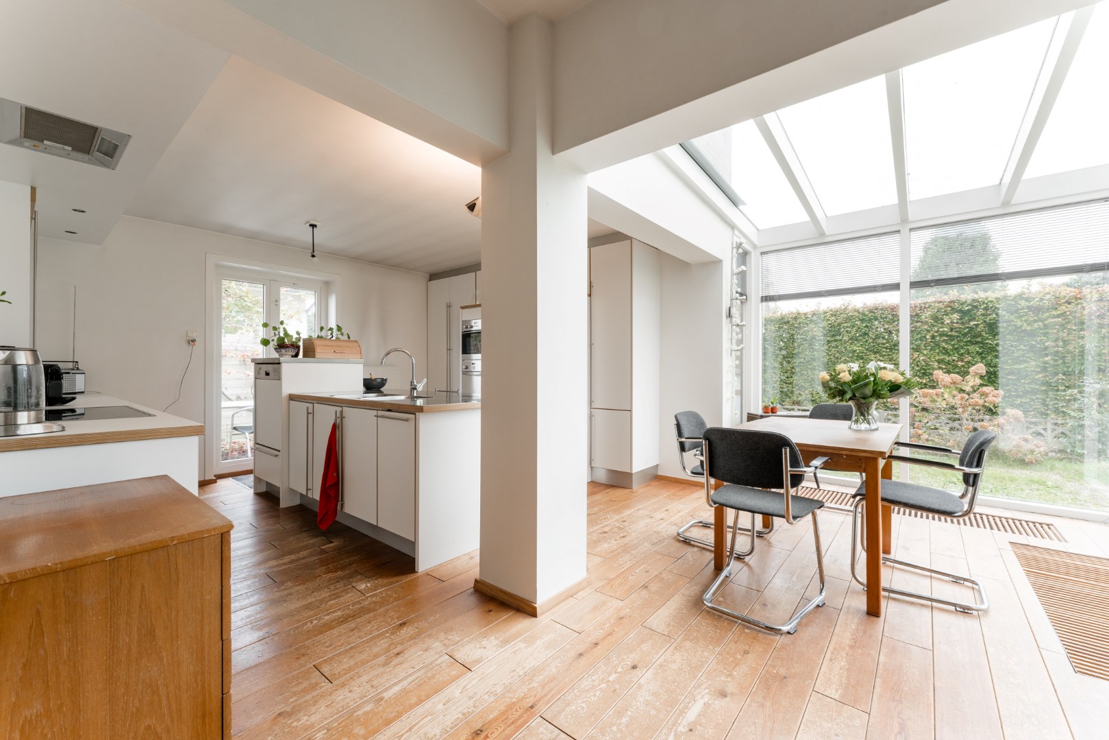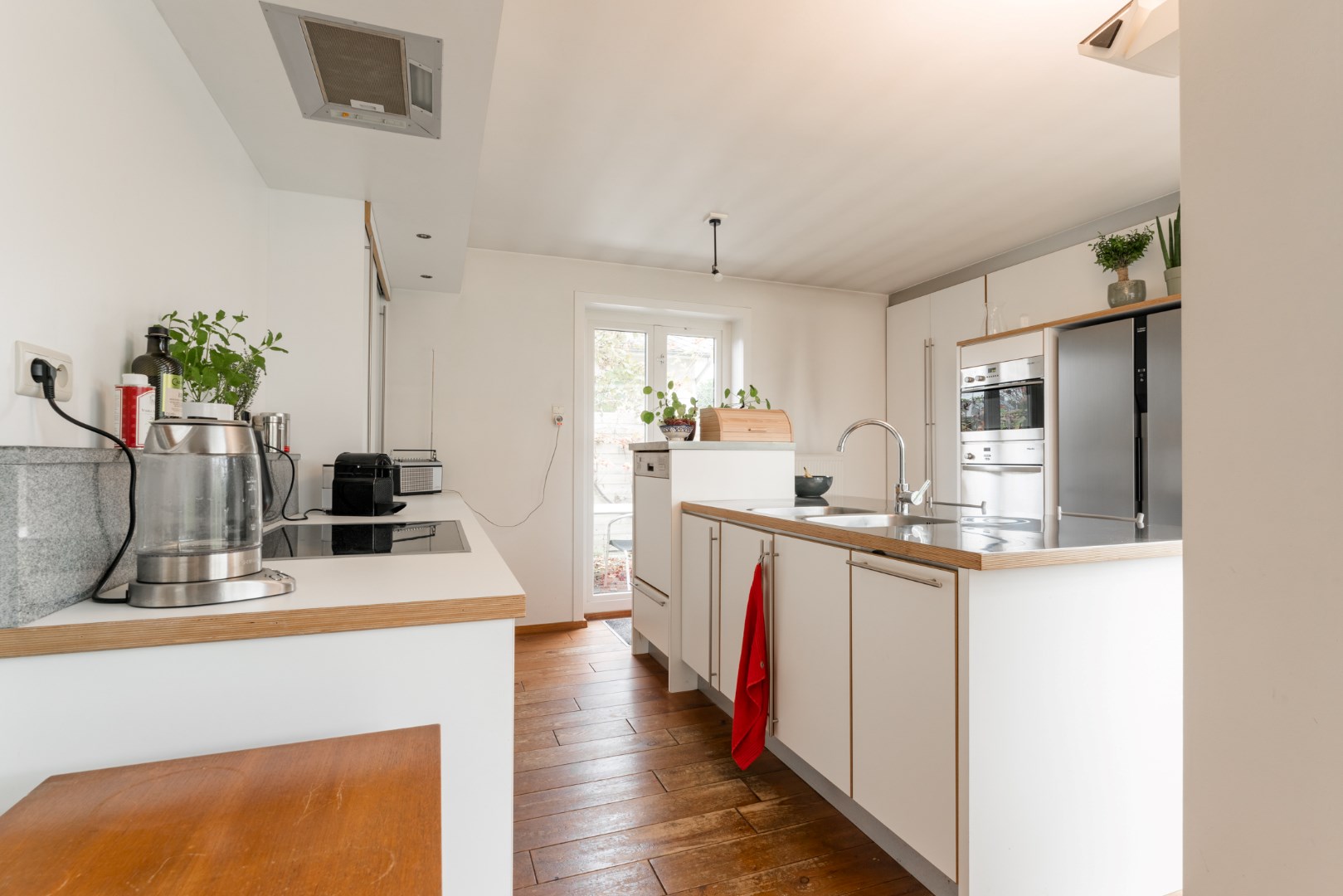 De ruimte grenst aan de keuken die voorzien is van een koelkast en diepvriezer, oven, stoomoven, twee spoelbakken, vaatwasser op hoogte en een keramisch vuur.
