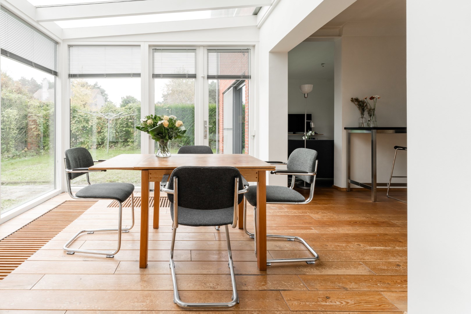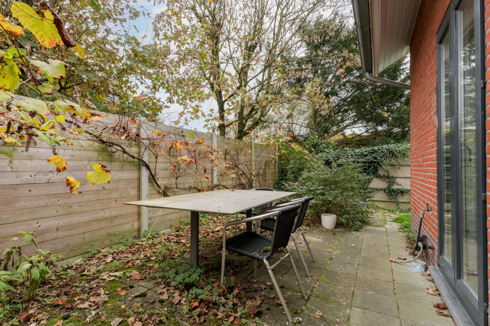 Buiten vinden we nog een aangenaam gedeelte tuin, gericht op het zuiden met een totale perceeloppervlakte van 4a75ca. De woning wordt verwarmd op gas en er zijn rolluiken voorzien en vliegenramen.