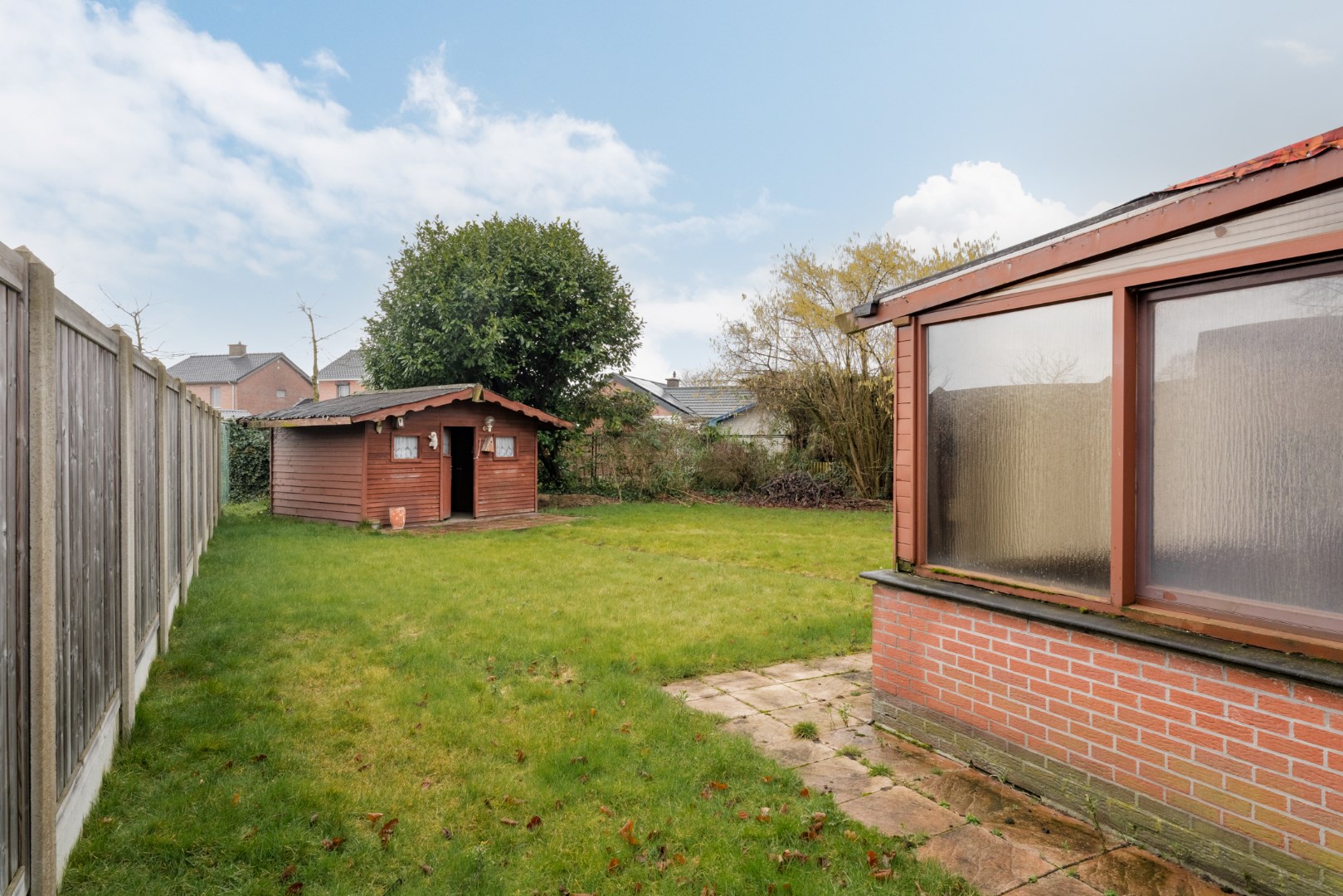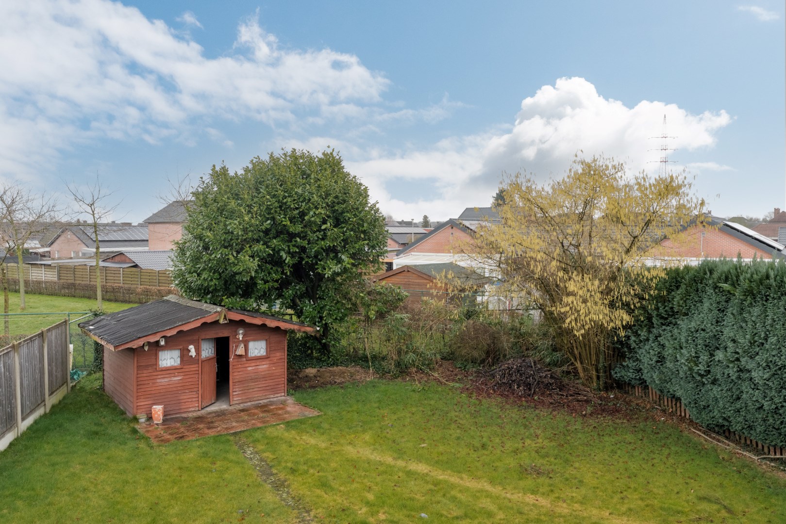 De tuin is goed aangelegd met een inrit, gras en groene beplanting. Verder vinden we ook nog een tuinhuisje om gereedschap te stockeren.