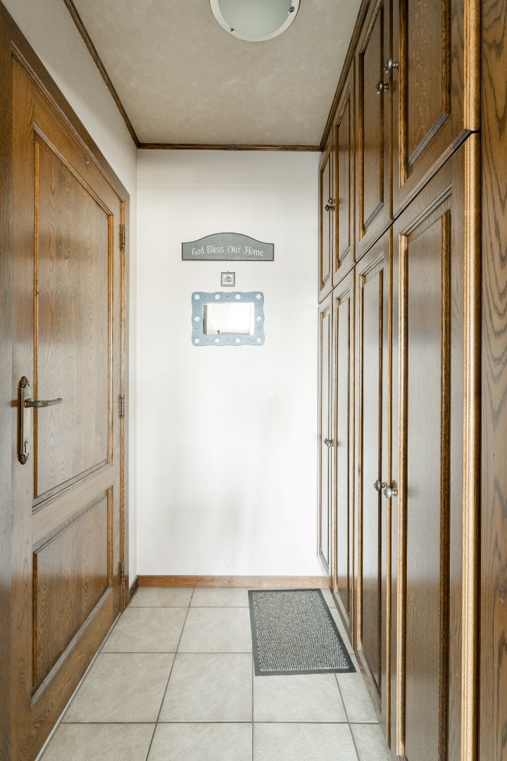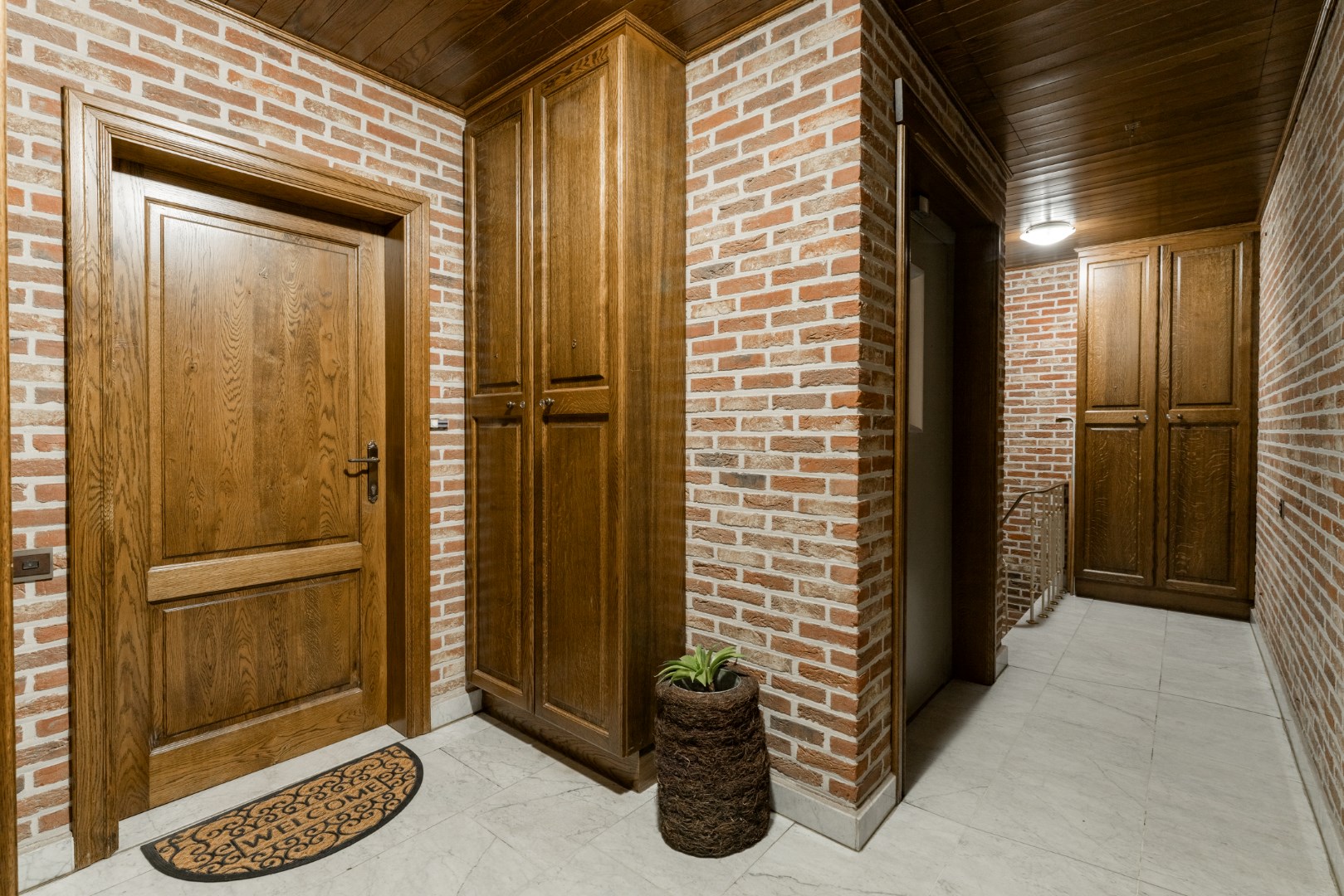 Eenmaal we de gemeenschappelijke hal betreden, merken we een ruime hal op. Wanneer we vervolgens het appartement binnen gaan, zien we een inkomhal met ingebouwde kasten die vervolgens grenst aan de leefruimte met open keuken. Verder is er nog een aparte berging om extra spullen te stockeren.
