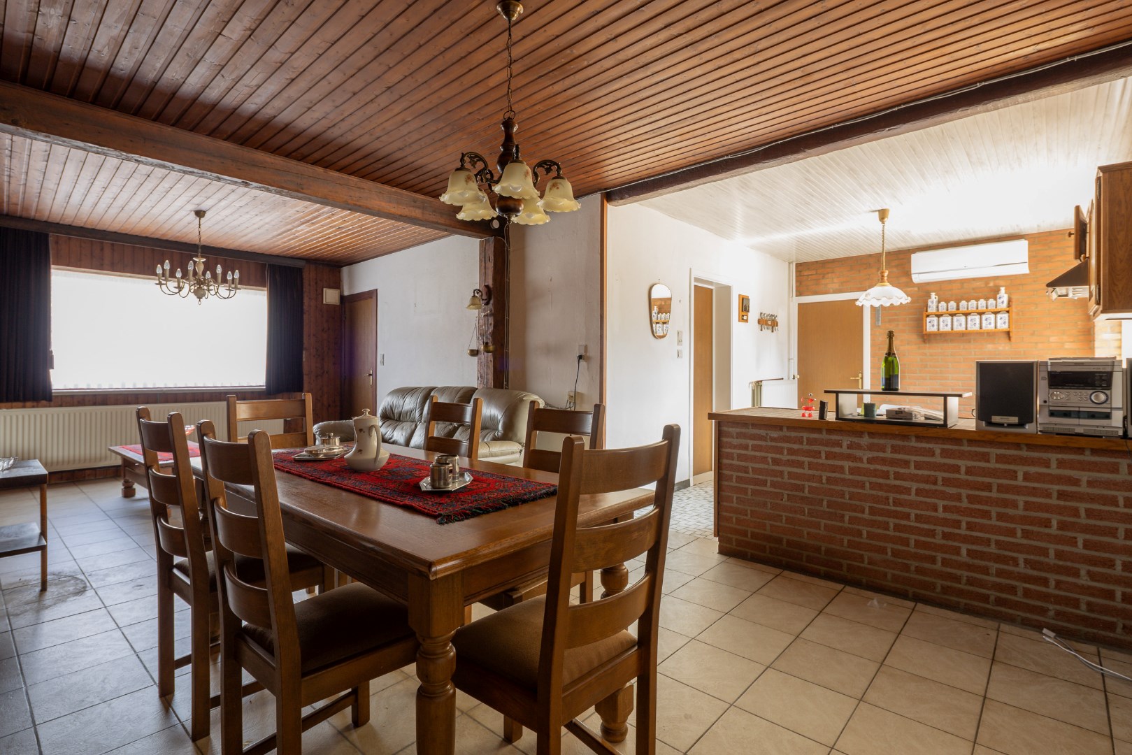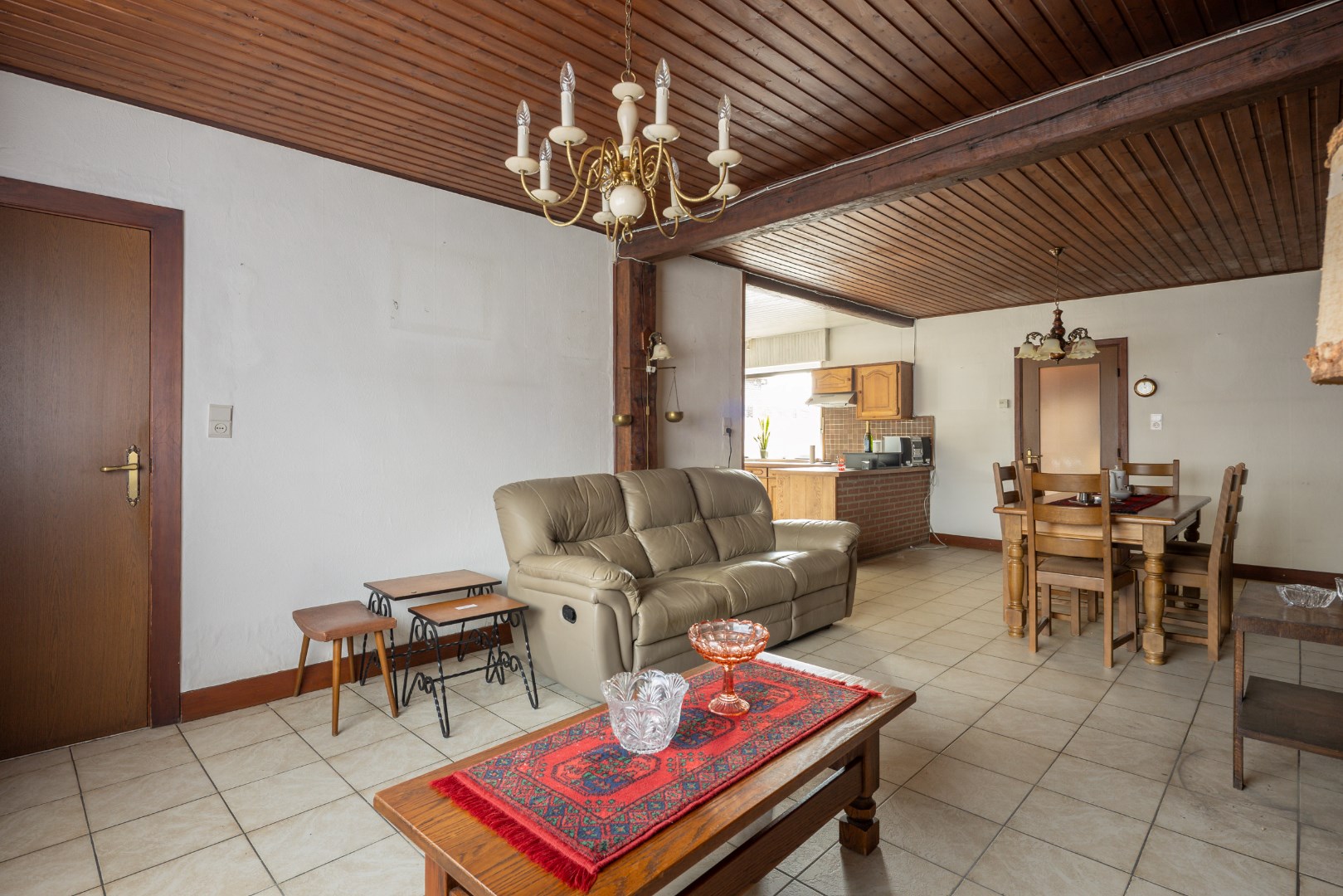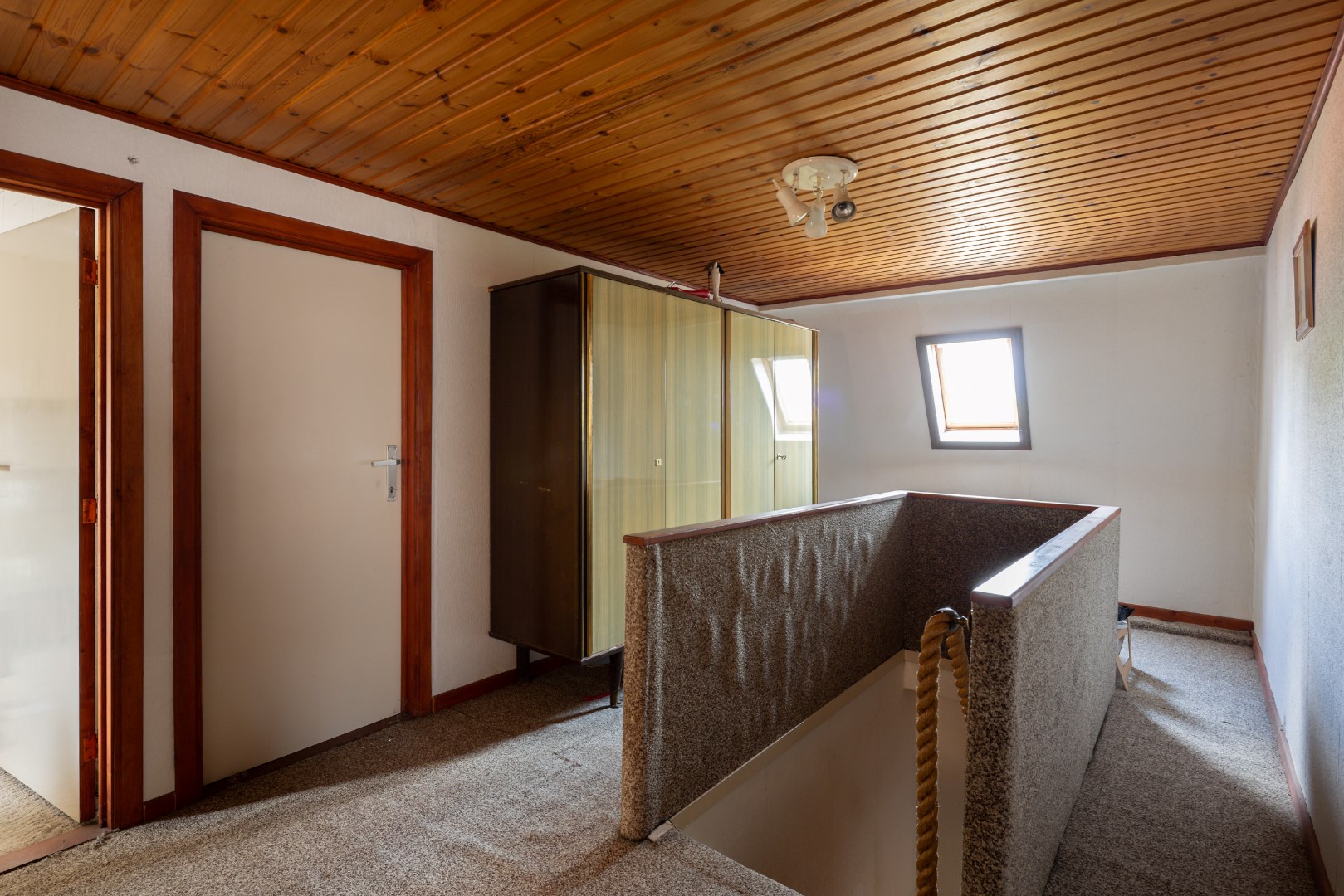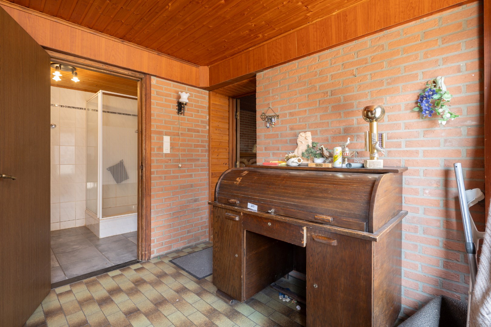 Via de inkomhal komen we in de open leefruimte met keuken. Deze geeft ons verder toegang tot de achterhal en badkamer, alsook toegang tot de burearuimte of slaapkamer. Verder kunnen we ook nog via de trap naar de voorraadkelder en is er een trap naar het verdiep. Boven bevinden zich opnieuw twee slaapkamers en een potentiële badkamer met toilet.