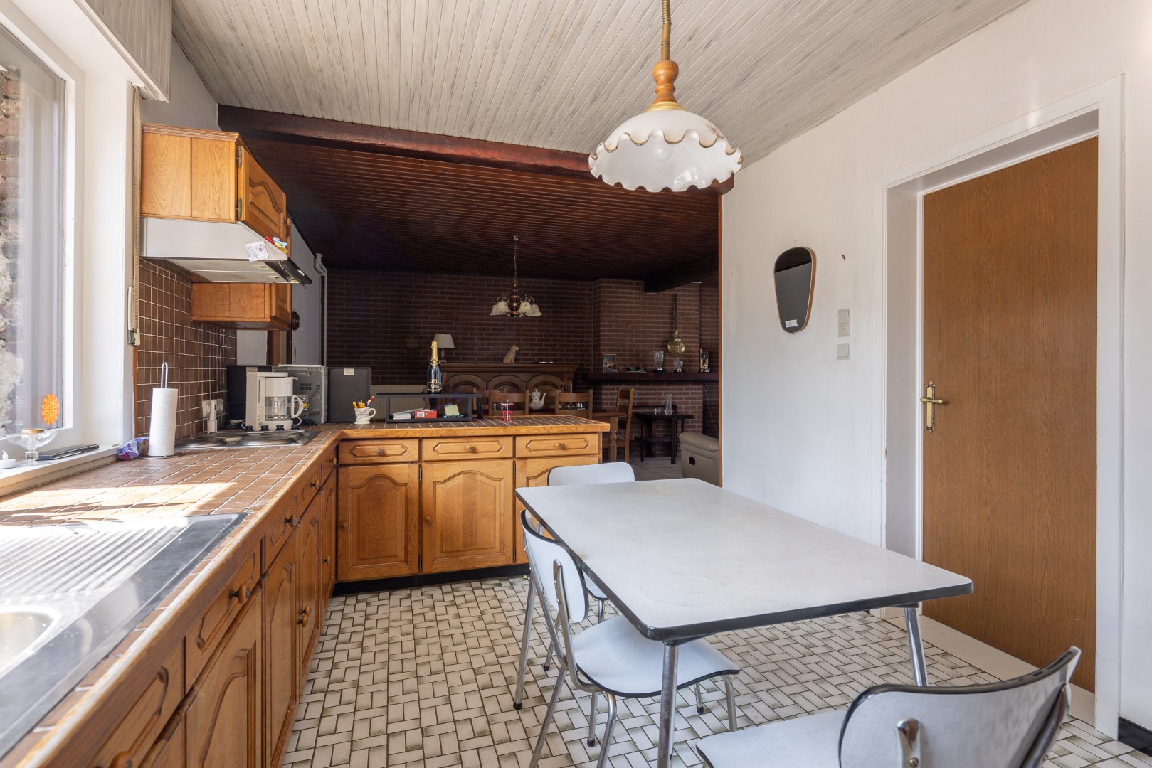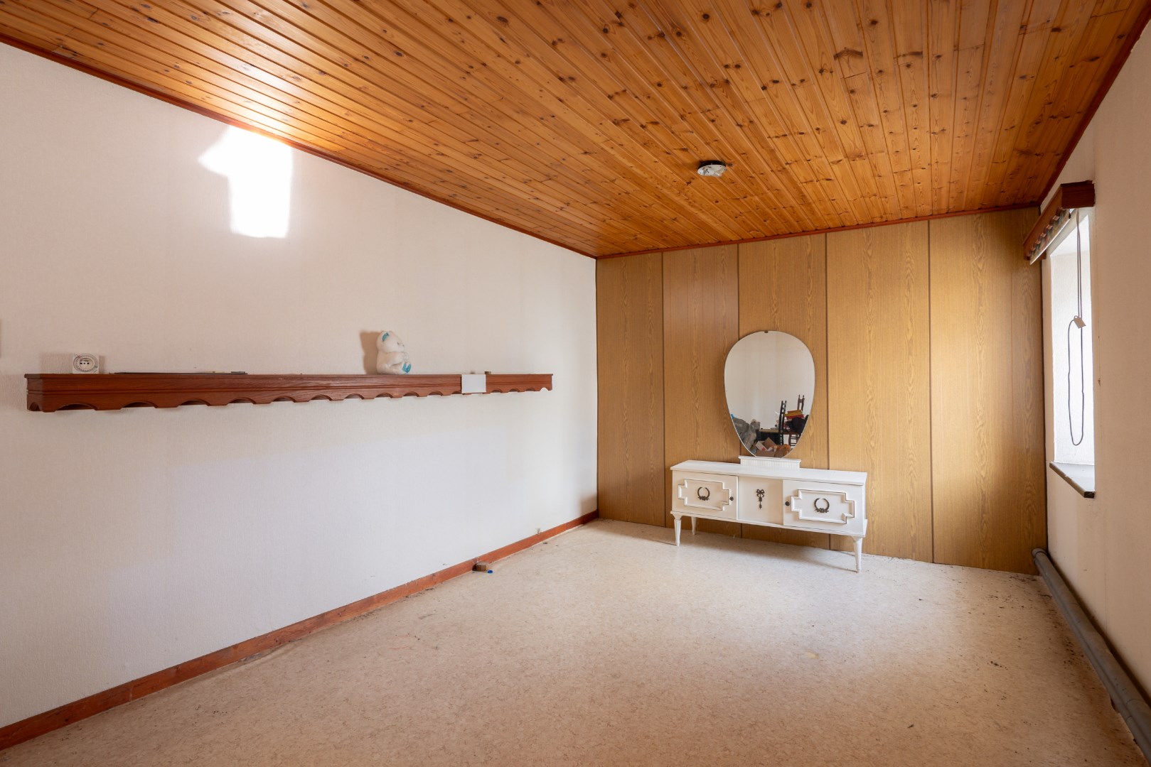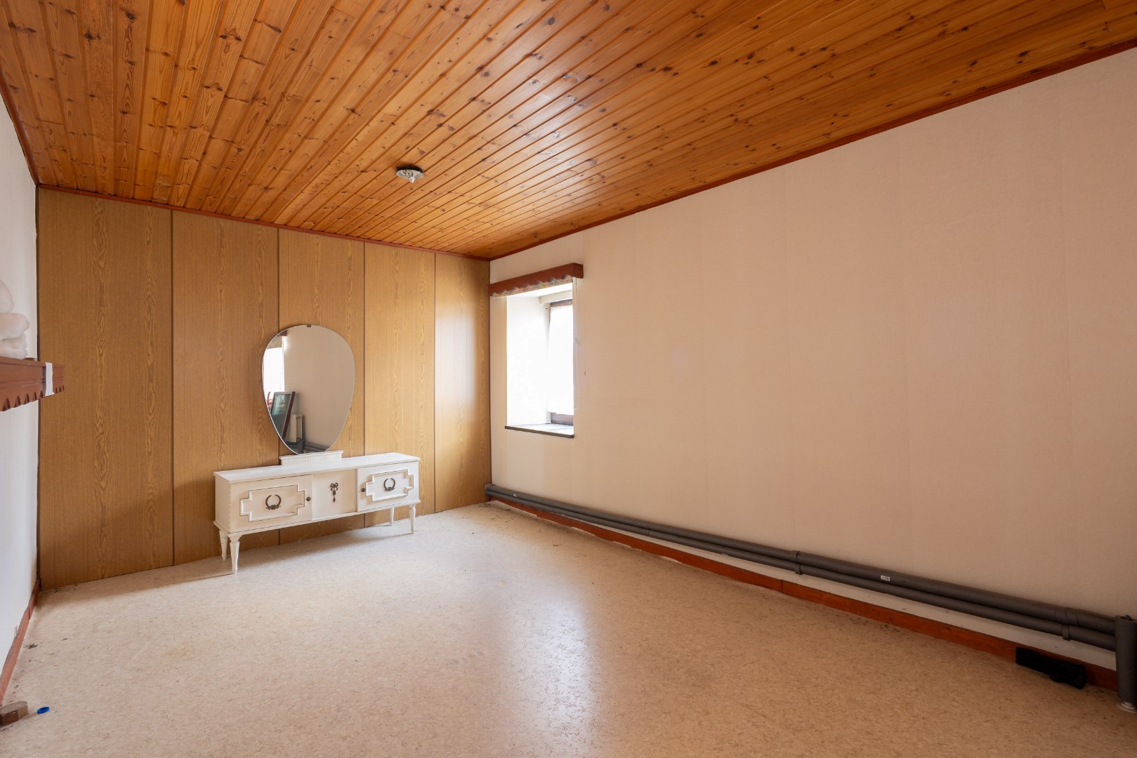Via de inkomhal komen we in de open leefruimte met keuken. Deze geeft ons verder toegang tot de achterhal en badkamer, alsook toegang tot de burearuimte of slaapkamer. Verder kunnen we ook nog via de trap naar de voorraadkelder en is er een trap naar het verdiep. Boven bevinden zich opnieuw twee slaapkamers en een potentiële badkamer met toilet.