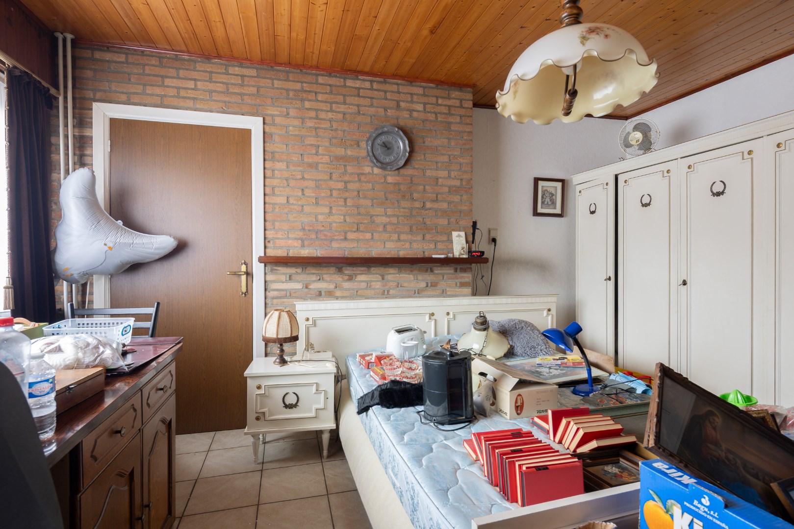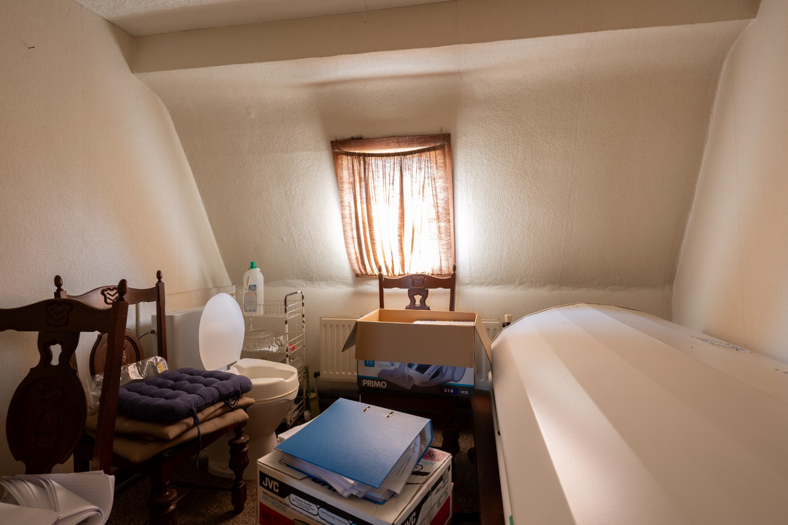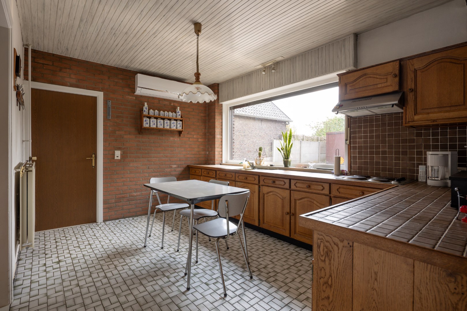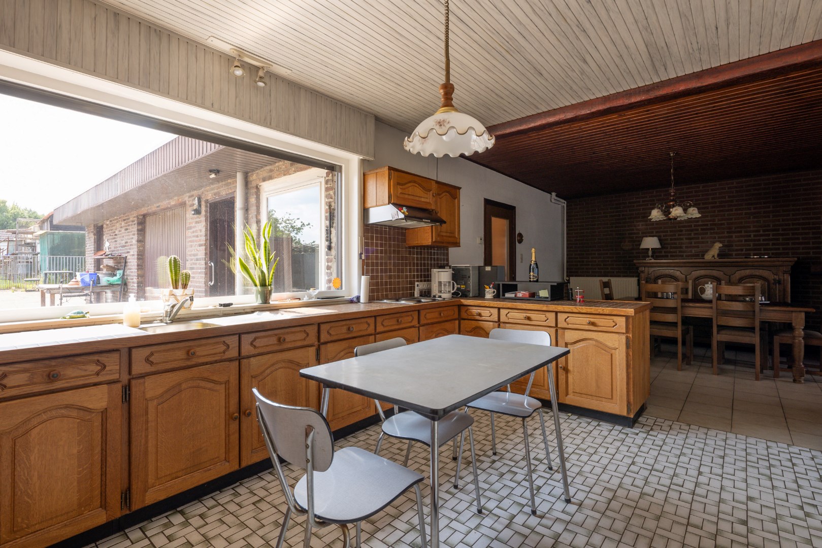Via de inkomhal komen we in de open leefruimte met keuken. Deze geeft ons verder toegang tot de achterhal en badkamer, alsook toegang tot de burearuimte of slaapkamer. Verder kunnen we ook nog via de trap naar de voorraadkelder en is er een trap naar het verdiep. Boven bevinden zich opnieuw twee slaapkamers en een potentiële badkamer met toilet.
