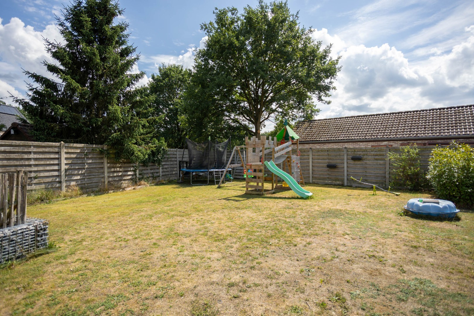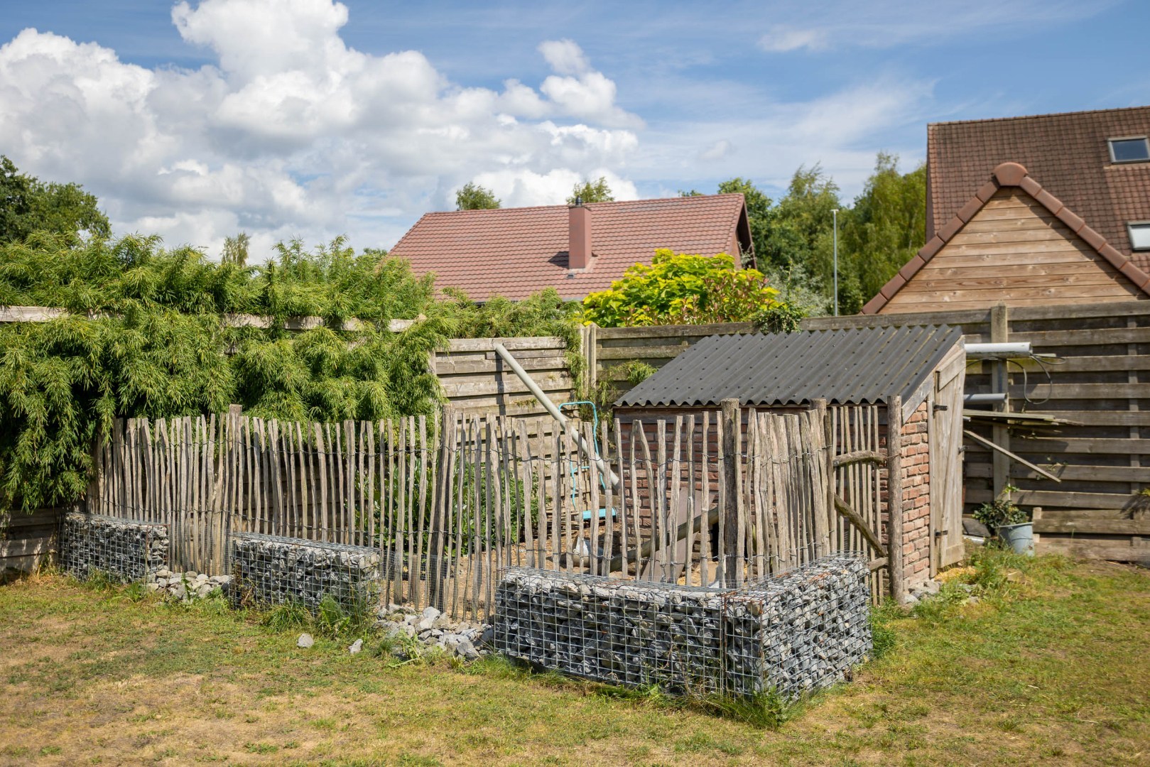 Buiten vinden we een mooie tuin met voldoende parkeergelegenheid, een stuk grasveld alsook de start om een terras te leggen.