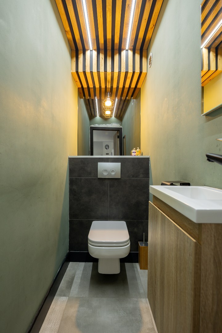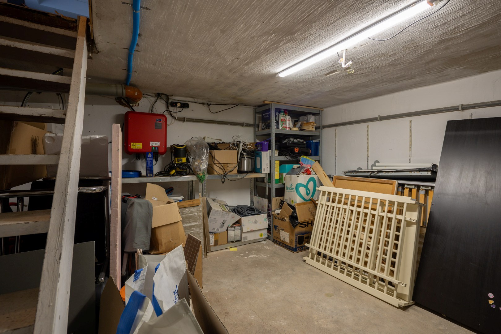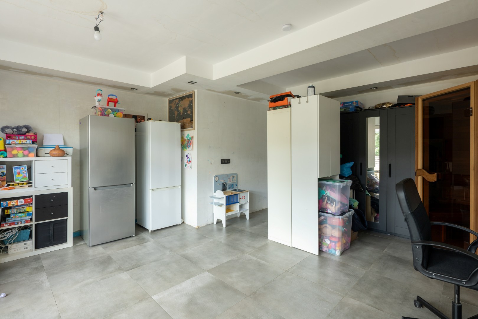 Vanuit de keuken is er toegang tot de kelder (zeer subtiel weggewerkt) en de achterhal. Hier vinden we vervolgens het aparte gastentoilet, de berging alsook nog een extra bureau/speel- of slaapkamer.