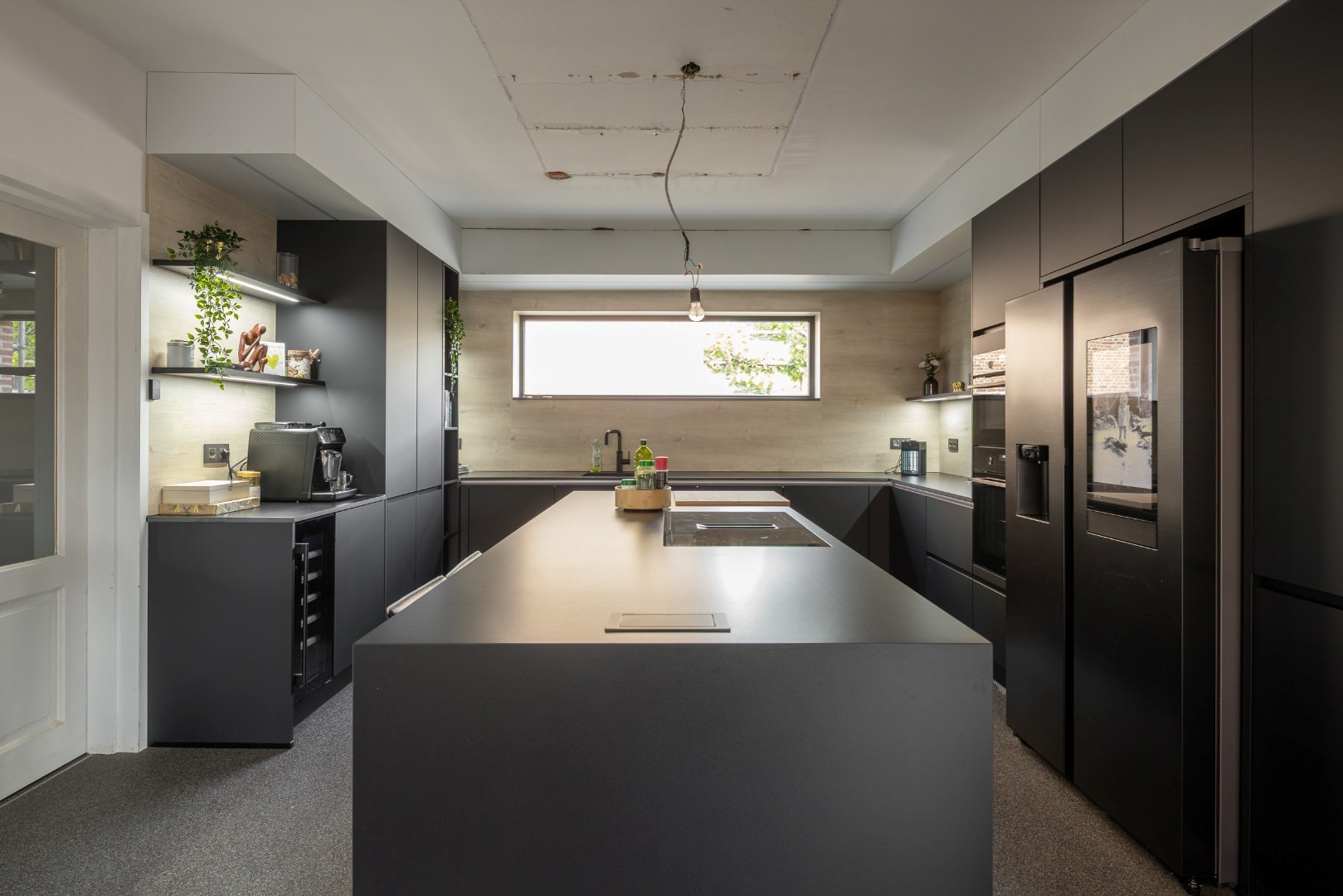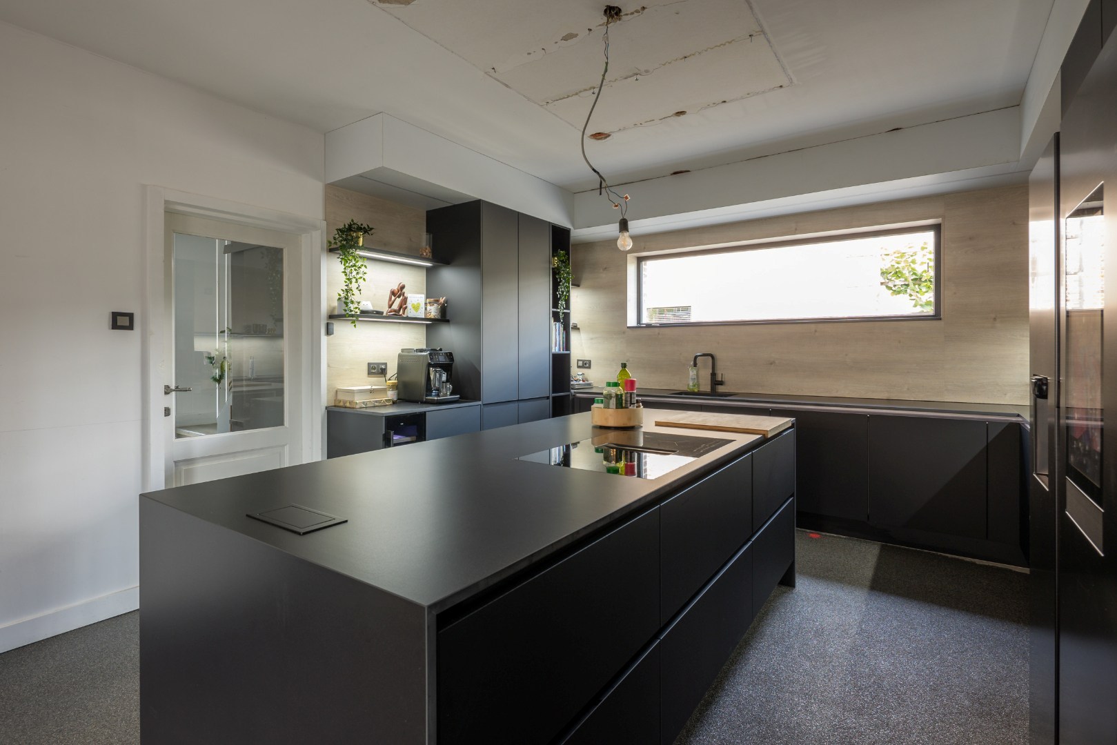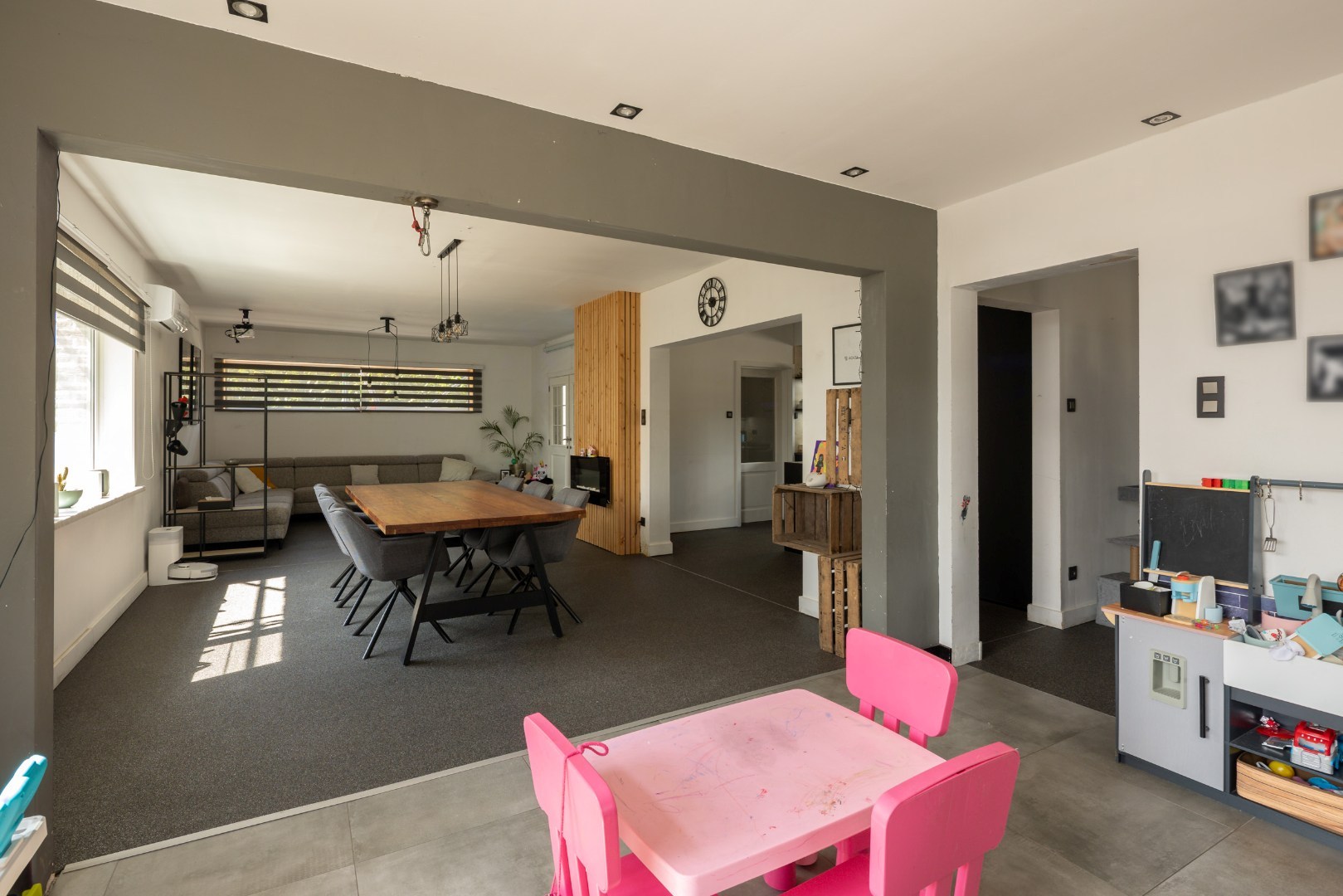 Via de ruime inkomhal is er toegang tot de bovenverdieping, alsook zijn er dubbel openslaande deuren die ons leiden naar de woonkamer. In de woonkamer merken we direct het open en lichtrijke gevoel. Hier is ruimschoots plaats voor een grote zithoek, eetkamer en speelhoek/bureau. Verder is er een open verbinding met een compleet nieuwe keuken ingericht met alle nodige toestellen (combi-oven, microgolf, Quooker kokend+bruisend water, vaatwasser, flexzone inductievuur met geïntegreerde afzuiging, koelkast, diepvries en wijnkoeler). Er is enorm veel opbergruimte voorzien en er is nog een leuk eiland om aan te zitten.