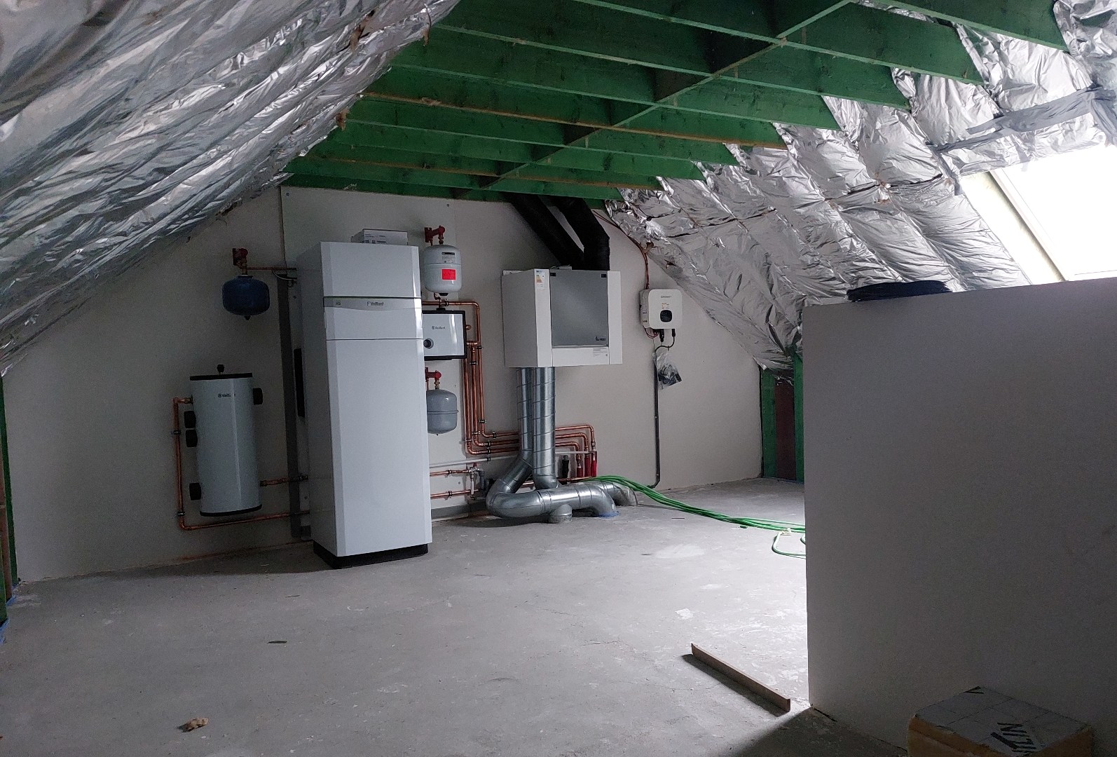 Verder is er ook een vaste trap voorzien naar de zolder, die nog ingericht kan worden naar eigen gebruik. Op zolder zijn alle technieken zichtbaar (warmtepomp, omvormer zonnepanelen, ventilatiesysteem).