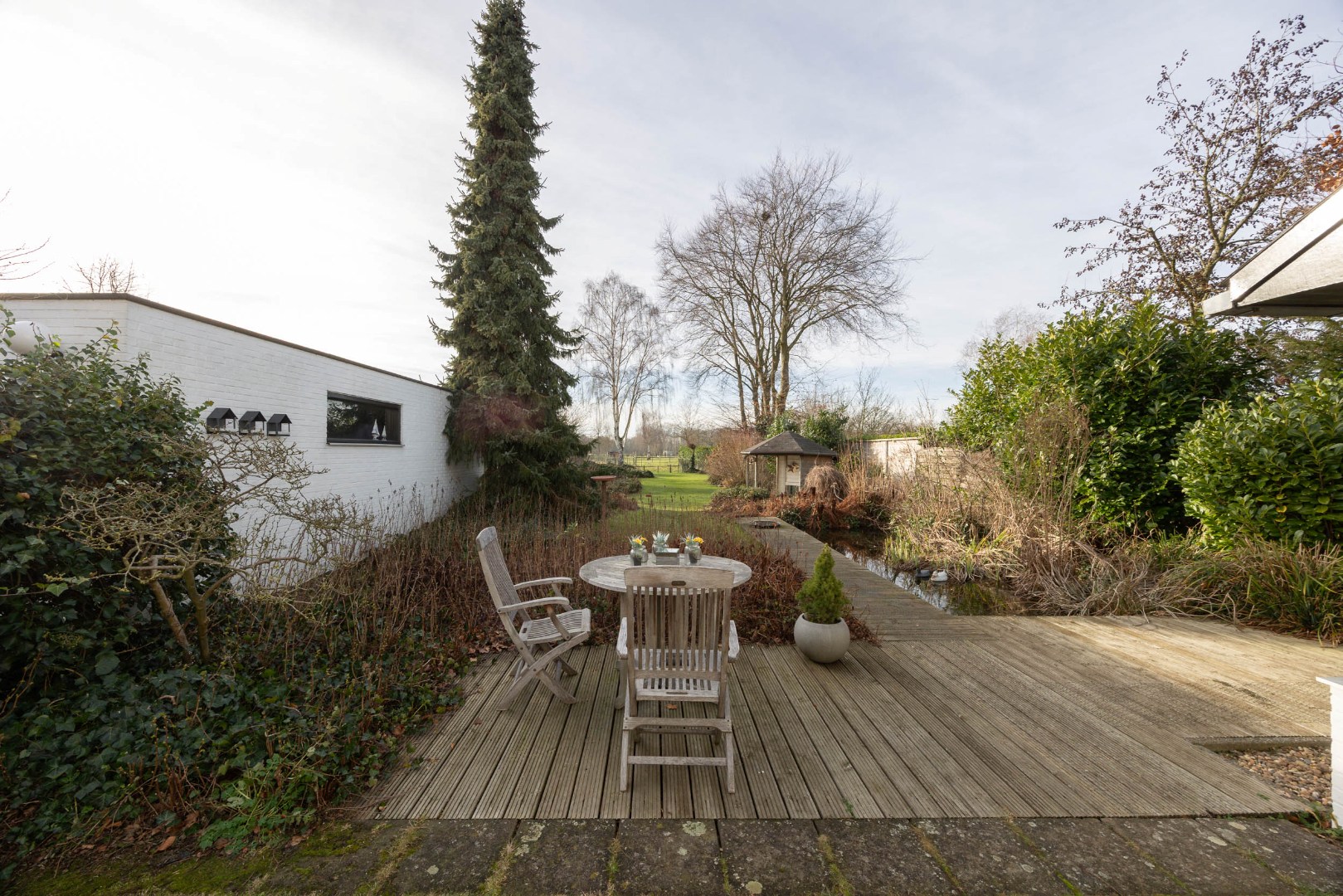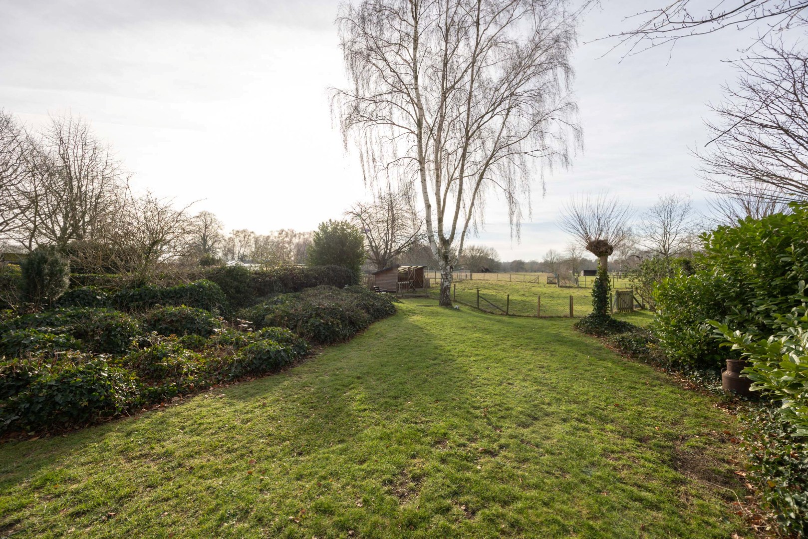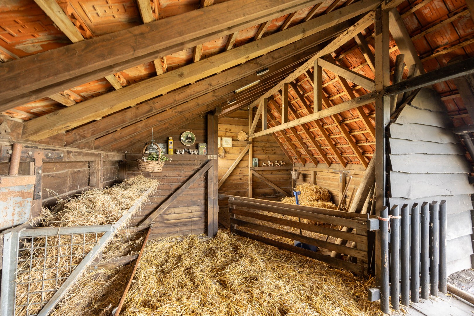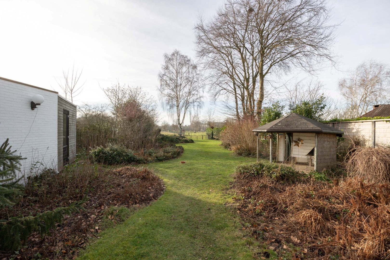 De ruime garage heeft een ruimte van +/- 60m², waar vlot twee auto's achter elkaar in kunnen en er nog werkruimte overblijft. Verder vinden we een prachtige tuin terug, die zeer verzorgd werd aangelegd met vijvertje. Ook is er een weide die netjes omheind werd, zijn er meerdere stalplaatsen die vandaag de dag functioneren voor de schapen. Uiteraard kan men dit aanpassen en gebruiken voor paarden. De weide is aanpalend en toegankelijk vanuit eigen eigendom.