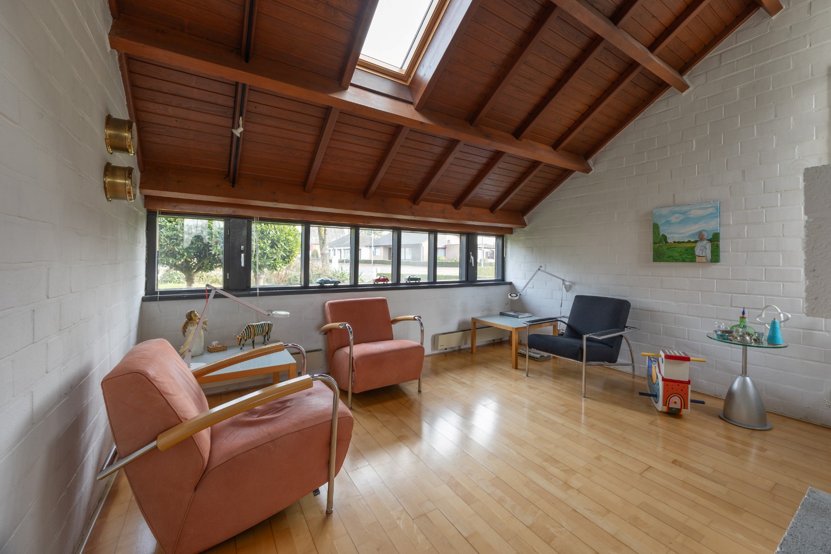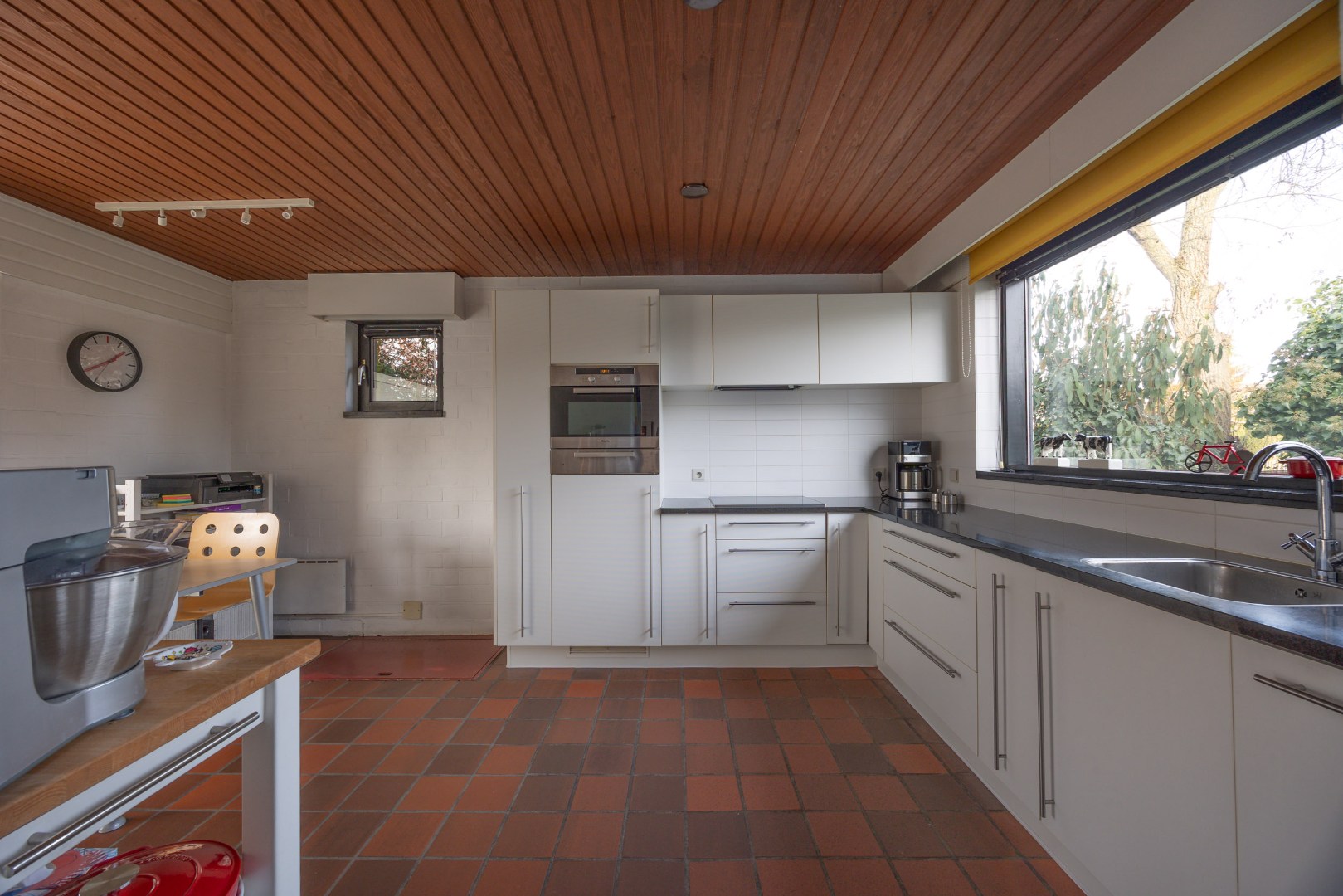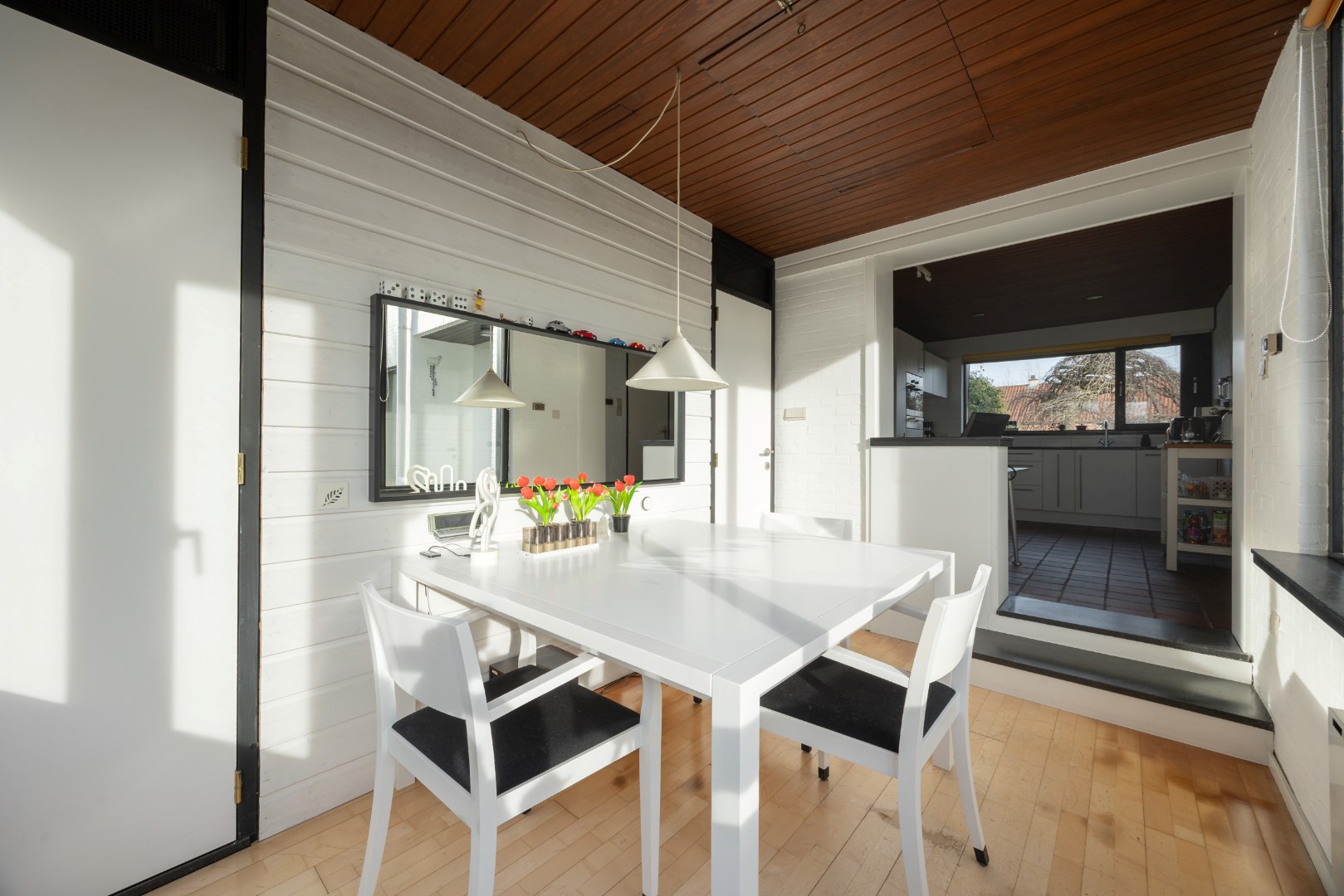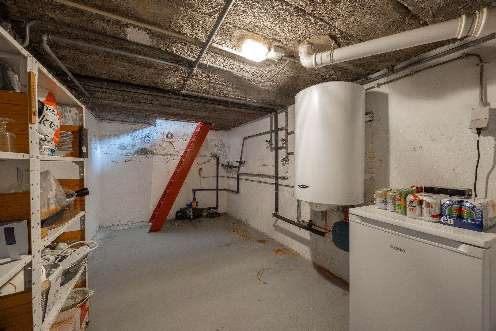 Naast de keuken bevindt zich de eetkamer. Deze is omgeven door veel glaspartijen, waardoor het voelt alsof u rustig in eigen tuin zit te genieten. Vanuit de keuken is er ook toegang tot de kelder (hier hangt de elektrische boiler van 2 jaar oud). Verder vinden we gelijkvloers nog een berging, apart toilet en een douchekamer.